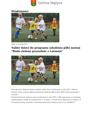 Wiadomości Środa, 11 września 2013 Nabór dzieci do programu szkolenia piłki nożnej "Biało-zielona przyszłość z Lotosem" Klub Sportowy Radunia Stężyca ogłasza nabór dzieci urodzonych w roku 2007 i 2008 do drużyny, która zostanie objęta programem szkolenia piłki nożnej "Biało-zielona przyszłość z Lotosem" Zainteresowanych rodziców dzieci urodzonych w roku 2007 i 2008 zapraszamy na spotkanie organizacyjne w środę 25 września 2013 r. na godz. 17.00 do Domu Sportowca w Stężycy. W razi pytań prosimy o kontakt z trenerem Ireneuszem Stenclem pod nr tel. 604080517.