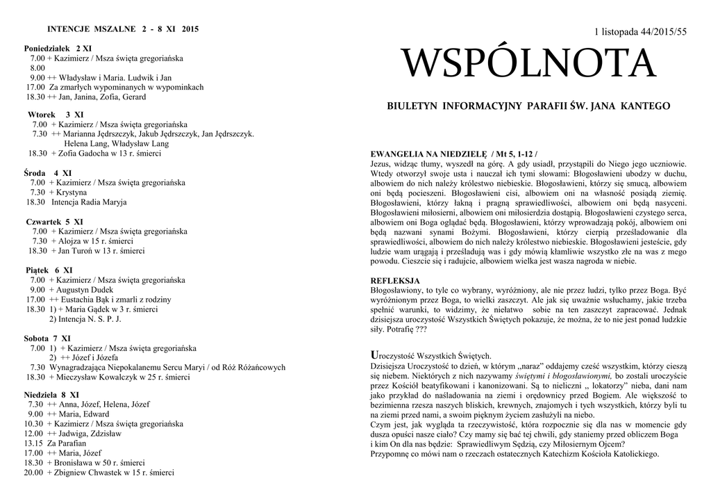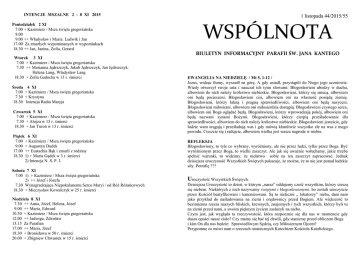 INTENCJE MSZALNE 2 - 8 XI 2015 Poniedziałek 2 XI 7.00 + Kazimierz / Msza święta gregoriańska 8.00 9.00 ++ Władysław i Maria. Ludwik i Jan 17.00 Za zmarłych wypominanych w wypominkach 18.30 ++ Jan, Janina, Zofia, Gerard Wtorek 3 XI 7.00 + Kazimierz / Msza święta gregoriańska 7.30 ++ Marianna Jędrszczyk, Jakub Jędrszczyk, Jan Jędrszczyk. Helena Lang, Władysław Lang 18.30 + Zofia Gadocha w 13 r. śmierci Środa 4 XI 7.00 + Kazimierz / Msza święta gregoriańska 7.30 + Krystyna 18.30 Intencja Radia Maryja Czwartek 5 XI 7.00 + Kazimierz / Msza święta gregoriańska 7.30 + Alojza w 15 r. śmierci 18.30 + Jan Turoń w 13 r. śmierci Piątek 6 XI 7.00 + Kazimierz / Msza święta gregoriańska 9.00 + Augustyn Dudek 17.00 ++ Eustachia Bąk i zmarli z rodziny 18.30 1) + Maria Gądek w 3 r. śmierci 2) Intencja N. S. P. J. Sobota 7 XI 7.00 1) + Kazimierz / Msza święta gregoriańska 2) ++ Józef i Józefa 7.30 Wynagradzająca Niepokalanemu Sercu Maryi / od Róż Różańcowych 18.30 + Mieczysław Kowalczyk w 25 r. śmierci Niedziela 8 XI 7.30 ++ Anna, Józef, Helena, Józef 9.00 ++ Maria, Edward 10.30 + Kazimierz / Msza święta gregoriańska 12.00 ++ Jadwiga, Zdzisław 13.15 Za Parafian 17.00 ++ Maria, Józef 18.30 + Bronisława w 50 r. śmierci 20.00 + Zbigniew Chwastek w 15 r. śmierci 1 listopada 44/2015/55 WSPÓLNOTA BIULETYN INFORMACYJNY PARAFII ŚW. JANA KANTEGO EWANGELIA NA NIEDZIELĘ / Mt 5, 1-12 / Jezus, widząc tłumy, wyszedł na górę. A gdy usiadł, przystąpili do Niego jego uczniowie. Wtedy otworzył swoje usta i nauczał ich tymi słowami: Błogosławieni ubodzy w duchu, albowiem do nich należy królestwo niebieskie. Błogosławieni, którzy się smucą, albowiem oni będą pocieszeni. Błogosławieni cisi, albowiem oni na własność posiądą ziemię. Błogosławieni, którzy łakną i pragną sprawiedliwości, albowiem oni będą nasyceni. Błogosławieni miłosierni, albowiem oni miłosierdzia dostąpią. Błogosławieni czystego serca, albowiem oni Boga oglądać będą. Błogosławieni, którzy wprowadzają pokój, albowiem oni będą nazwani synami Bożymi. Błogosławieni, którzy cierpią prześladowanie dla sprawiedliwości, albowiem do nich należy królestwo niebieskie. Błogosławieni jesteście, gdy ludzie wam urągają i prześladują was i gdy mówią kłamliwie wszystko złe na was z mego powodu. Cieszcie się i radujcie, albowiem wielka jest wasza nagroda w niebie. REFLEKSJA Błogosławiony, to tyle co wybrany, wyróżniony, ale nie przez ludzi, tylko przez Boga. Być wyróżnionym przez Boga, to wielki zaszczyt. Ale jak się uważnie wsłuchamy, jakie trzeba spełnić warunki, to widzimy, że niełatwo sobie na ten zaszczyt zapracować. Jednak dzisiejsza uroczystość Wszystkich Świętych pokazuje, że można, że to nie jest ponad ludzkie siły. Potrafię ??? Uroczystość Wszystkich Świętych. Dzisiejsza Uroczystość to dzień, w którym ,,naraz” oddajemy cześć wszystkim, którzy cieszą się niebem. Niektórych z nich nazywamy świętymi i błogosławionymi, bo zostali uroczyście przez Kościół beatyfikowani i kanonizowani. Są to nieliczni ,, lokatorzy” nieba, dani nam jako przykład do naśladowania na ziemi i orędownicy przed Bogiem. Ale większość to bezimienna rzesza naszych bliskich, krewnych, znajomych i tych wszystkich, którzy byli tu na ziemi przed nami, a swoim pięknym życiem zasłużyli na niebo. Czym jest, jak wygląda ta rzeczywistość, która rozpocznie się dla nas w momencie gdy dusza opuści nasze ciało? Czy mamy się bać tej chwili, gdy staniemy przed obliczem Boga i kim On dla nas będzie: Sprawiedliwym Sędzią, czy Miłosiernym Ojcem? Przypomnę co mówi nam o rzeczach ostatecznych Katechizm Kościoła Katolickiego. Niebo – ci, którzy umierają w łasce i przyjaźni z Bogiem oraz są doskonale oczyszczeni, żyją na zawsze z Chrystusem. Są na zawsze podobni do Boga, ponieważ widzą Go ,,takim jakim jest”, twarzą w twarz. … powagą apostolską orzekamy, że według powszechnego rozporządzenia Bożego, dusze wszystkich świętych …i innych wiernych zmarłych po przyjęciu chrztu świętego, jeśli w chwili śmierci nie miały nic do odpokutowania … albo jeśliby wówczas miały w sobie coś do oczyszczenia, lecz doznały oczyszczenia po śmierci… jeszcze przed odzyskaniem swoich ciał i przed Sądem Ostatecznym , od chwili Wniebowstąpienia Zbawiciela, naszego Pana Jezusa Chrystusa, były, są i będą w niebie. Jezus ,,otworzył” nam niebo przez Śmierć i Zmartwychwstanie. Życie błogosławionych polega na posiadaniu w pełni owoców odkupienia dokonanego przez Chrystusa, który włącza do swej niebieskiej chwały tych, którzy uwierzyli w Niego i pozostali wierni Jego woli. Niebo jest szczęśliwą wspólnotą tych wszystkich, którzy są doskonale zjednoczeni z Chrystusem. Czyściec – jest stanem tych, którzy umierają w przyjaźni z Bogiem. Chociaż są pewni wiecznego zbawienia, to potrzebują jeszcze oczyszczenia, aby wejść do nieba. Piekło – oznacza wieczne potępienie tych, którzy umierają dobrowolnie w stanie grzechu ciężkiego. Zasadnicza kara piekła polega na wiecznym oddzieleniu od Boga. A jedynie w Bogu człowiek może osiągnąć szczęście i radość. Pismo Święte – Nowy Testament. Czego Ewangelie uczą nas o śmierci i przeznaczeniu człowieka? Nowy Testament akcentuje Zmartwychwstanie Pana Jezusa. Pierwsi chrześcijanie, którzy często umierali śmiercią męczeńską, pokazali, że nie boją się śmierci. Wierzyli, że jej moc została złamana przez Chrystusa; nie bójcie się tych, którzy zabijają ciało. Duszy zabić nie mogą. Bójcie się raczej tego, który duszę i ciało może zatracić w piekle. Ewangelia daje również wielką nadzieję na wieczność;… w domu Ojca mego jest mieszkań wiele. Gdyby tak nie było, to bym wam powiedział. Odpusty za zmarłych. Odpust jest to darowanie przed Bogiem kary doczesnej, za grzechy zgładzon