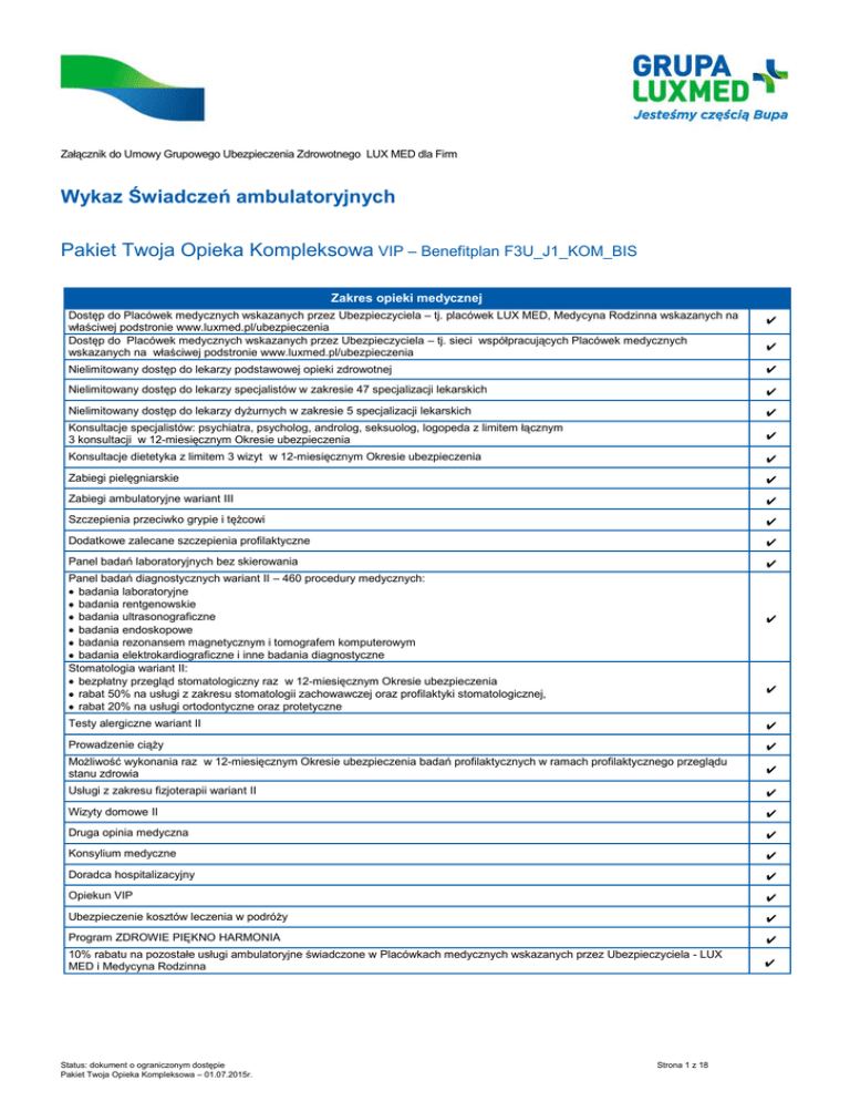 Załącznik do Umowy Grupowego Ubezpieczenia Zdrowotnego LUX MED dla Firm Wykaz Świadczeń ambulatoryjnych Pakiet Twoja Opieka Kompleksowa VIP – Benefitplan F3U_J1_KOM_BIS Zakres opieki medycznej Dostęp do Placówek medycznych wskazanych przez Ubezpieczyciela – tj. placówek LUX MED, Medycyna Rodzinna wskazanych na właściwej podstronie www.luxmed.pl/ubezpieczenia Dostęp do Placówek medycznych wskazanych przez Ubezpieczyciela – tj. sieci współpracujących Placówek medycznych wskazanych na właściwej podstronie www.luxmed.pl/ubezpieczenia ✔ ✔ Nielimitowany dostęp do lekarzy podstawowej opieki zdrowotnej ✔ Nielimitowany dostęp do lekarzy specjalistów w zakresie 47 specjalizacji lekarskich ✔ Nielimitowany dostęp do lekarzy dyżurnych w zakresie 5 specjalizacji lekarskich ✔ Konsultacje specjalistów: psychiatra, psycholog, androlog, seksuolog, logopeda z limitem łącznym 3 konsultacji w 12-miesięcznym Okresie ubezpieczenia ✔ Konsultacje dietetyka z limitem 3 wizyt w 12-miesięcznym Okresie ubezpieczenia ✔ Zabiegi pielęgniarskie ✔ Zabiegi ambulatoryjne wariant III ✔ Szczepienia przeciwko grypie i tężcowi ✔ Dodatkowe zalecane szczepienia profilaktyczne ✔ Panel badań laboratoryjnych bez skierowania ✔ Panel badań diagnostycznych wariant II – 460 procedury medycznych: badania laboratoryjne badania rentgenowskie badania ultrasonograficzne badania endoskopowe badania rezonansem magnetycznym i tomografem komputerowym badania elektrokardiograficzne i inne badania diagnostyczne Stomatologia wariant II: bezpłatny przegląd stomatologiczny raz w 12-miesięcznym Okresie ubezpieczenia rabat 50% na usługi z zakresu stomatologii zachowawczej oraz profilaktyki stomatologicznej, rabat 20% na usługi ortodontyczne oraz protetyczne ✔ ✔ Testy alergiczne wariant II ✔ Prowadzenie ciąży ✔ Możliwość wykonania raz w 12-miesięcznym Okresie ubezpieczenia badań profilaktycznych w ramach profilaktycznego przeglądu stanu zdrowia ✔ Usługi z zakresu fizjoterapii wariant II ✔ Wizyty domowe II ✔ Druga opinia medyczna ✔ Konsylium medyczne ✔ Doradca hospitalizacyjny ✔ Opiekun VIP ✔ Ubezpieczenie kosztów leczenia w podróży ✔ Program ZDROWIE PIĘKNO HARMONIA ✔ 10% rabatu na pozostałe usługi ambulatoryjne świadczone w Placówkach medycznych wskazanych przez Ubezpieczyciela - LUX MED i Medycyna Rodzinna ✔ Status: dokument o ograniczonym dostępie Pakiet Twoja Opieka Kompleksowa – 01.07.2015r. Strona 1 z 18 Szczegółowe definicje usług Konsultacje specjalistów wariant podstawowy Usługa obejmuje nielimitowane wizyty w Placówkach medycznych wskazanych przez Ubezpieczyciela, w sytuacjach: chorobowych oraz pomocy w nagłych zachorowaniach. Usługa zawiera: wywiad, poradę Lekarza wraz z czynnościami podstawowymi niezbędnymi do postawienia diagnozy, podjęcia decyzji terapeutycznej oraz monitorowania leczenia i dotyczy konsultacji w następującym zakresie: interny pediatrii Lekarza medycyny rodzinnej Uwaga: Usługa Konsultacje specjalistów wariant podstawowy nie obejmuje: konsultacji Lekarzy dyżurnych, konsultacji Lekarzy ze stopniem doktora habilitowanego lub tytułem naukowym profesora, jak również Lekarzy będących na stanowisku: docenta, profesora nadzwyczajnego i profesora zwyczajnego. Konsultacje specjalistów wariant III Usługa obejmuje nielimitowany dostęp do konsultacji Lekarzy w Placówkach medycznych wskazanych przez Ubezpieczyciela, w sytuacjach chorobowych, pomocy w nagłych zachorowaniach oraz poradnictwa ogólnomedycznego. Konsultacje specjalistyczne obejmują: wywiad, poradę lekarza specjalisty wraz z czynnościami podstawowymi niezbędnymi do postawienia diagnozy, podjęcia właściwej decyzji terapeutycznej oraz monitorowania leczenia. W przypadku: Ubezpieczonych powyżej 18 r.ż. – wizyty bez skierowania dotyczą konsultacji w następującym zakresie: alergologii ginekologii endokrynologicznej chirurgii ogólnej hematologii dermatologii kardiologii diabetologii laryngologii endokrynologii nefrologii gastroenterologii neurologii ginekologii okulistyki Ubezpieczonych do 18 r.ż. – wizyty bez skierowania dotyczą konsultacji w następującym zakresie: chirurgii neurologii dermatologii okulistyki ginekologii (od 16 r.ż.) ortopedii onkologii ortopedii proktologii pulmonologii reumatologii urologii laryngologii Ubezpieczonych powyżej 18 r.ż.– wizyty wymagają skierowania od Lekarza Placówki medycznej wskazanej przez Ubezpieczyciela i dotyczą konsultacji w następującym zakresie: chirurgii naczyniowej hepatologii rehabilitacji medycznej chirurgii onkologicznej immunologii chorób zakaźnych neurochirurgii Ubezpieczonych do 18 r.ż. – wizyty wymagają skierowania od Lekarza Placówki medycznej wskazanej przez Ubezpieczyciela i dotyczą konsultacji w następującym zakresie: alergologii hematologii rehabilitacji medycznej diabetologii kardiologii reumatologii endokrynologii nefrologii urologii gastroenterologii onkologii ginekologii (do 16 r.ż.) pulmonologii Uwaga: Usługa Konsultacje specjalistów wariant III nie obejmuje: konsultacji Lekarzy dyżurnych, konsultacji Lekarzy ze stopniem doktora habilitowanego lub tytułem naukowym profesora, jak również Lekarzy będących na stanowisku: docenta, profesora nadzwyczajnego i profesora zwyczajnego. Również pozostałe konsultacje są odpłatne. Konsultacje lekarzy dyżurnych wariant II Usługa obejmuje wyłącznie pomoc doraźną, podstawową w nagłym zachorowaniu lub w urazach wymagających wstępnego zaopatrzenia, które wystąpiły w ciągu 24 h od momentu przyjęcia zgłoszenia chęci odbycia konsultacji przez Operatora. Lekarze dyżurni są dostępni w godzinach pracy Placówek medycznych wskazanych przez Ubezpieczyciela, wyłącznie w dniu jej zgłoszenia. Usługa nie obejmuje świadczeń zdrowotnych udzielanych w celu ratowania życia i zdrowia zgodnie z Ustawą o Państwowym Ratownictwie Medycznym (Dz. U. 2006.191.1410 ze zm.). Status: dokume