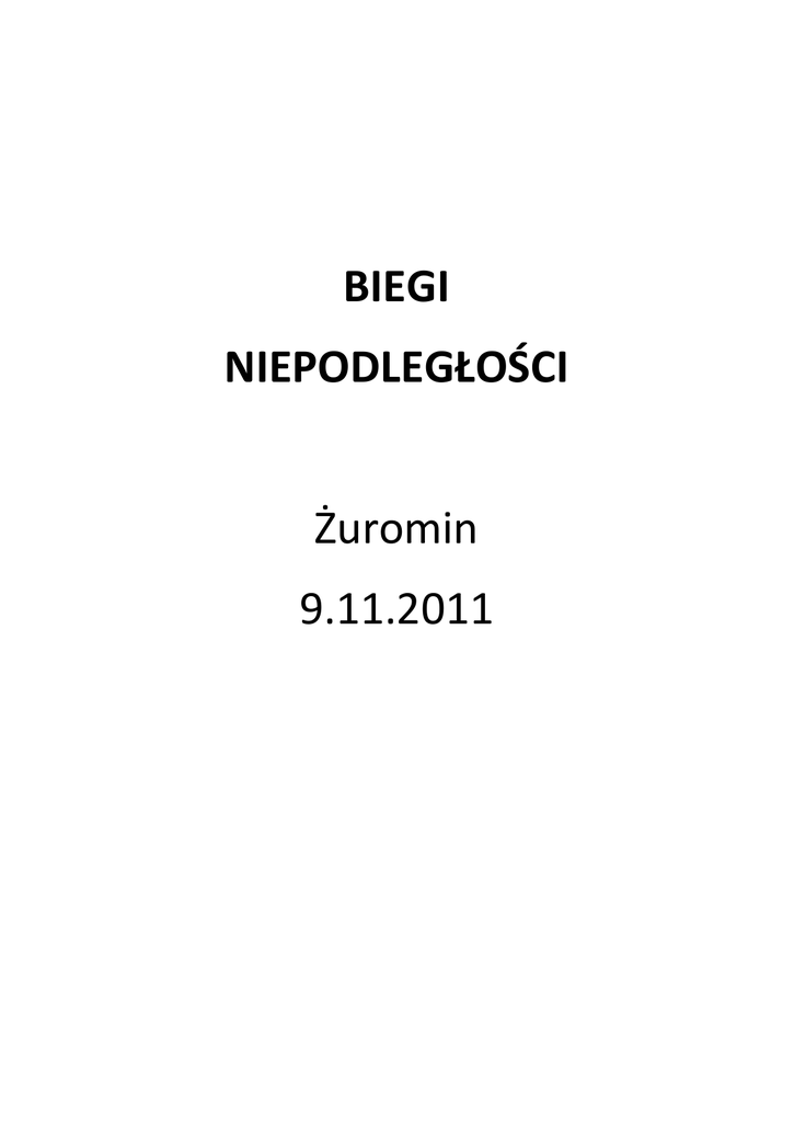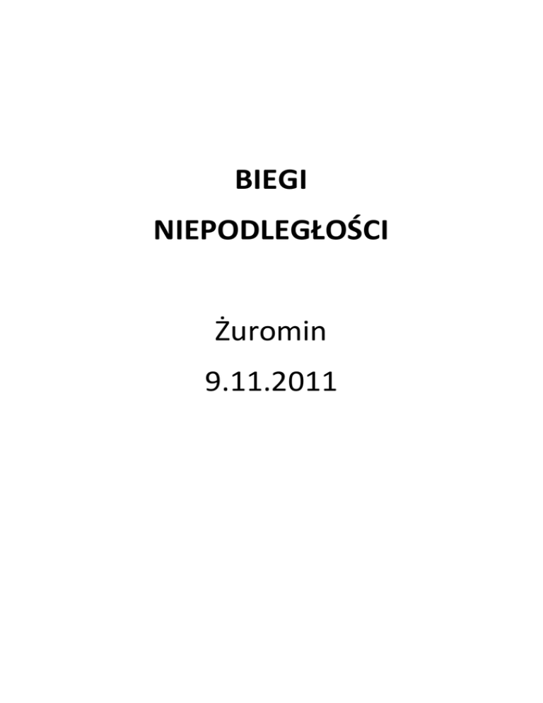 BIEGI NIEPODLEGŁOŚCI Żuromin 9.11.2011 Wyniki Bieg nr 1 kl. III-IV Sp dziewczęta Bieg nr 2kl. III-IV SP chłopcy 1. Klaudia Kapela Syberia 1. Przemysław Kalisz Zieluń 2. Aleksandra Rogozińska Lubowidz 2. Michał Brudziński Sinogóra 3. Natalia Jarkowska Sinogóra 3. Jakub Malinowski Raczyny 4. Dominika Kucińska Żuromin 2 4. Krystian Ogrodowczyk Raczyny 5. Kamila Głowacka Żuromin 1 5. Jakub Rudnicki Sinogóra 6. Magda Błaszkiewicz Zieluń 6. Jakub Żurawski Żuromin 2 7. Wiktoria Czyżyk Sinogóra 7. Mikołaj Piotrowski Chamsk 8. Oliwia Smolińska Żuromin 1 8. Jakub Deorocki Zieluń 9. Anna Bruzda Syberia 9. Mateusz Ziułkowski Żuromin 2 10. Lidia Grochowska Żuromin 2 10.Cezary Jędrzejczak 11. Edyta Murawska Chamsk 11.Kamil Ronowicz Syberia 12. Kinga Laskowska Żuromin 1 12.Jakub Kowalski Żuromin 1 13. Natalia Szmyt Żuromin 1 Żuromin 2 13.Szymon Antkowicz Żuromin 1 14. Oliwia Szmejchel Zieluń 14.Karol Wiśniewski Syberia 15. Martyna Niepelska Żuromin 1 15.Kamil Sieklicki Zieluń 16. Julia Piotrak Żuromin 1 16.Patryk Ejnik Żuromin 2 17. Ola Kozłowska Syberia 17.Bartosz Burak 18. Ola Kamińska Żuromin 1 Żuromin 2 18.Adrian Kaczmarczyk Żuromin 2 19. Natalia Chmielewska Zieluń 19.Bartosz Pstrągowski Żuromin 2 20. Katarzyna Czachorowska Żuromin 1 20.Miłosz Malinowski Żuromin 2 21. Karolina Stańczyk Chamsk 21.Wojciech Wnuk Żuromin 2 22. Milena Dykty Zieluń 22.Dominik Jarkowski Lubowidz 23. Dominika Świątek Żuromin 1 23.Damian Anysz Lubowidz 24. Zuzanna Suska Żuromin 2 24.Kilian Rochawicz Żuromin 2 25. Sylwia Banaszewska Chamsk 26. Julia Pogorzelska Żuromin 2 25.Jakub Świtalski Syberia 26.Mateusz Ulatowski Żuromin 1 27. Julia Maranowska Zieluń 27.Klaudiusz Lewalski Żuromin 2 28. Klaudia Kucharska Żuromin 2 28.Piotr Podlaszewski Syberia 29. Patrycja Osiecka Żuromin 2 29.Jakub Góralczyk Sinogóra 30. Kamila Vythilingam Żuromin 1 30.Mateusz Olszewski 31. Wiktoria Frejnik Chamsk 32. Monika Kowalczyk Syberia Chamsk 33. Monika Nasanowska Syberia 34. Ola Bugowska Chamsk Bieg nr 3 kl. V-VI SP dziewczęta Bieg nr 4 kl. V-VI SP chłopcy 1. Aleksandra Murawska Chamsk 2. Asia Karpińska Żuromin 2 3. Marta Deorocka 1. Mateusz Stańczak Chamsk 2. Szymon Waszkiewicz Zieluń 3. Karol Kowalski 4. Weronika Kubkowska Lubowidz 4. Arek Chmielewski 5. Paulina Murawska Lubowidz Chamsk Zieluń Zieluń 5. Patryk Antkiewicz Żuromin 2 6. Andżelika Kryszczak Chamsk 6. Adrian Stankiewicz Zleluń 7. Aneta Łukasiak Żuromin 2 7. Patryk Potorski 8. Klaudia Rakoczy Żuromin 2 8. Sebastian Cyrankowski Żuromin 2 9. Ewa Szymańska Żuromin 1 9. Patryk Kacprzykowski 10. Aleksandra Watkowska Żuromin 1 10.Konrad Lipinski 11. Karolina Babecka Sinogóra 12. Kamila Kinaszewska Sinogóra Lubowidz Żuromin 1 Żuromin 2 11.Sebastian Gładek Chamsk 12.Przemysław Szeluga Sinogóra 13. Martyna Gołębiewska Syberia 13.Patryk Wysocki Raczyny 14. Aleksandra Lempek Żuromin 2 14.Mariusz Gralewski Żuromin 2 15. Agata Kaliszewska Żuromin 1 15.Paweł Stankiewicz Syberia 16. Ola Gowin Żuromin 2 16.Mateusz Śliwiński Lubowidz 17. Paulina Borek Lubowidz 17.Damian Zasłona Chamsk 18. Justyna Domagalska Syberia 19. Patrycja Pesta Syberia 20. Magda Kubkowska 18.Dawid Osiecki Żuromin 2 19.Patryk Jabłonski Chamsk Sinogóra 20.Radosław Materski Lubowidz 21.Bartosz Ogrodowczyk Żuromin 1 22.Mateusz Dudek Żuromin 2 23.Damian Kazankiewicz Żuromin 2 24.Jakub Brydziński Żuromin 2 25.Dawid Klimowski Lubowidz 26.Artur Cywiński Lubowidz 27.Szymon Szmut Żuromin2 28.Dominik Kaczmarczyk Żuromin2 29.Adrian Szymański Żuromin 2 30.Daniel Ruciński Żuromin 2 31.Patryk Czarnomski Syberia 32.Mateusz Kułakowski Syberia 33.Jacek Aleksandrowicz Żuromin 1 34.Tomasz Kozłowski Syberia 35.Łukasz Kowalski Chamsk 36.Mikołaj Mańka Żuromin 1 37.Bartosz Kinaszewski Sinogóra 38.Daniel Marcinkowski Sinogóra 39.Damian Domżalski Sinogóra 40.Dawod Doleski Sinogóra 41.Kamil Paluszewski Żuromin 2 42.Patryk Niekochański Sinogóra Bieg nr 5 kl. I gimn. dziewczęta Bieg nr 6 1. Paulina Dykta Zieluń kl. I gimn. chłopcy 1. Kamil Murawski Żuromin 2 2. Klaudia Narewska Żuromin 2 2. Maciej Narewski Żuromin 2 3. Ilona Bucholska Syberia 3. Hubert Dobies Żuromin2 4. Przemysław Niewiadomski Żuromin 1 5. Dawid Kaczmarczyk Żuromin 2 6. Sebastian Gołębiewski Żuromin 2 7. Mateusz Wyźlic Żuromin 2 8. Karol Klekot Żuromin 2 9. Dominik Piskorz Żuromin 2 10.Konrad Bieranowski Żuromin 2 11.Sebastian Maranowski Żuromin 1 12.Sebastian Sokołowski Żuromin 2 13.Wojciech Wojnowski Żuromin 2 14.Rafał Wesołowski Syberia 15.Hubert Rakowski Żuromin 2 16.Szymon Rudnicki Syberia 17.Jerzy Rajkiewicz Żuromin 2 18.Dariusz Szymański Żuromin 2 19.Patryk Asztemborski Żuromin 2 20.Emil Brdak Żuromin 2 Bieg nr 7 kl. II-III gimn. dziewczęta Bieg nr 8kl. II-III gimn. chłopcy 1. Ewa Narewska Żuromin 2 1. Damian Burczyński Żuromin 2 2. Karolina Wnuk Żuromin 2 2. Adam Narewski Żuromin 2 3. Klaudia Wiśniewska Syberia 3. Sebastian Rokit Żuromin 2 4. Paulina Antkiewicz Żuromin 2 4. Michał Sobolewski Żuromin 1 5. Agata Szerszen Żuromin 2 5. Sebastian Reda Żuromin 2 6. Eliza Brdak Żuromin 2 6. Rafał Rogowski Żuromin 1 7. Dorota Górka Syberia 7.Kamil Stopczyński Żuromin 1 8. Radosław Olszewski Żuromin 2 9. Paweł Więckiewicz Żuromin 1 10.Piotr Więckiewicz Żuromin 1 11.Dawid Szymański Żuromin 2 12.Rafał Zasłona Żuromin 2 13.Piotr Kaczmarczyk Żuromin 2 14.Jakub Dobies Żuromin 2 15.Grzegorz Snowacki Żuromin 2 16.Piotr Bieńkowski Żuromin 2 17.Jakub Felber Żuromin 2 18.Damian Budziński Żuromin 2 19.Marcin Górka Syberia 20.Karol Mazanowski Syberia 21.Andrzej Sołtysik Syberia 22.Michał Koziołek Syberia Bieg nr 9 szkoły średnie dziewczęta Bieg nr 10szkoły średnie chłopcy 1. Emilia Wysocka Żuromin ZSP 1. Dawid Malinowski Żuromin ZSP 2. Patrycja Kąkolewska Żuromin LO 2. Jarosław Pawlak 3. Aneta Duchnowska Żuromin LO Żuromin SZP 3. Karol Chojnowski Żuromin ZSP 4. Michał Serdzińsk