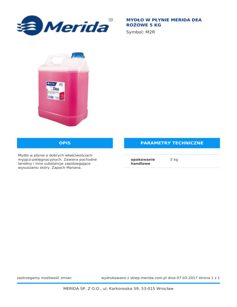 MYDŁO W PŁYNIE MERIDA DEA RÓŻOWE 5 KG Symbol: M2R OPIS Mydło w płynie o dobrych właściwościach myjąco-pielęgnacyjnych. Zawiera pochodne lanoliny i inne substancje zapobiegające wysuszaniu skóry. Zapach Manana. zastrzegamy możliwość zmian PARAMETRY TECHNICZNE opakowanie handlowe 5 kg wydrukowano z sklep.merida.com.pl dnia 07-03-2017 strona 1 z 1 MERIDA SP. Z O.O., ul. Karkonoska 59, 53-015 Wrocław
