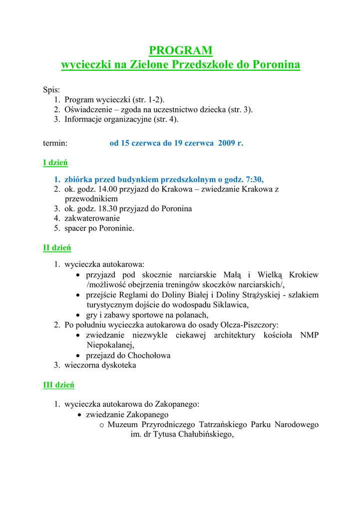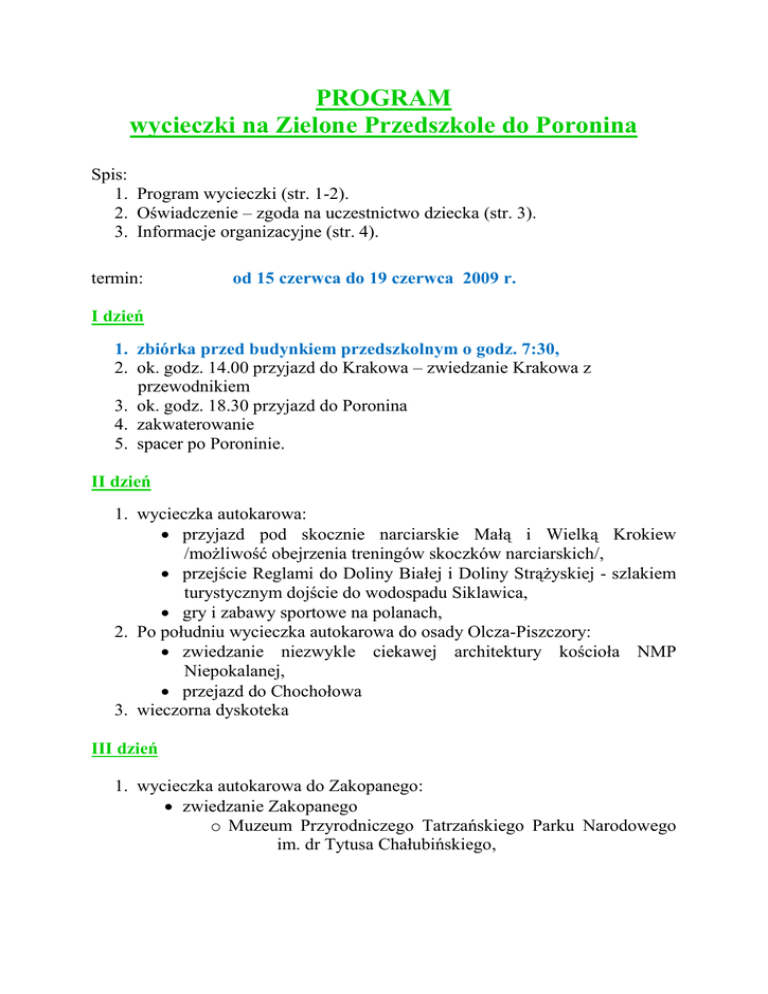 PROGRAM wycieczki na Zielone Przedszkole do Poronina Spis: 1. Program wycieczki (str. 1-2). 2. Oświadczenie – zgoda na uczestnictwo dziecka (str. 3). 3. Informacje organizacyjne (str. 4). termin: od 15 czerwca do 19 czerwca 2009 r. I dzień 1. zbiórka przed budynkiem przedszkolnym o godz. 7:30, 2. ok. godz. 14.00 przyjazd do Krakowa – zwiedzanie Krakowa z przewodnikiem 3. ok. godz. 18.30 przyjazd do Poronina 4. zakwaterowanie 5. spacer po Poroninie. II dzień 1. wycieczka autokarowa: przyjazd pod skocznie narciarskie Małą i Wielką Krokiew /możliwość obejrzenia treningów skoczków narciarskich/, przejście Reglami do Doliny Białej i Doliny Strążyskiej - szlakiem turystycznym dojście do wodospadu Siklawica, gry i zabawy sportowe na polanach, 2. Po południu wycieczka autokarowa do osady Olcza-Piszczory: zwiedzanie niezwykle ciekawej architektury kościoła NMP Niepokalanej, przejazd do Chochołowa 3. wieczorna dyskoteka III dzień 1. wycieczka autokarowa do Zakopanego: zwiedzanie Zakopanego o Muzeum Przyrodniczego Tatrzańskiego Parku Narodowego im. dr Tytusa Chałubińskiego, o Sanktuarium Matki Bożej Fatimskiej na Krzeptówkach (wybudowane przez górali jako votum dziękczynne za uratowanie życia papieżowi Janowi Pawłowi II), o spacer Krupówkami, wjazd kolejką na Gubałówkę, o gry i zabawy na polanach, zejście do miejscowości Ząb 2. Po południu wyjazd do Rusinowej Polany, przejście w górę do kaplicy Matki Boskiej Królowej Tatr na Wiktorówkach 3. Wieczorem kupowanie pamiątek, ognisko z pieczeniem kiełbasek, program artystyczny, śpiewy tańce. IV dzień 1. wycieczka do Narodowego Parku Tatrzańskiego 2. Kotlina Kościeliska, zapoznanie dzieci z roślinnością, która jest pod ochroną, przejście jednym ze szlaków turystycznych w kierunku Jaskini Mroźnej, podziwianie przyrody, /roślinność górska, płynące potoczki/, 3. dojście do schroniska ORNAK., 4. po południu wycieczka do Niedzicy – zapora w Niedzicy, zwiedzanie zamku. V dzień 1. wspinanie się na wzgórze w Poroninie od strony południowo –wschodniej /szlakiem turystycznym /, pożegnanie z Tatrami. 2. Wyjazd z Poronina po obiedzie ok. godz.12.30, przyjazd do Krakowa zwiedzanie Krakowa z przewodnikiem : Kościół Mariacki, Sukiennice, Wawel – historia i legendy 3. Przyjazd do Warszawy ok. godz. 22.00 pod przedszkole .......................................................................... Warszawa, dnia……………. imię i nazwisko dziecka, data urodzenia ............................................................................................ nr PESEL .......................................................................................................................................................................... imię i nazwisko rodziców, prawnych opiekunów ........................................................................................................................................................................... telefony kontaktowe z rodzicami, prawnymi opiekunami w czasie pobytu dziecka w Poroninie Oświadczenie Oświadczam, że wyrażam zgodę na uczestnictwo mojego dziecka w wyjeździe do Poronina na Zielone Przedszkole w terminie od 15 czerwca 2009 r. do 19 czerwca 2009 r. ............................................ data i podpis rodzica, opiekuna Zbiórka przed przedszkolem w dniu 15 czerwca 2009r. o godz. 7:30. Przyjazd pod budynek przedszkolny w dniu 19 czerwca 2009 r. ok. godz. 21:45-22:00 Dziecko należy wyposażyć w : - 6 reklamówek / torebek foliowych/, w których umieszczamy / w każdej reklamówce, torebce foliowej/ – podkoszulkę, majteczki, skarpetki - 3-4 pary krótkich spodenek - 2 pary długich spodni – najlepiej dresowych - 3 bluzy , w tym jedna rozpinana - kurtkę przeciwdeszczową - jeden duży ręcznik - przybory do mycia / pastę, szczoteczkę, mydło w płynie, grzebień lub szczotkę do włosów, chusteczki higieniczne/ - piżamę - 1 parę adidasów, klapki pod prysznic, 1 parę wygodnych bucików/ dobrze by było, żeby nie były to sandały z uwagi na drobne kamyczki, / - czapkę lub chustkę - jeden ulubiony strój na dyskoteki - środek przeciw komarom / może być jeden na kilkoro dzieci/ - krem z filtrem / może być jeden na kilkoro dzieci/ - aviomarin lub inny lek przy chorobie lokomocyjnej dziecka, przekazujemy go nauczycielce przy autokarze – podpisany imieniem i nazwiskiem dziecka - jedną dużą reklamówkę na brudne ubrania - wszelkie lekarstwa, które dziecko musi zażywać / z dokładnym opisem dawkowania, imieniem i nazwiskiem dziecka/ przekazujemy nauczycielce przy autokarze - suchy prowiant na drogę / planowany przyjazd do Poronina na obiadokolację o godz. 19.00/ Telefony kontaktowe: do pensjonatu /0 18/ 20 74 549 do opiekunów: Teresa Toboła 0515 068 599 Mariola Jackowska 0 602345736 Dorota Kwaśnicka 0 509999651 adres domu wypoczynkowego: Poronin ul. Anieli Gut - Stapińskiej 14 adres strony internetowej: http://www.obiektyturystyczne.pl/najlepsze.noclegi/569,poronin,osrodekwczasowy-w-poroninie-w-malopolskim;malopolskie