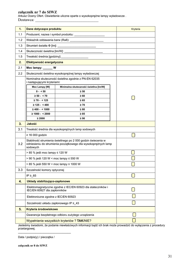 załącznik nr 7 do SIWZ Arkusz Oceny Ofert. Oświetlenie uliczne oparte o wysokoprężne lampy wyładowcze . Dostawca: _________________________________ 1. Dane dotyczące produktu 1.1 Producent, nazwa i symbol produktu: ___________________ 1.2 Wskaźnik oddawania barw (Ra8): _____________________ 1.3 Strumień światła Φ [lm]: ________________________ 1.4 Skuteczność świetlna [lm/W]: ________________________ 1.5 Trwałość średnia [godziny]:_________________ 2. Efektywność energetyczna 2.1 Moc lampy: ______ W 2.2 Skuteczność świetlna wysokoprężnej lampy wyładowczej Kryteria Nominalna skuteczność świetlna zgodnie z PN-EN 62035 i następującymi kryteriami: 3. 3.1 Moc Lampy [W] Minimalna skuteczność świetlna [lm/W] 0 - < 50 ≥ 50 ≥ 50 - < 70 ≥ 60 ≥ 70 - < 125 ≥ 65 ≥ 125 - < 400 ≥ 70 ≥ 400 - < 1000 ≥ 80 ≥ 1000 - < 2000 ≥ 85 ≥ 2000 ≥ 90 Jakość Trwałość średnia dla wysokoprężnych lamp sodowych ≥ 16 000 godzin 3.2 Stabilność strumienia świetlnego po 2 000 godzin świecenia w odniesieniu do strumienia początkowego dla wysokoprężnych lamp sodowych > 85 % jeśli moc lampy ≤ 120 W > 90 % jeśli 120 W < moc lampy ≤ 550 W > 85 % jeśli 550 W < moc lampy ≤ 1000 W 3.3 Szczelność komory optycznej IP ≥_65 4. Układy stabilizująco-zapłonowe Elektromagnetyczne zgodne z IEC/EN 60923 dla stateczników i IEC/EN 60927 dla zapłonników Elektroniczne zgodne z IEC/EN 60923 Szczelność układu zapłonowego IP ≥_43 5. Kryteria środowiskowe Gwarancja bezpłatnego odbioru zużytego urządzenia Wypełnienie wszystkich kryteriów ? TAK/NIE? Jesteśmy świadomi, że podanie niewłaściwych informacji bądź ich brak może prowadzić do wyłączenia z procedury przetargowej. _________________________________ Data / podpis(y) / pieczątka / załącznik nr 8 do SIWZ 31 Arkusz Oceny Ofert. Oświetlenie parkowe oparte o wysokoprężne lampy wyładowcze . Dostawca: _________________________________ 1. Dane dotyczące produktu 1.1 Producent, nazwa i symbol produktu: ___________________ 1.2 Wskaźnik oddawania barw (Ra8): _____________________ 1.3 Strumień światła Φ [lm]: ________________________ 1.4 Skuteczność świetlna [lm/W]: ________________________ 1.5 Trwałość średnia [godziny]:_________________ 2. Efektywność energetyczna 2.1 Moc lampy: ______ W 2.2 Skuteczność świetlna wysokoprężnej lampy wyładowczej Kryteria Nominalna skuteczność świetlna zgodnie z PN-EN 62035 i następującymi kryteriami: Moc Lampy [W] Minimalna skuteczność świetlna [lm/W] 0 - < 50 ≥ 50 ≥ 50 - < 70 ≥ 60 ≥ 70 - < 125 ≥ 65 ≥ 125 - < 400 ≥ 70 ≥ 400 - < 1000 ≥ 80 ≥ 1000 - < 2000 ≥ 85 ≥ 2000 ≥ 90 3. Jakość 3.1 Trwałość średnia dla wysokoprężnych lamp sodowych ≥ 16 000 godzin 3.2 Stabilność strumienia świetlnego po 2 000 godzin świecenia w odniesieniu do strumienia początkowego dla wysokoprężnych lamp sodowych > 85 % jeśli moc lampy ≤ 120 W > 90 % jeśli 120 W < moc lampy ≤ 550 W > 85 % jeśli 550 W < moc lampy ≤ 1000 W 3.3 Szczelność komory optycznej IP ≥_65 4. Układy stabilizująco-zapłonowe Elektromagnetyczne zgodne z IEC/EN 60923 dla stateczników i IEC/EN 60927 dla zapłonników Elektroniczne zgodne z IEC/EN 60923 Szczelność układu zapłonowego IP ≥_43 5. Kryteria środowiskowe Gwarancja bezpłatnego odbioru zużytego urządzenia Wypełnienie wszystkich kryteriów ? TAK/NIE? Jesteśmy świadomi, że podanie niewłaściwych informacji bądź ich brak może prowadzić do wyłączenia z procedury przetargowej. _________________________________ Data / podpis(y) / pieczątka / załącznik nr 9 do SIWZ Arkusz Oceny Ofert. Oświetlenie retro oparte o wysokoprężne lampy wyładowcze . 32 Dostawca: _________________________________ 1. Dane dotyczące produktu 1.1 Producent, nazwa i symbol produktu: ___________________ 1.2 Wskaźnik oddawania barw (Ra8): _____________________ 1.3 Strumień światła Φ [lm]: ________________________ 1.4 Skuteczność świetlna [lm/W]: ________________________ 1.5 Trwałość średnia [godziny]:_________________ 2. Efektywność energetyczna 2.1 Moc lampy: ______ W 2.2 Skuteczność świetlna wysokoprężnej lampy wyładowczej Kryteria Nominalna skuteczność świetlna zgodnie z PN-EN 62035 i następującymi kryteriami: Moc Lampy [W] Minimalna skuteczność świetlna [lm/W] 0 - < 50 ≥ 50 ≥ 50 - < 70 ≥ 60 ≥ 70 - < 125 ≥ 65 ≥ 125 - < 400 ≥ 70 ≥ 400 - < 1000 ≥ 80 ≥ 1000 - < 2000 ≥ 85 ≥ 2000 ≥ 90 3. Jakość 3.1 Trwałość średnia dla wysokoprężnych lamp sodowych ≥ 16 000 godzin 3.2 Stabilność strumienia świetlnego po 2 000 godzin świecenia w odniesieniu do strumienia początkowego dla wysokoprężnych lamp sodowych > 85 % jeśli moc lampy ≤ 120 W > 90 % jeśli 120 W < moc lampy ≤ 550 W > 85 % jeśli 550 W < moc lampy ≤ 1000 W 3.3 Szczelność komory optycznej IP ≥_54 4. Układy stabilizująco-zapłonowe Elektromagnetyczne zgodne z IEC/EN 60923 dla stateczników i IEC/EN 60927 dla zapłonników Elektroniczne zgodne z IEC/EN 60923 Szczelność układu zapłonowego IP ≥_43 5. Kryteria środowiskowe Gwarancja bezpłatnego odbioru zużytego urządzenia Wypełnienie wszystkich kryteriów ? TAK/NIE? Jesteśmy świadomi, że podanie niewłaściwych informacji bądź ich brak może prowadzić do wyłączenia z procedury przetargowej. _________________________________ Data / podpis(y) / pieczątka / 33