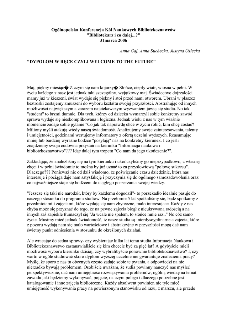 Ogólnopolska Konferencja Kół Naukowych Bibliotekoznawców "Bibliotekarz i co dalej...?" 31marca 2006 Anna Gaj, Anna Suchecka, Justyna Osiecka "DYPOLOM W RĘCE CZYLI WELCOME TO THE FUTURE" Maj, piękny miesiąc� Z czym się nam kojarzy� Słońce, ciepły wiatr, wiosna w pełni. W życiu każdego z nasz jest jednak taki szczególny, wyjątkowy maj. Świadectwo dojrzałości mamy już w kieszeni, świat wydaje się piękny i stoi przed nami otworem. Ubrani w płaszcz beztroski zostajemy zmuszeni do wyboru kształtu swojej przyszłości. Abstrahując od innych możliwości największym a zarazem najciekawszym wyzwaniem jawią się studia. No tak "student" to brzmi dumnie. Dla tych, którzy od dziecka wymarzyli sobie konkretny zawód sprawa wydaje się nieskomplikowana i logiczna. Jednak wielu z nas w tym właśnie momencie zadaje sobie pytanie "Co jak tak naprawdę chce w życiu robić, kim chcę zostać? Miliony myśli atakują wtedy naszą świadomość. Analizujemy swoje zainteresowania, talenty i umiejętności, godzinami wertujemy informatory z ofertą uczelni wyższych. Reasumując mniej lub bardziej wyraźne bodźce "posyłają" nas na konkretny kierunek. I co jeśli znajdziemy swoja cudowna przystań na kierunku "Informacja naukowa i bibliotekoznawstwo"??? Idąc dalej tym tropem "Co nam da jego ukończenie?". Zakładając, że znaleźliśmy się na tym kierunku i ukończyliśmy go nieprzypadkowo, z własnej chęci i w pełni świadomie to można by już uznać to za przysłowiową "połowę sukcesu". Dlaczego??? Ponieważ nie od dziś wiadomo, że poświęcanie czasu dziedzinie, która nas interesuje i pociąga daje nam satysfakcję i przyczynia się do ogólnego samozadowolenia oraz co najważniejsze staje się bodźcem do ciągłego poszerzania swojej wiedzy. "Jeszcze się taki nie narodził, który by każdemu dogodził"- to porzekadło idealnie pasuje do naszego stosunku do programu studiów. Na przełomie 5 lat spotkaliśmy się, bądź spotkamy z przedmiotami i zajęciami, które wydają się nam zbyteczne, mało interesujące. Każdy z nas chyba może się przyznać do tego, że na pewne zajęcia biegł z nieukrywaną radością a na innych zaś zapiekle tłumaczył się "Ja wcale nie spałem, to słońce mnie razi." No cóż samo życie. Musimy mieć jednak świadomość, iż nasze studia są interdyscyplinarne a zajęcia, które z pozoru wydają nam się mało wartościowe i abstrakcyjne w przyszłości mogą dać nam świetny punkt odniesienia w stosunku do określonych działań. Ale wracając do sedna sprawy- czy wybierając kilka lat temu studia Informacja Naukowa i Bibliotekoznawstwo zastanawialiście się kim chcecie być za pięć lat? A gdybyście mieli możliwość wyboru kierunku dzisiaj, czy wybralibyście ponownie bibliotekoznawstwo? I, czy warto w ogóle studiować skoro dyplom wyższej uczelnie nie gwarantuje znalezienia pracy? Myślę, że sporo z nas tu obecnych często zadaje sobie te pytania, a odpowiedzi na nie nierzadko bywają problemem. Osobiście uważam, że sudia powinny nauczyć nas myśleć perspektywicznie, dać nam umiejętność rozwiązywania problemów, ogólną wiedzę na temat zawodu jaki będziemy wykonywać, pojęcie, na czym polega i dlaczego potrzebne jest katalogowanie i inne zajęcia biblioteczne. Każdy absolwent powinien nie tyle mieć umiejętność wykonywania pracy na powierzonym stanowisku od razu, z marszu, ale przede wszystkim...ocenienia, czy to co się robi w bibliotece, na stanowisku, na które trafi, robi się należycie, czy w ogóle ma to sens". Mam nadzieję, że studia które ukończymy dadzą nam możliwość pracy w wymarzonym przez nas zawodzie lub w takim, który choć w połowie sprosta naszym oczekiwaniom. Oczywiście wszystkim nam tego życzę. Pozwoliłam sobie na podstawie specjalizacji i przedmiotów, które występują w siatce zajęć Uniwersytetu Śląskiego zaproponować kilka pomysłów na "karierę zawodową" dla absolwentów INIB. I tak Bibliotekarstwo współczesne to szansa na pracę: • • • • • w dziale public relations na stanowisku zarządzającego zasobami ludzkimi w marketingu bibliotecznym w dziale promocji- w szerokim tego słowa znaczeniu w dziale zarządzania strategicznego biblioteki Bibliografia i informacja naukowa daje nam możliwość: • • • • • tworzenia stron WWW tworzenia i zarządzania bazami danych pracy jako inforbrokerzy zarządzania systemami informacyjnymi w edukacji pracy przy wykorzystywaniu informacji w takich dziedzinach jak prawo i gospodarka Książka, prasa, biblioteki oraz czytelnictwo dzieci i młodzieży to szansa na pracę: • • • jako biblioterapeuta jako nauczyciel-bibliotekarz w ośrodkach kulturalno-oświatowych Ochrona i konserwacja zbiorów pozwala wykonywać takie zawody jak: • • • introligator konserwator zbiorów kustosz Edytorstwo, pomimo iż ta specjalizacja dopiero jest w trakcie planów, to w siatce zajęć znajdują się takie przedmioty jak edytorstwo i elektroniczny warsztat edytora, które dają nam możliwość podjęcia pracy w wydawnictwie. Zarówno po, jak i w trakcie studiów możemy także rozwijać swoje zainteresowania, dokształcać się i poszerzać horyzonty myślowe na różnego rodzaju kursach, szkoleniach i studiach podyplomowych. I tak na przykład: • Fundacja Bertelsmanna we współpracy z Biblioteką Uniwersytetu Warszawskiego i EBIBem zorganizowała internetowy kurs dla bibliotekarzy pod nazwą BIBWEB. W kursie tym mogą uczestniczyć również studenci, ale także każdy kto tylko wyrazi chęć • • Centrum Edukacji Bibliotekarskiej, Informacyjnej i Dokumentacyjnej CEBID oferuje szkolenia z zakresu: katalogowania w Języku Haseł Przedmiotowych Biblioteki Narodowej, obsługi programu MAK i MARC 21, tworzenia stron internetowych Uniwersytet Śląski, dla przykładu, oferuje studia podyplomowe z zakresu: Biblioteki i systemy informacyjne w Unii Europejskiej oraz Zarządzanie iemarketing w bibl