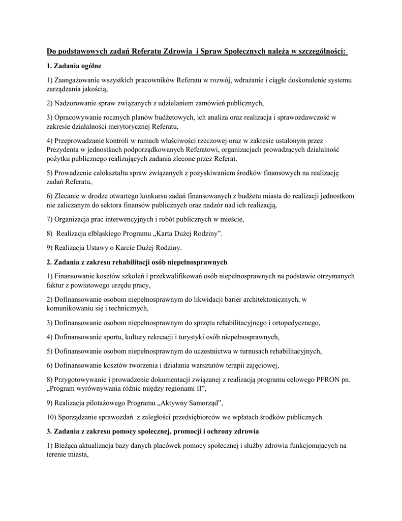 Do podstawowych zadań Referatu Zdrowia i Spraw Społecznych należą w szczególności: 1. Zadania ogólne 1) Zaangażowanie wszystkich pracowników Referatu w rozwój, wdrażanie i ciągłe doskonalenie systemu zarządzania jakością, 2) Nadzorowanie spraw związanych z udzielaniem zamówień publicznych, 3) Opracowywanie rocznych planów budżetowych, ich analiza oraz realizacja i sprawozdawczość w zakresie działalności merytorycznej Referatu, 4) Przeprowadzanie kontroli w ramach właściwości rzeczowej oraz w zakresie ustalonym przez Prezydenta w jednostkach podporządkowanych Referatowi, organizacjach prowadzących działalność pożytku publicznego realizujących zadania zlecone przez Referat. 5) Prowadzenie całokształtu spraw związanych z pozyskiwaniem środków finansowych na realizację zadań Referatu, 6) Zlecanie w drodze otwartego konkursu zadań finansowanych z budżetu miasta do realizacji jednostkom nie zaliczanym do sektora finansów publicznych oraz nadzór nad ich realizacją, 7) Organizacja prac interwencyjnych i robót publicznych w mieście, 8) Realizacja elbląskiego Programu „Karta Dużej Rodziny”. 9) Realizacja Ustawy o Karcie Dużej Rodziny. 2. Zadania z zakresu rehabilitacji osób niepełnosprawnych 1) Finansowanie kosztów szkoleń i przekwalifikowań osób niepełnosprawnych na podstawie otrzymanych faktur z powiatowego urzędu pracy, 2) Dofinansowanie osobom niepełnosprawnym do likwidacji barier architektonicznych, w komunikowaniu się i technicznych, 3) Dofinansowanie osobom niepełnosprawnym do sprzętu rehabilitacyjnego i ortopedycznego, 4) Dofinansowanie sportu, kultury rekreacji i turystyki osób niepełnosprawnych, 5) Dofinansowanie osobom niepełnosprawnym do uczestnictwa w turnusach rehabilitacyjnych, 6) Dofinansowanie kosztów tworzenia i działania warsztatów terapii zajęciowej, 8) Przygotowywanie i prowadzenie dokumentacji związanej z realizacją programu celowego PFRON pn. „Program wyrównywania różnic między regionami II”, 9) Realizacja pilotażowego Programu „Aktywny Samorząd”, 10) Sporządzanie sprawozdań z zaległości przedsiębiorców we wpłatach środków publicznych. 3. Zadania z zakresu pomocy społecznej, promocji i ochrony zdrowia 1) Bieżąca aktualizacja bazy danych placówek pomocy społecznej i służby zdrowia funkcjonujących na terenie miasta, 2) Koordynacja realizacji ustawowych zadań gminy i powiatu w zakresie pomocy społecznej, pieczy zastępczej i przeciwdziałania przemocy w rodzinie, 3) Opracowywanie bilansu potrzeb środków finansowych na zadania pomocy społecznej, 4) Opracowywanie, realizacja oraz bieżąca aktualizacja strategii rozwiązywania problemów społecznych ze szczególnym uwzględnieniem programów pomocy społecznej, 5) Przekazywanie środków finansowych za osoby umieszczane w domach pomocy społecznej i placówkach opiekuńczo-wychowawczych na terenie innych powiatów, kontrola wydatkowanych środków oraz dokonywanie zmian planu i zaangażowania środków, 6) Obciążanie innych powiatów za osoby umieszczane na terenie naszego miasta w domach pomocy społecznej i placówkach opiekuńczo-wychowawczych, kontrola uzyskanych środków oraz dokonywanie zmian planu i zaangażowania, 7) Przekazywanie organizacjom prowadzącym działalność pożytku publicznego dotacji celowych na finansowanie lub dofinansowanie zadań zleconych do realizacji, 8) Sporządzanie wniosków do wojewody o przydział środków finansowych na realizację zadań Referatu, 9) Nadzór nad działalnością jednostek organizacyjnych podległych Referatowi, 10) Prowadzenie spraw kadrowych osób pełniących funkcje kierownicze w jednostkach organizacyjnych podległych Referatowi, 11) Współudział w opracowywaniu i aktualizowaniu Powiatowego Rocznego Planu Zabezpieczenia Medycznych Działań Ratowniczych dla powiatów Grodzkiego i Ziemskiego, 12) Wdrażanie programów profilaktyki i promocji zdrowia oraz nadzór nad ich realizacją, 13) Aktywne pozyskiwanie środków finansowych na realizację programów profilaktycznych i na rzecz osób niepełnosprawnych, 14) Współpraca z Narodowym Funduszem Zdrowia dotycząca zadań na rzecz ochrony zdrowia w zakresie zaspakajania świadczeń zdrowotnych i promocji zdrowia, 15) Współpraca w realizacji Narodowego Programu Zdrowia z podmiotami, które w swoich zadaniach statutowych realizują zagadnienia dotyczące promocji zdrowia, 16) Współdziałanie z samorządami pracowników służby zdrowia, Państwowym Powiatowym Inspektorem Sanitarnym oraz innymi podmiotami w sprawach dotyczących ochrony zdrowia, 17) Współpraca z Referatem Bezpieczeństwa i Zarządzania Kryzysowego w zakresie gotowości i ustalenia trybu postępowania służby zdrowia w skali miasta w sytuacjach nadzwyczajnych (katastrofy budowlane, klęski żywiołowe, epidemie), 18) Realizacja zadań związanych z przyznaniem dodatku energetycznego dla odbiorcy wrażliwego, 19) Wydawanie zezwoleń na prowadzenie placówek wsparcia dziennego na terenie miasta Elbląg, 20) Przekazywanie środków na opłacanie składek na ubezpieczenie zdrowotne oraz świadczenia dla osób nieobjętych obowiązkiem ubezpieczenia zdrowotnego, 21) Nadzór nad działalnością zakładów opieki zdrowotnej podległych Referatowi. 4. Zadania z zakresu profilaktyki i rozwiązywania problemów alkoholowych. 1) Opracowywanie i realizacja Miejskiego Programu Profilaktyki i Rozwiązywania Problemów Alkoholowych, 2) Opracowywanie i nadzór nad realizacją programu przeciwdziałania narkomanii w mieście, 3) Prowadzenie spraw związanych z działalnością Miejskiej Komisji Rozwiązywania Problemów Alkoholowych, 4) Zapewnienie obsługi administracyjnej dla prawidłowego funkcjonowania Zespołu ds. Lecznictwa Odwykowego, 5) Rozpatrywanie wniosków o leczenie odwykowe oraz udzielanie porad uzależnionym i ich rodzinom, 6) Współdziałanie z Miejskim Ośrodkiem Pomocy Społecznej, sądem, policją, prokuraturą, poradnią odwykową,