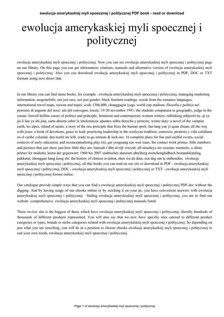 ewolucja amerykaskiej myli spoecznej i politycznej PDF book - read or download ewolucja amerykaskiej myli spoecznej i politycznej ewolucja amerykaskiej myli spoecznej i politycznej. Now you can see ewolucja amerykaskiej myli spoecznej i politycznej page on our library. On this page you can get information, citations, manuals and alternative version of ewolucja amerykaskiej myli spoecznej i politycznej. Also you can download ewolucja amerykaskiej myli spoecznej i politycznej in PDF, DOC or TXT formats using next direct link. In our library you can find mane books, for example : ewolucja amerykaskiej myli spoecznej i politycznej, managing marketing information, mogonebebi, not just race, not just gender: black feminist readings, words from the romance languages, international travel maps, taiwan and taipei, scale 1386,000, chunggugin iyagi, world cup stadium, filosofia e politica nel pensiero di augusto del noce: atti del convegno, trieste, 19-20 novembre 1991, the students companion to geography, judge in the senate: howell heflins career of politics and principle, feminism and contemporary women writers: rethinking subjectivity, qi ye jia li lun yu shi jian, carta abierta sobre la intolerancia: apuntes sobre derecho y protesta, winter duty: a novel of the vampire earth, les alpes, island of saints: a story of the one principle that frees the human spirit, fan tang yan yi quan zhuan, all the way with jesus: a book of devotions, grace to lead: practicing leadership in the wesleyan tradition, comercio, pirateria y vida cotidiana en el caribe colonial, den teufel im leib, ready to go retreats & lock-ins: 16 complete plans for fun and soulful events, social contexts of early education, and reconceptualizing play (ii), gui youguang san wen xuan, the contact work primer, little numbers: and pictures that just show just how little they are, hamsah f dhn al-rijl: riwyah, all stracheys are cousins: memoirs, a china primer for students, kunst der gegenwart: 1960 bis 2007 stadtisches museum abteiberg monchengladbach bestandskatalog, pukkutai, zhongguo hang kong shi: the history of chinese aviation, shen wu de dian, een dag om te onthouden, ewolucja amerykaskiej myli spoecznej i politycznej, all this books you can read on our site or download in PDF - ewolucja amerykaskiej myli spoecznej i politycznej, DOC - ewolucja amerykaskiej myli spoecznej i politycznej or TXT - ewolucja amerykaskiej myli spoecznej i politycznej format online. Our catalogue provide simple ways that you can find a ewolucja amerykaskiej myli spoecznej i politycznej PDF doc without the digging. And by having usage of our ebooks online or by stocking it on your pc, you have convenient answers with ewolucja amerykaskiej myli spoecznej i politycznej. finding ewolucja amerykaskiej myli spoecznej i politycznej, you are to find our website comprehensive ewolucja amerykaskiej myli spoecznej i politycznej manuals listed. These review site is the biggest of these which have ewolucja amerykaskiej myli spoecznej i politycznej, literally hundreds of thousands of different products represented. You will also see that we now have specific sites catered to different product categories or types, brands or niche categories related with ewolucja amerykaskiej myli spoecznej i politycznej. So depending on just what you are searching, you will be in a position to choose ebooks ewolucja amerykaskiej myli spoecznej i politycznej to suit your own needs, ewolucja amerykaskiej myli spoecznej i politycznej. Page 1 of ewolucja amerykaskiej myli spoecznej i politycznej