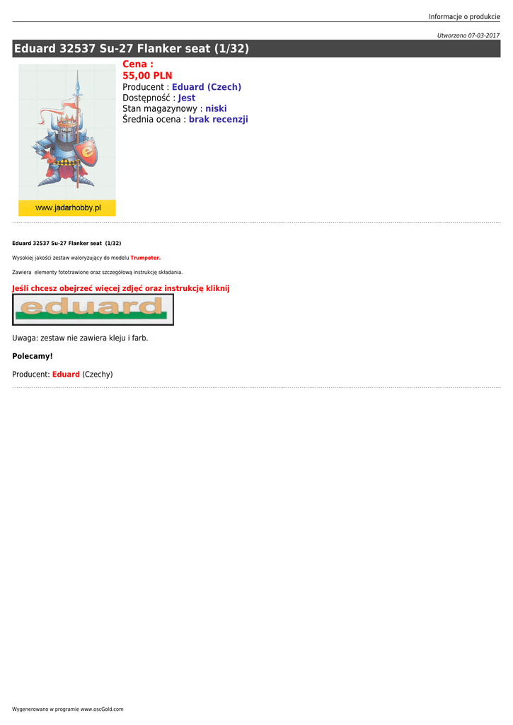 Informacje o produkcie Utworzono 07-03-2017 Eduard 32537 Su-27 Flanker seat (1/32) Cena : 55,00 PLN Producent : Eduard (Czech) Dostępność : Jest Stan magazynowy : niski Średnia ocena : brak recenzji Eduard 32537 Su-27 Flanker seat (1/32) Wysokiej jakości zestaw waloryzujący do modelu Trumpeter. Zawiera elementy fototrawione oraz szczegółową instrukcję składania. Jeśli chcesz obejrzeć więcej zdjęć oraz instrukcję kliknij Uwaga: zestaw nie zawiera kleju i farb. Polecamy! Producent: Eduard (Czechy) Wygenerowano w programie www.oscGold.com