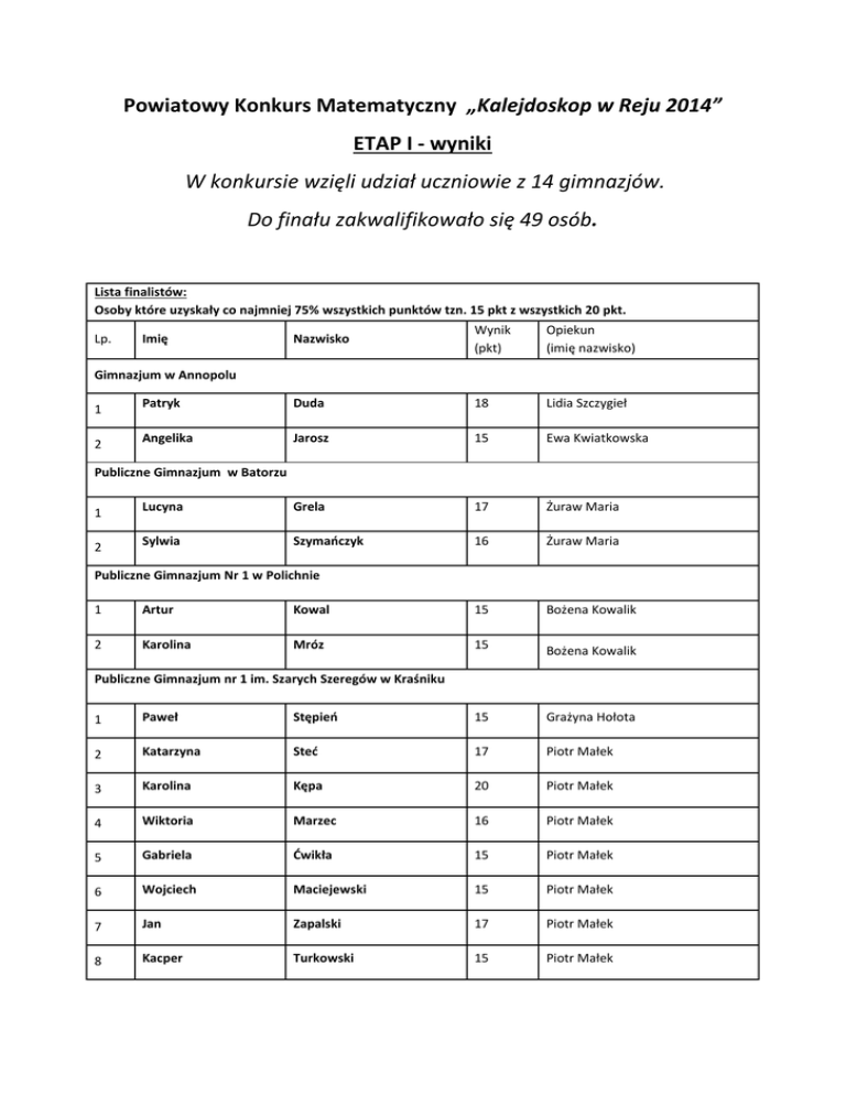 Powiatowy Konkurs Matematyczny „Kalejdoskop w Reju 2014” ETAP I - wyniki W konkursie wzięli udział uczniowie z 14 gimnazjów. Do finału zakwalifikowało się 49 osób. Lista finalistów: Osoby które uzyskały co najmniej 75% wszystkich punktów tzn. 15 pkt z wszystkich 20 pkt. Lp. Imię Nazwisko Wynik (pkt) Opiekun (imię nazwisko) Gimnazjum w Annopolu 1 Patryk Duda 18 Lidia Szczygieł 2 Angelika Jarosz 15 Ewa Kwiatkowska Publiczne Gimnazjum w Batorzu 1 Lucyna Grela 17 Żuraw Maria 2 Sylwia Szymańczyk 16 Żuraw Maria Publiczne Gimnazjum Nr 1 w Polichnie 1 Artur Kowal 15 Bożena Kowalik 2 Karolina Mróz 15 Bożena Kowalik Publiczne Gimnazjum nr 1 im. Szarych Szeregów w Kraśniku 1 Paweł Stępień 15 Grażyna Hołota 2 Katarzyna Steć 17 Piotr Małek 3 Karolina Kępa 20 Piotr Małek 4 Wiktoria Marzec 16 Piotr Małek 5 Gabriela Ćwikła 15 Piotr Małek 6 Wojciech Maciejewski 15 Piotr Małek 7 Jan Zapalski 17 Piotr Małek 8 Kacper Turkowski 15 Piotr Małek 9 Magdalena Wieczorek 17 Piotr Małek 10 Anna Kierznowska 16 Piotr Małek 11 Filip Duda 17 Piotr Małek Publicznym Gimnazjum nr 2 im. Jana Kochanowskiego w Kraśniku 1. Dawid Zarzeczny 20 Małgorzata Kołodziejczyk 2. Alicja Skrobucha 20 Małgorzata Kołodziejczyk 3. Marcin Brodecki 20 Małgorzata Kołodziejczyk 4. Marcin Pielaszkiewicz 18 Małgorzata Kołodziejczyk 5. Przemysław Klucznik 18 Barbara Wójtowicz 6 Artur Ćwieka 17 Barbara Wójtowicz 7 Dawid Rak 17 Edyta Bryndza 8 Paweł Sulowski 17 Edyta Bryndza 9 Jakub Żurek 17 Małgorzata Kołodziejczyk 10 Michał Dębicki 16 Edyta Bryndza 11 Marcin Bieniek 15 Edyta Bryndza 19 Joanna Cybulak 20 Barbara Zuń SPOŁECZNE GIMNAZJUM W KRAŚNIKU 1. Anita Zięba Zespół Szkół Publiczne Gimnazjum w Szastarce 1 Angelika Wielgus Publiczne Gimnazjum im. Jana Pawła II w Stróży 1 Kamila Wiechnik 19 Małgorzata Dudzińska Piętal 2 Dominika Radwan 19 Ewa Tomczak 3 Kamil Kolasa 18 Małgorzata Dudzińska Piętal 4 Kinga Jurek 18 Małgorzata Dudzińska Piętal 5 Inga Siwiec 18 Małgorzata Dudzińska - Piętal 6 Radosław Czachór 17 Małgorzata Dudzińska Piętal 7 Izabela Pochwatka 17 Ewa Tomczak 8 Mateusz Jurek 16 Małgorzata Dudzińska Piętal 9 Piotr Wieczorek 15 Małgorzata Dudzińska Piętal Publiczne Gimnazjum w Trzydniku Dużym 1 Alicja Stefaniak 15 Małgorzata Naborczyk 2 Krystian Dziewa 16 Małgorzata Naborczyk Zespół Szkół im. Wł. St. Reymonta w Wólce Gościeradowskiej 1. Kacper Kamieniarz 16 Waldemar Bałoń 2. Magdalena Blacha 16 Waldemar Bałoń Gimnazjum w Wilkołazie 1 Paweł Pelc 20 Karol Nagajek 2 Monika Szczeblewska 16 Anna Ściegienna 3 Przemysław Mazur 16 Anna Ściegienna Zespół Szkół im. Janiny Wierzchowskiej w Liśniku Dużym Publiczne Gimnazjum 1 Karolina Grot 18 Magdalena Dyguś 2 Edyta Lipiec 18 Magdalena Dyguś 3 Krystian Stola 15 Magdalena Dyguś 4 Kamil Robak 16 Magdalena Dyguś