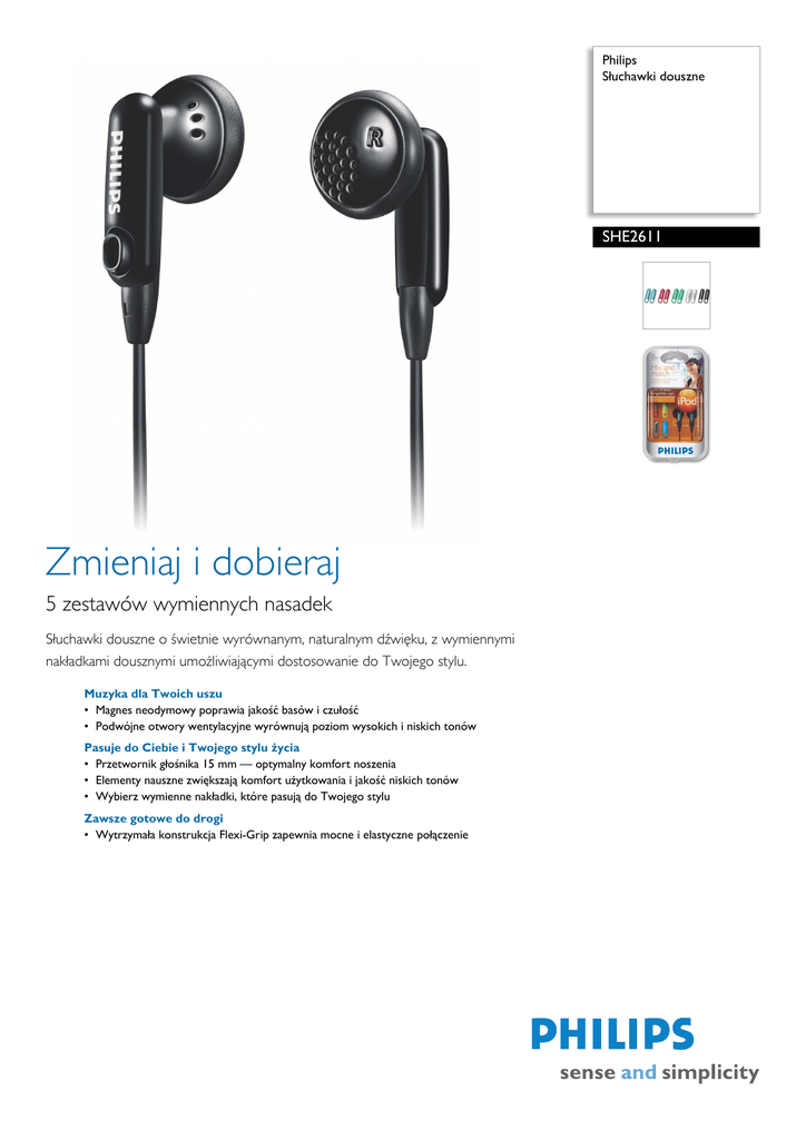 Philips Słuchawki douszne SHE2611 Zmieniaj i dobieraj 5 zestawów wymiennych nasadek Słuchawki douszne o świetnie wyrównanym, naturalnym dźwięku, z wymiennymi nakładkami dousznymi umożliwiającymi dostosowanie do Twojego stylu. Muzyka dla Twoich uszu • Magnes neodymowy poprawia jakość basów i czułość • Podwójne otwory wentylacyjne wyrównują poziom wysokich i niskich tonów Pasuje do Ciebie i Twojego stylu życia • Przetwornik głośnika 15 mm — optymalny komfort noszenia • Elementy nauszne zwiększają komfort użytkowania i jakość niskich tonów • Wybierz wymienne nakładki, które pasują do Twojego stylu Zawsze gotowe do drogi • Wytrzymała konstrukcja Flexi-Grip zapewnia mocne i elastyczne połączenie SHE2611/00 Słuchawki douszne Dane techniczne Zalety produktu Dźwięk • • • • • • • • • • System akustyczny: Otwarte Rodzaj magnesu: Neodymowy Cewka drgająca: Miedziana Membrana: Mylarowa kopułka Pasmo przenoszenia: 12 – 22 000 Hz Impedancja: 16 omów Maksymalna moc wejściowa: 50 mW Czułość: 106 dB Średnica głośnika: 15 mm Typ: Dynamiczny Możliwości połączeń • Połączenie przewodowe: Dwa równoległe, symetryczne • Długość kabla: 1,0 m • Złącze: 3,5 mm, stereo • Wykończenie złącza: Chromowane • Typ przewodu: Miedziana Karton wewnętrzny • EAN: 87 12581 32823 8 • Waga brutto: 0,442 kg • Karton wewnętrzny (L x szer. x wys.): 18,4 x 18 x 11 8 cm • Waga netto: 0,114 kg • Liczba opakowań konsumenckich: 6 • Ciężar opakowania: 0,328 kg Karton zewnętrzny • EAN: 87 12581 32824 5 • Waga brutto: 7,951 kg • Karton zewnętrzny (L x szer. x wys.): 39 x 38,2 x 51,2 cm • Waga netto: 1,824 kg • Liczba opakowań konsumenckich: 96 • Ciężar opakowania: 6,127 kg Wymiary opakowania • Wymiary opakowania (szer. x wys. x gł.): 10 x 17,5 x 2,8 cm • EAN: 87 12581 32822 1 • Waga brutto: 0,052 kg • Waga netto: 0,019 kg • Liczba produktów w zestawie: 1 • Rodzaj opakowania: Blister • Ciężar opakowania: 0 033 kg • Magnes neodymowy Neodym to materiał, który najlepiej nadaje się do wytwarzania silnego pola magnetycznego, dzięki czemu uzyskuje się większą czułość cewki przetwornika, lepszą charakterystykę tonów niskich i wyższą ogólną jakość dźwięku. Podwójne otwory wentylacyjne Specjalnie zaprojektowane otwory wyrównują poziom wysokich i niskich tonów w celu zrównoważenia odtwarzanego dźwięku. Przetwornik głośnika 15 mm Jest wystarczająco mały, aby zapewnić optymalny komfort, a zarazem wystarczająco duży, aby zapewnić wyraźny dźwięk bez zniekształceń. Ma idealne wymiary umożliwiające czerpanie przyjemności ze słuchania muzyki. Wygodne elementy nauszne Specjalny kształt i luksusowe materiały wykorzystane w elementach nausznych zapewniają idealne dopasowanie i maksymalny komfort. Zapobiegają także stratom sygnału i polepszają jakość niskich tonów. Kształt elementów nausznych umożliwia ich dokładne dopasowanie wokół ucha użytkownika. Wymienne nakładki Wybierz jeden z trzech zestawów wymiennych nakładek dousznych o różnych kolorach i stylistyce odpowiadającej Twojemu gustowi i nastrojowi. przewód z elastycznym przegubem Miękka i elastyczna część chroni połączenie przewodów przed uszkodzeniami, które mogą być spowodowane ich zginaniem. Data wydania 2008-01-30 © 2008 Koninklijke Philips Electronics N.V. Wszelkie prawa zastrzeżone. Wersja: 2.1.5 Dane techniczne mogą ulec zmianie bez powiadomienia. Znaki towarowe są własnością Koninklijke Philips Electronics N.V. lub własnością odpowiednich firm. 12 NC: 8670 000 28818 EAN: 87 12581 32822 1 www.philips.com