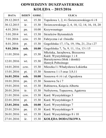 ODWIEDZINY DUSZPASTERSKIE KOLĘDA – 2015/2016 DATA DZIEŃ GODZ. ULICA 29.12.2015 wt. 15.30 Topolowa 1, 2, 4 i Świerczewskiego 6 i 8 30.12.2015 śr. 15.30 Świerczewskiego 2, 4, 10, 12, 14, 16, 18, 20 4.01.2016 pn. 10.00 Krzywoustego 5.01.2014 wt. 15.30 Strzelców Bytomskich 7.01.2016 czw. 15.30 Fabryczna i ul .Osiedle 8.01.2016 pt. 9.01.2016 sob. 11.01.2016 pn. 12.01.2016 wt. 14.01.2016 czw. 15.01.2016 pt. 16.01.2016 sob. 10.00 Sosnowa 4 i 6 i ul. Ogrodowa 18.01.2016 pn. 15.30 Sosnowa 5a i 7 19.01.2016 wt. 15.30 Rubinowa, Księcia Alberta 20.01.2016 śr. 15.30 Nefrytowa, Topazowa, Agatowa 21.01.2016 czw. 15.30 Kard. Wyszyńskiego 3 22.01.2016 pt. 15.30 Kard. Wyszyńskiego 5 23.01.2016 sob. 10.00 Kard. Wyszyńskiego 7 25.01.2016 pn. 15.30 Kard. Wyszyńskiego 9 26.01.2016 wt. 15.30 Kard. Wyszyńskiego 8 i 10 27.01.2016 śr. 15.30 KOLĘDA DODATKOWA 15.30 Gogolińska 17, 17a, 19, 19a, 21, 21a i 27 10.00 Gogolińska 7, 7a, 9, 11, 11a, 13 i 15 Młyńska, Jarzębowa, Brzozowa 15.30 Kard. Wyszyńskiego 1 i 4 Bursztynowa (blok i domki) 15.30 Henryk Pobożnego 15.30 Mieszka I i Władysława Łokietka 15.30 Sosnowa 1 i 5 oraz 3,9,11 ODWIEDZINY DUSZPASTERSKIE – KOLĘDA. C+M+B=2015/2016 CHRRISTUS MANSIONEM BENEDICA (CHRYSTUS MIESZKANIE BŁOGOSŁAWI) DRODZY PARAFIANIE! Pan Jezus powiedział kiedyś do Apostołów: Kto Was przyjmuje, Mnie przyjmuje (Mt 10, 40). Polecił im również: Gdy do jakiego domu wejdziecie, najpierw mówcie: Pokój temu domowi! Jeśli tam mieszka człowiek godny pokoju, wasz pokój spocznie na nim ( Łk 10,5-6 ). Przyjęcie kapłana z wizytą duszpasterską jest aktem publicznego wyznania wiary, a zarazem znakiem jedności i żywej więzi Kościoła Domowego to jest rodziny z Kościołem parafialnym, a tym samym diecezjalnym i powszechnym. Wizyta duszpasterska ma charakter małej liturgii sprawowanej w domowym sanktuarium. Im rodzina jest bardziej związana z Kościołem, im większy panuje w niej duch chrześcijański, im głębsza jest religijność, tym głębiej przeżywa spotkanie z oficjalnym sługą Kościoła. Uczyńmy wszystko, aby atmosfera tego spotkania była podniosła i serdeczna. W czasie tegorocznej kolędy zbierane będą dobrowolne ofiary przeznaczone na wymianę głównych drzwi wejściowych do kościoła. Wszystkim ofiarodawcom składamy serdeczne i gorące „Bóg zapłać ”. Dziękujemy wszystkim zaangażowanym w życie wspólnoty parafialnej, zarówno w wymiarze duchowym jak i materialnym. Parafia najlepiej ukazuje swoją tożsamość podczas niedzielnej Eucharystii. To obecność na niedzielnej Mszy świętej jest sprawdzianem naszej wiary. Życzymy aby pokój, który przynosi Jezus, wypełnił Wasze serca i Wasze rodziny. Niech spotkanie z Nim napełni Was nowym życiem, pełnym radości, miłości i błogosławieństwa. Oby nadchodzący Nowy Rok 2016 był czasem błogosławieństwa i szczególnej obecności Boga w życiu każdego z Was. Duszpasterze Parafii