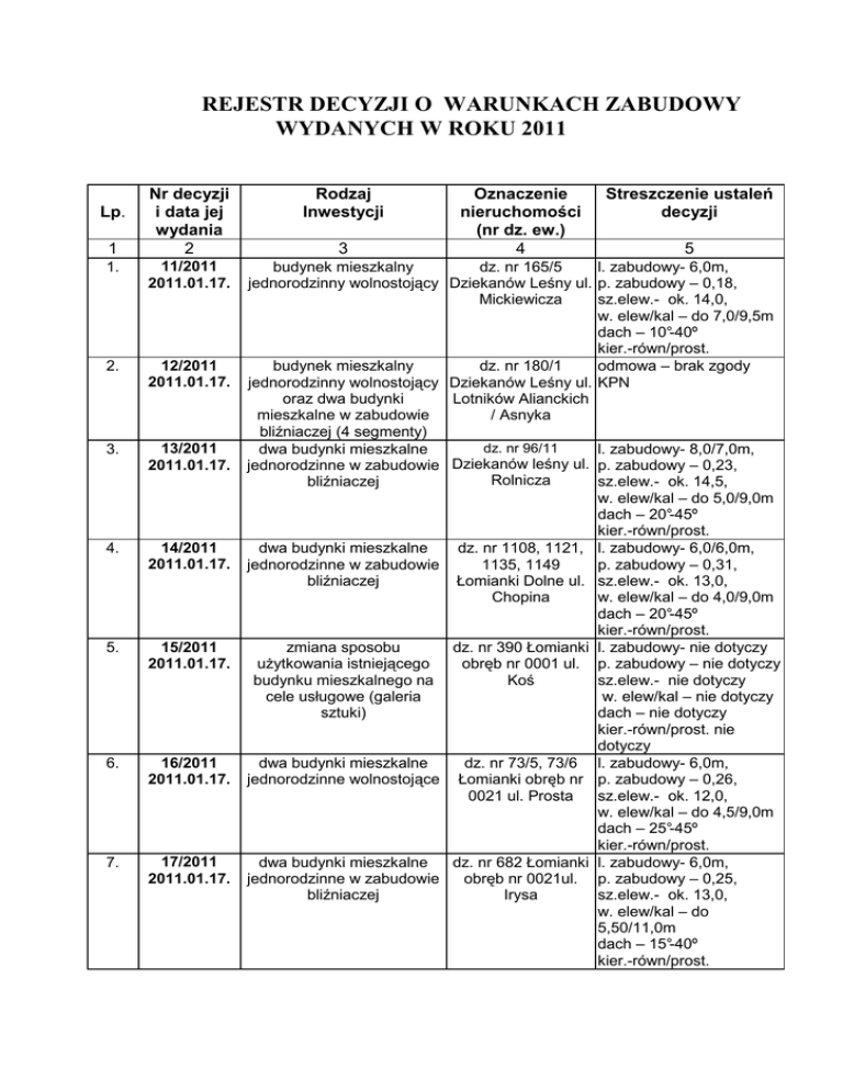 REJESTR DECYZJI O WARUNKACH ZABUDOWY WYDANYCH W ROKU 2011 Lp. 1 Nr decyzji i data jej wydania 2 1. 11/2011 2011.01.17. 2. 12/2011 2011.01.17. 3. 13/2011 2011.01.17. 4. 14/2011 2011.01.17. 5. 15/2011 2011.01.17. 6. 16/2011 2011.01.17. 7. 17/2011 2011.01.17. Rodzaj Inwestycji 3 Oznaczenie nieruchomości (nr dz. ew.) 4 Streszczenie ustaleń decyzji 5 budynek mieszkalny dz. nr 165/5 l. zabudowy- 6,0m, jednorodzinny wolnostojący Dziekanów Leśny ul. p. zabudowy – 0,18, Mickiewicza sz.elew.- ok. 14,0, w. elew/kal – do 7,0/9,5m dach – 10°-40º kier.-równ/prost. odmowa – brak zgody budynek mieszkalny dz. nr 180/1 jednorodzinny wolnostojący Dziekanów Leśny ul. KPN Lotników Alianckich oraz dwa budynki mieszkalne w zabudowie / Asnyka bliźniaczej (4 segmenty) dz. nr 96/11 dwa budynki mieszkalne l. zabudowy- 8,0/7,0m, jednorodzinne w zabudowie Dziekanów leśny ul. p. zabudowy – 0,23, Rolnicza bliźniaczej sz.elew.- ok. 14,5, w. elew/kal – do 5,0/9,0m dach – 20°-45º kier.-równ/prost. dwa budynki mieszkalne dz. nr 1108, 1121, l. zabudowy- 6,0/6,0m, jednorodzinne w zabudowie 1135, 1149 p. zabudowy – 0,31, bliźniaczej Łomianki Dolne ul. sz.elew.- ok. 13,0, Chopina w. elew/kal – do 4,0/9,0m dach – 20°-45º kier.-równ/prost. zmiana sposobu dz. nr 390 Łomianki l. zabudowy- nie dotyczy użytkowania istniejącego obręb nr 0001 ul. p. zabudowy – nie dotyczy budynku mieszkalnego na Koś sz.elew.- nie dotyczy cele usługowe (galeria w. elew/kal – nie dotyczy sztuki) dach – nie dotyczy kier.-równ/prost. nie dotyczy dwa budynki mieszkalne dz. nr 73/5, 73/6 l. zabudowy- 6,0m, jednorodzinne wolnostojące Łomianki obręb nr p. zabudowy – 0,26, 0021 ul. Prosta sz.elew.- ok. 12,0, w. elew/kal – do 4,5/9,0m dach – 25°-45º kier.-równ/prost. dwa budynki mieszkalne dz. nr 682 Łomianki l. zabudowy- 6,0m, jednorodzinne w zabudowie obręb nr 0021ul. p. zabudowy – 0,25, bliźniaczej Irysa sz.elew.- ok. 13,0, w. elew/kal – do 5,50/11,0m dach – 15°-40º kier.-równ/prost. 8. 18/2011 2011.01.17. rozbudowa istniejącego dz. nr 213/2 budynku mieszkalnego Łomianki obręb nr jednorodzinnego i budynku 0024 ul. Wiślana róg gospodarczego w celu ich Magnolii połączenia (łącznik) 9. 19/2011 2011.01.17. budynek mieszkalny dz. nr 676 Łomianki jednorodzinny wolnostojący obręb nr 0021 ul. Krokusa 10. 20/2011 2011.01.17. dwa budynki mieszkalne dz. nr 239/5 jednorodzinne wolnostojące Dziekanów Nowy ul. Poziomkowa 11. 21/2011 2011.01.17. budynek mieszkalny jednorodzinny wolnostojący 12. 22/2011 2011.01.17. budynek mieszkalny dz. nr 234 Dąbrowa jednorodzinny wolnostojący ul. Ofiar Katynia 13. 23/2011 legalizacja istniejącego dz. nr 965/1 i 966/1 2011.01.17. garażu dwustanowiskowego Dziekanów Polski ul. Rolnicza 14. 24/2011 2011.01.17. 15. 25/2011 2011.01.17. dobudowa do istniejącego budynku mieszkalnego części mieszkalnej 16 33/2011 2011-01-26 Budowa budynku mieszkalnego jednorodzinnego wolnostojącego, bez podpiwniczenia dz. nr 253/8 Łomianki obręb nr 0004 ul. Jaśminowa dwa budynki mieszkalne dz. nr 83/23 jednorodzinne w zabudowie Dziekanów Leśny ul. bliźniaczej Krasnoludków dz. nr 379 Łomianki obręb nr 0001 ul. Przyłuskiego Dz nr 148/2 Łomianki Dolne, ul. Brzegowa l. zabudowy- 6,0/8,0m, p. zabudowy – 0,20, sz.elew.- 9,5,0, w. elew/kal – do 5,0/7,0m dach – 25°-45º kier.-równ/prost. l. zabudowy- 6,0m, p. zabudowy – 0,27, sz.elew.- ok. 14,5, w. elew/kal – do 5,5/8,5m dach – 10°-35º kier.-równ/prost. l. zabudowy- 6,0m, p. zabudowy – 0,30, sz.elew.- ok. 13,0, w. elew/kal – do 5,0/9,5m dach – 20°-45º kier.-równ/prost. l. zabudowy- 6,0m, p. zabudowy – 0,23, sz.elew.- ok. 13,0, w. elew/kal – do 5,0/9,0m dach – 25°-45º kier.-równ/prost. l. zabudowy- 7,5m, p. zabudowy – 0,20, sz.elew.- ok. 13,5, w. elew/kal – do 4,5/9,5m dach – 20°-45º kier.-równ/prost. l. zabudowy- 8,0m, p. zabudowy – 0,37, sz.elew.- ok. 7,0, w. elew/kal – do 3,5/4,0m dach – 5°-45º kier.-równ/prost. l. zabudowy- 8,0m, p. zabudowy – 0,17, sz.elew.- ok. 11,0, w. elew/kal – do 4,5/9,0m dach – 10°-45º kier.-równ/prost. l. zabudowy- 6,0m, p. zabudowy – 0,28, sz.elew.- ok. 8,0, w. elew/kal – do 4,5/8,5m dach – 10°-45º kier.-równ/prost. l. zabudowy- 4,0m/50(32) p. zabudowy – 0,13 sz.elew.- ok. 10,0, w. elew/kal – do 4,0/8,5m dach – 30°-40º kier.-równ/prost. 17 35/2011 2011.01.27 zespół budynków mieszkalnych w zabudowie bliźniaczej i wolnostojącej dz. nr 278, 279/1, 279/2, 280/2 Łomianki Dolne ul. Kościelna Droga 18 36/2011 2011.01.31 Budowa budynku mieszkalnego jednorodzinnego wolnostojącego, dz. nr 240/4, 241/1 Sadowa ul. Borówkowa 19 37/2011 2011.02.01 rozbudowa i nadbudowa istniejącego warsztatu (pawilon rzemieślniczy) dz. nr 800/1 i 798 Łomianki obręb nr 0004 ul. Kolejowa 20 38/2011 2011.02.04 Budowa budynku mieszkalnego jednorodzinnego wolnostojącego, dz. nr 1173 Łomianki Dolne ul. Moniuszki 21 39/2011 2011.02.04 22 40/2011 2011.02.04 rozbudowa budynku mieszkalnego poprzez zabudowę istniejącego tarasu dz. nr 265 Łomianki obręb nr 0001 ul. Warszawska 23 41/2011 2011.02.04 Budowa budynku mieszkalnego jednorodzinnego wolnostojącego, dz. nr 3/10 Łomianki obręb nr 0023 ul. Wiślana 24 52/2011 2011.02.22 budowa siedliska gospodarstwa rolnego dz. nr 35, 36, 37/4, 37/5 Kępa Kiełpińska zmiana sposobu dz. nr 7 i 8 Dąbrowa użytkowania części ul. Łutza pensjonatowej na cele opieki dla osób starszych i przewlekle chorych l. zabudowy- 18,5m p. zabudowy – 0,22 sz.elew.- ok. 13,0, w. elew/kal – do 6,0/9,5m dach – 25°-40º kier.-równ/prost. l. zabudowy- 6,0m p. zabudowy – 0,21 sz.elew.- ok. 16,0, w. elew/kal – do 6,0/9,5m dach – 5°-40º kier.-równ/prost. l. zabudowy- 6,0m p. zabudowy – 0,27 sz.elew.- ok. 8,0, w. elew/kal – do 10/12m dach – 5°-40º kier.-równ/prost. l. zabudowy- 6,0m p. zabudowy – 0,22 sz.elew.- ok. 13,0, w. elew/kal – do 4,0/9,5m dach – 20°-40º kier.-r