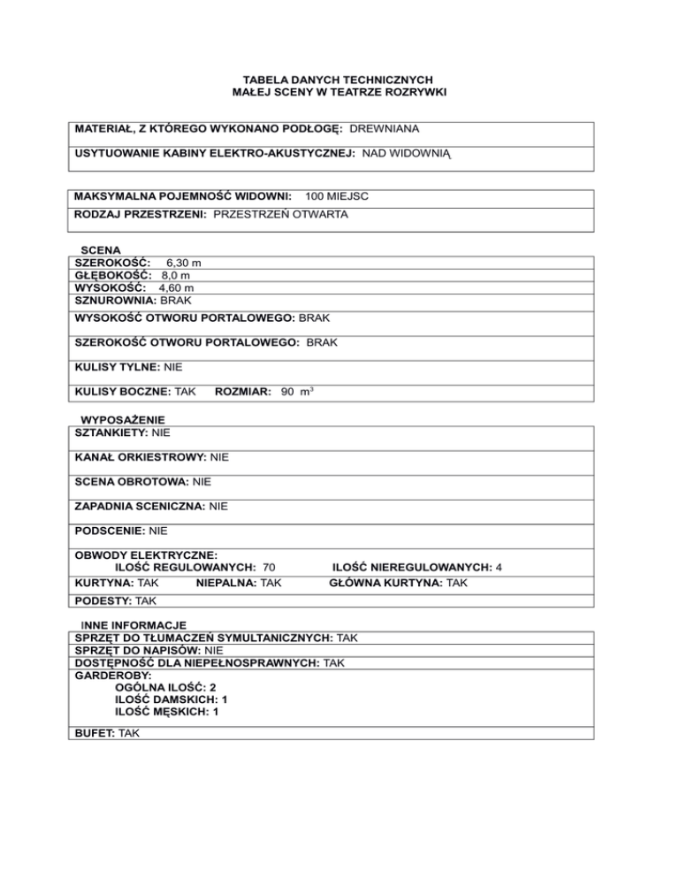 TABELA DANYCH TECHNICZNYCH MAŁEJ SCENY W TEATRZE ROZRYWKI MATERIAŁ, Z KTÓREGO WYKONANO PODŁOGĘ: DREWNIANA USYTUOWANIE KABINY ELEKTRO-AKUSTYCZNEJ: NAD WIDOWNIĄ MAKSYMALNA POJEMNOŚĆ WIDOWNI: 100 MIEJSC RODZAJ PRZESTRZENI: PRZESTRZEŃ OTWARTA SCENA SZEROKOŚĆ: 6,30 m GŁĘBOKOŚĆ: 8,0 m WYSOKOŚĆ: 4,60 m SZNUROWNIA: BRAK WYSOKOŚĆ OTWORU PORTALOWEGO: BRAK SZEROKOŚĆ OTWORU PORTALOWEGO: BRAK KULISY TYLNE: NIE KULISY BOCZNE: TAK ROZMIAR: 90 m3 WYPOSAŻENIE SZTANKIETY: NIE KANAŁ ORKIESTROWY: NIE SCENA OBROTOWA: NIE ZAPADNIA SCENICZNA: NIE PODSCENIE: NIE OBWODY ELEKTRYCZNE: ILOŚĆ REGULOWANYCH: 70 KURTYNA: TAK NIEPALNA: TAK ILOŚĆ NIEREGULOWANYCH: 4 GŁÓWNA KURTYNA: TAK PODESTY: TAK INNE INFORMACJE SPRZĘT DO TŁUMACZEŃ SYMULTANICZNYCH: TAK SPRZĘT DO NAPISÓW: NIE DOSTĘPNOŚĆ DLA NIEPEŁNOSPRAWNYCH: TAK GARDEROBY: OGÓLNA ILOŚĆ: 2 ILOŚĆ DAMSKICH: 1 ILOŚĆ MĘSKICH: 1 BUFET: TAK