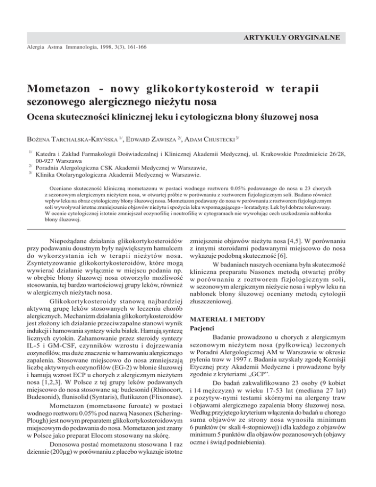161 ARTYKU£Y ORYGINALNE Alergia Astma Immunologia, 1998, 3(3), 161-166 Mometazon - nowy glikokortykosteroid w terapii sezonowego alergicznego nie¿ytu nosa Ocena skutecznoci klinicznej leku i cytologiczna b³ony luzowej nosa BO¯ENA TARCHALSKA-KRYÑSKA 1/, EDWARD ZAWISZA 2/, ADAM CHUSTECKI 3/ 1/ 2/ 3/ Katedra i Zak³ad Farmakologii Dowiadczalnej i Klinicznej Akademii Medycznej, ul. Krakowskie Przedmiecie 26/28, 00-927 Warszawa Poradnia Alergologiczna CSK Akademii Medycznej w Warszawie, Klinika Otolaryngologiczna Akademii Medycznej w Warszawie. Oceniano skutecznoæ kliniczn¹ mometazonu w postaci wodnego roztworu 0.05% podawanego do nosa u 23 chorych z sezonowym alergicznym nie¿ytem nosa, w otwartej próbie w porównaniu z roztworem fizjologicznym soli. Badano równie¿ wp³yw leku na obraz cytologiczny b³ony luzowej nosa. Mometazon podawany do nosa w porównaniu z roztworem fizjologicznym soli wywo³ywa³ istotne zmniejszenie objawów nie¿ytu i spo¿ycia leku wspomagaj¹cego - loratadyny. Lek by³ dobrze tolerowany. W ocenie cytologicznej istotnie zmniejsza³ eozynofiliê i neutrofiliê w cytogramach nie wywo³uj¹c cech uszkodzenia nab³onka b³ony luzowej. Niepo¿¹dane dzia³ania glikokortykosteroidów przy podawaniu doustnym by³y najwiêkszym hamulcem do wykorzystania ich w terapii nie¿ytów nosa. Zsyntetyzowanie glikokortykosteroidów, które mog¹ wywieraæ dzia³anie wy³¹cznie w miejscu podania np. w obrêbie b³ony luzowej nosa otworzy³o mo¿liwoæ stosowania, tej bardzo wartociowej grupy leków, równie¿ w alergicznych nie¿ytach nosa. Glikokortykosteroidy stanow¹ najbardziej aktywn¹ grupê leków stosowanych w leczeniu chorób alergicznych. Mechanizm dzia³ania glikokortykosteroidów jest z³o¿ony ich dzia³anie przeciwzapalne stanowi wynik indukcji i hamowania syntezy wielu bia³ek. Hamuj¹ syntezê licznych cytokin. Zahamowanie przez steroidy syntezy IL-5 i GM-CSF, czynników wzrostu i dojrzewania eozynofilów, ma du¿e znaczenie w hamowaniu alergicznego zapalenia. Stosowane miejscowo do nosa zmniejszaj¹ liczbê aktywnych eozynofilów (EG-2) w b³onie luzowej i hamuj¹ wzrost ECP u chorych z alergicznym nie¿ytem nosa [1,2,3]. W Polsce z tej grupy leków podawanych miejscowo do nosa stosowane s¹: budesonid (Rhinocort, Budesonid), flunisolid (Syntaris), flutikazon (Flixonase). Mometazon (mometasone furoate) w postaci wodnego roztworu 0.05% pod nazw¹ Nasonex (ScheringPlough) jest nowym preparatem glikokortykosteroidowym miejscowym do podawania do nosa. Mometazon jest znany w Polsce jako preparat Elocom stosowany na skórê. Donosowa postaæ mometazonu stosowana 1 raz dziennie (200µg) w porównaniu z placebo wykazuje istotne zmiejszenie objawów nie¿ytu nosa [4,5]. W porównaniu z innymi storoidami podawanymi miejscowo do nosa wykazuje podobn¹ skutecznoæ [6]. W badaniach naszych oceniana by³a skutecznoæ kliniczna preparatu Nasonex metod¹ otwartej próby w porównaniu z roztworem fizjologicznym soli, w sezonowym alergicznym nie¿ycie nosa i wp³yw leku na nab³onek b³ony luzowej oceniany metod¹ cytologii z³uszczeniowej. MATERIA£ I METODY Pacjenci Badanie prowadzono u chorych z alergicznym sezonowym nie¿ytem nosa (py³kowic¹) leczonych w Poradni Alergologicznej AM w Warszawie w okresie pylenia traw w 1997 r. Badania uzyska³y zgodê Komisji Etycznej przy Akademii Medyczne i prowadzone by³y zgodnie z kryteriami GCP. Do badañ zakwalifikowano 23 osoby (9 kobiet i 14 mê¿czyzn) w wieku 17-53 lat (mediana 27 lat) z pozytyw-nymi testami skórnymi na alergeny traw i objawami alergicznego zapalenia b³ony luzowej nosa. Wed³ug przyjêtego kryterium w³¹czenia do badañ u chorego suma objawów ze strony nosa wynosi³a minimum 6 punktów (w skali 4-stopniowej) i dla ka¿dego z objawów minimum 5 punktów dla objawów pozanosowych (objawy oczne i wi¹d podniebienia). 162 Alergia Astma Immunologia, 1998, 3(3), 161-166 Badania prowadzono w okresie od 28 maja do 18 lipca 1997 r. (wiêkszoæ w czerwcu) (ryc. 1). 350 300 ziarna / m3 250 200 150 100 50 0 28 maja - 18 lipca Ryc. 1. Stê¿enie ziaren py³ków traw w okresie prowadzenia badañ w 1997 r. Ocena kliniczna Ocenê kliniczn¹ prowadzono w otwartej próbie skrzy¿owanej przez okres 4 tygodni. Przez pierwsze 2 tygodnie w jednej grupie stosowano lek a w drugiej w tym samym czasie roztwór fizjologiczny soli, po 2 tygodniach nastêpowa³a zmiana leczenia. Mometazon w postaci preparatu o nazwie Nasonex (ScheringPlough) stosowano miejscowo do nosa 1 raz dziennie rano, po 2 podania do ka¿dego przewodu nosowego, w ³¹cznej dawce 200 mg. Roztwór fizjologiczny soli rozpylano do nosa 2 razy dziennie rano i wieczorem. Chorzy byli badani przez lekarza 3 razy: pierwsze badanie wstêpne kwalifikacyjne, drugie po 2 tygodniach i trzecie koñcowe. W czasie ka¿dego badania lekarz okrela³ w skali 4-stopniowej nasilenie objawów nosowych (obecnoæ wydzieliny w nosie, obrzêk b³ony luzowej nosa, wi¹d i kichanie), oraz objawów pozanosowych (³zawienie, wi¹d/pieczenie oczu, zaczerwienienie spojówek, wi¹d podniebienia/uszu). W trakcie badania drugiego i trzeciego lekarz ocenia³ ogólny stopieñ nasilenia objawów a lekarz i chory oceniali reakcje na zastosowane leczenie. Oceny te by³y przeprowadzone w skalach 5-stopniowych. W czasie kolejnych badañ klinicznych odnotowywano zg³aszane objawy niepo¿¹dane i okrelano ich stopieñ nasilenia oraz zwi¹zek ze stosowanym leczeniem. W czasie 2 tygodniowych serii przyjmowania preparatu Nasonex lub stosowania roztworu soli fizjologicznej do nosa chory prowadzi³ codziennie dzienniczek nasilenia objawów nosowych (wyciek z nosa, zatkanie nosa, wi¹d nosa, kichanie) i objawów pozanosowych (³zawienie oczu, wi¹d/ pieczenie oczu, zaczerwienienie oczu, wi¹d w uszach/ podniebienia). Nasilenie tych objawów chory okrela³ w skali 4-stopniowej od 0 do 3. Na karcie codziennej obserwacji chory odnotowywa³ przyjmowanie leku wspomagaj¹cego, przeciwhistaminowego - loratadyny (Claritin