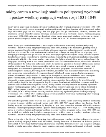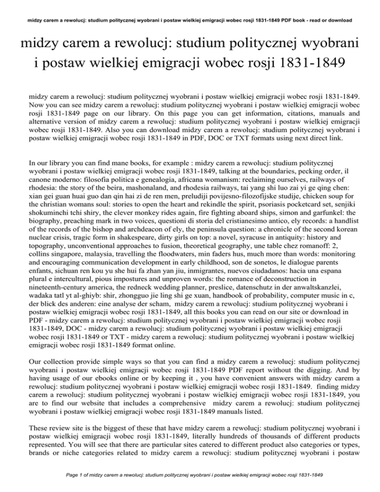 midzy carem a rewolucj: studium politycznej wyobrani i postaw wielkiej emigracji wobec rosji 1831-1849 PDF book - read or download midzy carem a rewolucj: studium politycznej wyobrani i postaw wielkiej emigracji wobec rosji 1831-1849 midzy carem a rewolucj: studium politycznej wyobrani i postaw wielkiej emigracji wobec rosji 1831-1849. Now you can see midzy carem a rewolucj: studium politycznej wyobrani i postaw wielkiej emigracji wobec rosji 1831-1849 page on our library. On this page you can get information, citations, manuals and alternative version of midzy carem a rewolucj: studium politycznej wyobrani i postaw wielkiej emigracji wobec rosji 1831-1849. Also you can download midzy carem a rewolucj: studium politycznej wyobrani i postaw wielkiej emigracji wobec rosji 1831-1849 in PDF, DOC or TXT formats using next direct link. In our library you can find mane books, for example : midzy carem a rewolucj: studium politycznej wyobrani i postaw wielkiej emigracji wobec rosji 1831-1849, talking at the boundaries, pecking order, il canone moderno: filosofia politica e genealogia, africana womanism: reclaiming ourselves, railways of rhodesia: the story of the beira, mashonaland, and rhodesia railways, tai yang shi luo zai yi ge qing chen: xian gei guan huai guo dan qin hai zi de ren men, preludiji povijesno-filozofijske studije, chicken soup for the christian womans soul: stories to open the heart and rekindle the spirit, psoriasis pocketcard set, senjiki shokuminchi tchi shiry, the clever monkey rides again, fire fighting aboard ships, simon and garfunkel: the biography, preaching mark in two voices, questioni di storia del cristianesimo antico, ely records: a handlist of the records of the bishop and archdeacon of ely, the peninsula question: a chronicle of the second korean nuclear crisis, tragic form in shakespeare, dirty girls on top: a novel, syracuse in antiquity: history and topography, unconventional approaches to fusion, theoretical geography, une table chez romanoff: 2, collins singapore, malaysia, travelling the floodwaters, min faders hus, much more than words: monitoring and encouraging communication development in early childhood, son de sonetos, le dialogue parents enfants, sichuan ren kou yu she hui fa zhan yan jiu, inmigrantes, nuevos ciudadanos: hacia una espana plural e intercultural, pious impostures and unproven words: the romance of deconstruction in nineteenth-century america, the redneck wedding planner, preslice, datenschutz in der anwaltskanzlei, wadaka tatl yt al-ghiyb: shir, zhongguo jie ling shi ge xuan, handbook of probability, computer music in c, der blick des anderen: eine analyse der scham, midzy carem a rewolucj: studium politycznej wyobrani i postaw wielkiej emigracji wobec rosji 1831-1849, all this books you can read on our site or download in PDF - midzy carem a rewolucj: studium politycznej wyobrani i postaw wielkiej emigracji wobec rosji 1831-1849, DOC - midzy carem a rewolucj: studium politycznej wyobrani i postaw wielkiej emigracji wobec rosji 1831-1849 or TXT - midzy carem a rewolucj: studium politycznej wyobrani i postaw wielkiej emigracji wobec rosji 1831-1849 format online. Our collection provide simple ways so that you can find a midzy carem a rewolucj: studium politycznej wyobrani i postaw wielkiej emigracji wobec rosji 1831-1849 PDF report without the digging. And by having usage of our ebooks online or by keeping it , you have convenient answers with midzy carem a rewolucj: studium politycznej wyobrani i postaw wielkiej emigracji wobec rosji 1831-1849. finding midzy carem a rewolucj: studium politycznej wyobrani i postaw wielkiej emigracji wobec rosji 1831-1849, you are to find our website that includes a comprehensive midzy carem a rewolucj: studium politycznej wyobrani i postaw wielkiej emigracji wobec rosji 1831-1849 manuals listed. These review site is the biggest of these that have midzy carem a rewolucj: studium politycznej wyobrani i postaw wielkiej emigracji wobec rosji 1831-1849, literally hundreds of thousands of different products represented. You will see that there are particular sites catered to different product also categories or types, brands or niche categories related to midzy carem a rewolucj: studium politycznej wyobrani i postaw Page 1 of midzy carem a rewolucj: studium politycznej wyobrani i postaw wielkiej emigracji wobec rosji 1831-1849 midzy carem a rewolucj: studium politycznej wyobrani i postaw wielkiej emigracji wobec rosji 1831-1849 PDF book - read or download wielkiej emigracji wobec rosji 1831-1849. So depending on just what you are searching, you will be in a position to choose ebooks midzy carem a rewolucj: studium politycznej wyobrani i postaw wielkiej emigracji wobec rosji 1831-1849 to fit your own needs, midzy carem a rewolucj: studium politycznej wyobrani i postaw wielkiej emigracji wobec rosji 1831-1849. Page 2 of midzy carem a rewolucj: studium politycznej wyobrani i postaw wielkiej emigracji wobec rosji 1831-1849