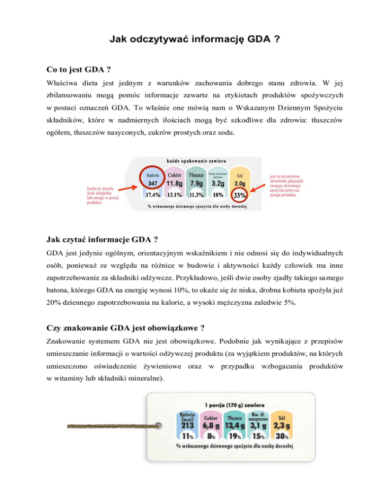Jak odczytywać informację GDA ? Co to jest GDA ? Właściwa dieta jest jednym z warunków zachowania dobrego stanu zdrowia. W jej zbilansowaniu mogą pomóc informacje zawarte na etykietach produktów spożywczych w postaci oznaczeń GDA. To właśnie one mówią nam o Wskazanym Dziennym Spożyciu składników, które w nadmiernych ilościach mogą być szkodliwe dla zdrowia: tłuszczów ogółem, tłuszczów nasyconych, cukrów prostych oraz sodu. Jak czytać informacje GDA ? GDA jest jedynie ogólnym, orientacyjnym wskaźnikiem i nie odnosi się do indywidualnych osób, ponieważ ze względu na różnice w budowie i aktywności każdy człowiek ma inne zapotrzebowanie za składniki odżywcze. Przykładowo, jeśli dwie osoby zjadły takiego sa mego batona, którego GDA na energię wynosi 10%, to okaże się że niska, drobna kobieta spożyła już 20% dziennego zapotrzebowania na kalorie, a wysoki mężczyzna zaledwie 5%. Czy znakowanie GDA jest obowiązkowe ? Znakowanie systemem GDA nie jest obowiązkowe. Podobnie jak wynikające z przepisów umieszczanie informacji o wartości odżywczej produktu (za wyjątkiem produktów, na których umieszczono oświadczenie żywieniowe oraz w przypadku wzbogacania produktów w witaminy lub składniki mineralne). Dlaczego oznakowanie GDA jest przydatne ? 1. umożliwia konsumentowi już na pierwszy rzut oka dostrzeżenie, jak dużo poszczególnych składników odżywczych jest zawartych w porcji danego produktu; 2. konsument od razu dowiaduje się ile procent całkowitego wskazanego dziennego spożycia na określony składnik odżywczy pokrywa porcja danego produktu żywnościowego; 3. daje możliwość stosowania na bieżąco zasad zbilansowanej diety i dokonywanie świadomych wyborów żywieniowych