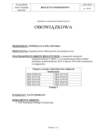 AVIATION Artur Trendak and Son 18.07.2016 BIULETYN SERWISOWY nr. 16-01 Zgodność z poniższym biuletynem jest OBOWIĄZKOWA PRZEDMIOT: INSPEKCJA ŁOŻA SILNIKA PRZYCZYNA: Inspekcja łoża silnika przed i po każdym locie. WIATRAKOWCE OBJĘTE BIULETYNEM: o numerach seryjnych zamieszczonych w tabeli 1; z wymienionym łożem silnika pomiędzy październikiem 2015 a lipcem 2016 lub trzymanych w magazynie; Numery seryjne wiatrakowców objętych biuletynem T&S G20815S T&S J21715S T&S J21315S T&S J21815S T&S J21415S T&S J21915S T&S J21515S T&S J22015S T&S J21615S T&S J21215S Tabela 1 WYKONAĆ: NATYCHMIAST DOKUMENTY OBJĘTE: IOT Instrukcja Obsługi Technicznej Strona 1 z 2 AVIATION Artur Trendak and Son 18.07.2016 BIULETYN SERWISOWY nr. 16-01 INSTRUKCJA WYKONANIA: 1. Przed i po każdym locie należy dokonać inspekcji łoża silnika w celu wykrycia pęknięć lub innych odkształceń. W razie wykrycia wiatrakowiec uziemić oraz skontaktować się z producentem w celu przywrócenia zdatności do lotu. Łoże Silnika 2. Odnotować w książce USP zgodność z biuletynem oraz skontaktować się z producentem w celu uzyskania dalszych instrukcji. Strona 2 z 2