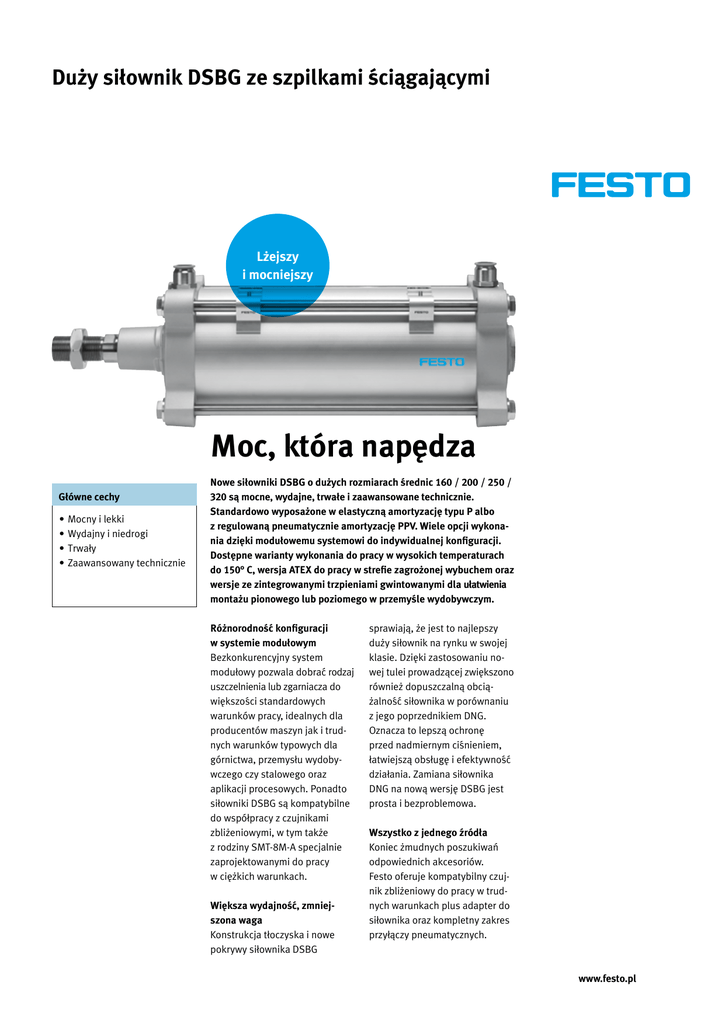 Duży siłownik DSBG ze szpilkami ściągającymi Lżejszy i mocniejszy Moc, która napędza Główne cechy • Mocny i lekki • Wydajny i niedrogi • Trwały • Zaawansowany technicznie Nowe siłowniki DSBG o dużych rozmiarach średnic 160 / 200 / 250 / 320 są mocne, wydajne, trwałe i zaawansowane technicznie. Standardowo wyposażone w elastyczną amortyzację typu P albo z regulowaną pneumatycznie amortyzację PPV. Wiele opcji wykonania dzięki modułowemu systemowi do indywidualnej konfiguracji. Dostępne warianty wykonania do pracy w wysokich temperaturach do 150° C, wersja ATEX do pracy w strefie zagrożonej wybuchem oraz wersje ze zintegrowanymi trzpieniami gwintowanymi dla ułatwienia montażu pionowego lub poziomego w przemyśle wydobywczym. Różnorodność konfiguracji w systemie modułowym Bezkonkurencyjny system modułowy pozwala dobrać rodzaj uszczelnienia lub zgarniacza do większości standardowych warunków pracy, idealnych dla producentów maszyn jak i trudnych warunków typowych dla górnictwa, przemysłu wydobywczego czy stalowego oraz aplikacji procesowych. Ponadto siłowniki DSBG są kompatybilne do współpracy z czujnikami zbliżeniowymi, w tym także z rodziny SMT-8M-A specjalnie zaprojektowanymi do pracy w ciężkich warunkach. Większa wydajność, zmniejszona waga Konstrukcja tłoczyska i nowe pokrywy siłownika DSBG sprawiają, że jest to najlepszy duży siłownik na rynku w swojej klasie. Dzięki zastosowaniu nowej tulei prowadzącej zwiększono również dopuszczalną obciążalność siłownika w porównaniu z jego poprzednikiem DNG. Oznacza to lepszą ochronę przed nadmiernym ciśnieniem, łatwiejszą obsługę i efektywność działania. Zamiana siłownika DNG na nową wersję DSBG jest prosta i bezproblemowa. Wszystko z jednego źródła Koniec żmudnych poszukiwań odpowiednich akcesoriów. Festo oferuje kompatybilny czujnik zbliżeniowy do pracy w trudnych warunkach plus adapter do siłownika oraz kompletny zakres przyłączy pneumatycznych. www.festo.pl Duży siłownik DSBG ze szpilkami ściągającymi Uniwersalny do wszystkich aplikacji: warianty wykonania siłownika DSBG Warianty konfiguracji siłownika DSBG Symbol Cecha/Właściwość Opis T Tłoczysko dwustronne Do pracy obustronnej, równowaga sił przy ruchu na wysuwie i powrotnym do zastosowania zewnętrznego zatrzymania siłownika R3 Wysoka odporność na korozję Wszystkie zewnętrzne powierzchnie spełniają wymagania odporności na korozję CRC 3 zgodnie ze standardem Festo 940 070. Tłoczysko wykonane jest ze stali korozjo- i kwasoodpornej. T1 Uszczelnienie na temperaturę Zakres temperatur: 0 … +120° C T4 Uszczelnienie na temperaturę Zakres temperatur: 0 … +150° C ...E Wydłużone tłoczysko – ...L Wydłuzony gwint + tłoczysko – V Centralne mocowanie wahliwe Mocowanie wachliwe, zamocowane centralnie między pokrywami B Zintegrowane trzpienie gwintowe • B1: w pokrywie przedniej i tylnej • B2: w pokrywie przedniej • B3: w pokrywie tylnej Ex4 Do strefy zagrożonej wybuchem •2GD wg Dyrektywy UE94/9 II 2GD c 120 °C (T4) –20°C ≤ Ta ≤ +60°C Akcesoria z jednego źródła Dobierz odpowiednie akcesoria - łatwo i szybko 20% lżejszy o zwiększonej wydajności dzięki nowej konstrukcji Opcjonalnie ze zintegowanymi trzepieniami gwintowanymi dla zastosowań w przemyśle wydobywczym. Uchwyt czujnika DASP-M4-160-A Nowe złącza QS-G-3/4-22 i przewody PAN-R-22x2-SW DSBG w akcji DSBG jako siłownik udarowy: siłownik o dużej średnicy tłoka do oczyszczania podajnika taśmowego w elektrowni zapewnia bezproblemowy transprt węgla do kotłów. Dopływ powietrza: odpowiednio dobrany napęd DSBG do regulacji klapy w celu optymalizacji zasilania dopływu powietrza w procesie spalania. Festo Sp. z o.o. Janki k/Warszawy ul. Mszczonowska 7 05-090 Raszyn Contact Center Tel. +48 22 711 41 00 Fax +48 22 711 41 02 e-mail: [email protected] www.festo.pl PSI178.1 pl 2015/10– Zastrzega się możliwość zmian Siłownik DSBG-160-300-PPVA-N3 Przystosowany dla czujników SMT-8M-A i pneumatycznej techniki połączeniowej