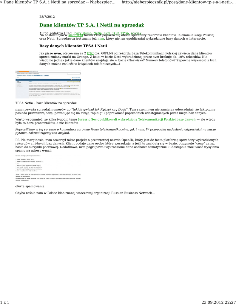 » Dane klientów TP S.A. i Netii na sprzedaż -- Niebezpiec... 1z1 http://niebezpiecznik.pl/post/dane-klientow-tp-s-a-i-netii-... 22:47 28/7/2012 Dane klientów TP S.A. i Netii na sprzedaż Autor: redakcja | Tagi: bazy, dump, Netia, nvm, TOR, TPSA, wyciek Na hostowanym w sieci TOR forum PBM pojawiła się oferta sprzedaży rekordów klientów Telekomunikacji Polskiej oraz Netii. Sprzedawcą jest znany już nvm, który nie raz upubliczniał wykradzione bazy danych w internecie. Bazy danych klientów TPSA i Netii Jak pisze nvm, oferowana za 2 BTC (ok. 60PLN) od rekordu baza Telekomunikacji Polskiej zawiera dane klientów sprzed zmiany marki na Orange. Z kolei w bazie Netii wykradzionej przez nvm brakuje ok. 10% rekordów. Nie wiadomo jednak jakie dane klientów znajdują się w bazie (Nazwiska? Numery telefonów? Zapewne większość z tych danych można znaleźć w książkach telefonicznych…) TPSA Netia – baza klientów na sprzedaż nvm rozważa sprzedaż numerów do “takich gwiazd jak Rydzyk czy Doda“. Tym razem nvm nie zamierza udowadniać, że faktycznie posiada prawdziwą bazę, powołując się na swoją “opinię” i poprawność poprzednich udostępnianych przez niego baz danych. Warto wspomnieć, że kilka tygodni temu Jurassic Sec opublikowali wykradzioną Telekomunikacji Polskiej bazę danych — ale wtedy była to baza pracowników, a nie klientów. Poprosiliśmy w tej sprawie o komentarz zarówno firmy telekomunikacyjne, jak i nvm. W przypadku nadesłania odpowiedzi na nasze pytania, zaktualizujemy ten artykuł. PS. Na marginesie, nvm otworzył także projekt o przewrotnej nazwie OpenID, który jest de facto platformą sprzedaży wykradzionych rekordów z różnych baz danych. Klient podaje dane osoby, której poszukuje, a jeśli te znajdują się w bazie, otrzymuje “cenę” za np. hasło do skrzynki pocztowej. Dodatkowo, nvm pogrupował wykradzione dane osobowe tematycznie i udostępnia możliwość wysyłania spamu na adresy e-mail: oferta spamowania Chyba rośnie nam w Polsce klon znanej warezowej organizacji Russian Business Network… 23.09.2012 22:27