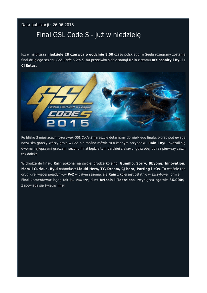 Data publikacji : 26.06.2015 Finał GSL Code S - już w niedzielę Już w najbliższą niedzielę 28 czerwca o godzinie 8.00 czasu polskiego, w Seulu rozegrany zostanie finał drugiego sezonu GSL Code S 2015. Na przeciwko siebie stanął Rain z teamu mYinsanity i Byul z CJ Entus. Po blisko 3 miesiącach rozgrywek GSL Code S nareszcie dotarliśmy do wielkiego finału, biorąc pod uwagę nazwiska graczy którzy grają w GSL nie można mówić tu o żadnym przypadku. Rain i Byul okazali się dwoma najlepszymi graczami sezonu, finał będzie tym bardziej ciekawy, gdyż obaj po raz pierwszy zaszli tak daleko. W drodze do finału Rain pokonał na swojej drodze kolejno: Gumiho, Sorry, Bbyong, Innovation, Maru i Curious. Byul natomiast: Liquid Hero, TY, Dream, CJ hero, Parting i sOs. To właśnie ten drugi grał więcej pojedynków PvZ w całym sezonie, ale Rain z kolei jest ostatnio w szczytowej formie. Finał komentować będą tak jak zawsze, duet Artosis i Tasteless, zwycięzca zgarnie 36.000$. Zapowiada się świetny finał! 28 czerwca NIEDZIELA - 8.00 czasu polskiego ● GSL Code S liquipedia ● Stream Autor: Fanek Liczba wyświetleń strony: 801 Data publikacji : 26.06.2015 Data modyfikacji : 27.06.2015 Tagi: eSport, Korea, GSL, GSL Code S Komentarz (0) dodaj komentarz Brak komentarzy dodaj komentarz Pozostałe nowości DreamHack Open: Valencia 2016 - Nerchio w półfinale - live! DreamHack Valencia to jedno z największych e-sportowych wydarzeń w Europie - dlatego nie mogło zabraknąć na nim StarCrafta II! W czasie rozgrywek 96 graczy będzie konkurować o 50 000 USD oraz 5 000 punktów WCS.Data publikacji: 16.07.20161 Aktualizacja 3.4 – Duże zmiany w rankingu StarCrafta II Na oficjalnym blogu Blizzarda pojawił się nowy wpis dotyczący tym razem zmian w rankingach: Ranking StarCrafta II jest areną dla niezwykle zaciętej rywalizacji. Do walki rusza wielu uczestników, ale tylko nieliczni awansują do ścisłej czołówki.Data publikacji: 03.07.20160 Rozpoczęcie trzeciego sezonu rankingowego 2016 Trzeci sezon tegorocznych rozgrywek ligowych w StarCrafta II uważamy za otwarty! Zresetowano pulę punktów premiowych oraz rankingi i przyznano nagrody za sezon drugi roku 2016.Data publikacji: 26.06.20160 Filmowy „Warcraft” już wkrótce w księgarniach! Powieść „Warcraft”, której wydanie zbiega się z polską premierą filmu „Warcraft. Początek” w reżyserii Duncana Jonesa, do księgarń trafi już 15 czerwca. Na kartach książki czytelnicy wkroczą w nowy wymiar emocji towarzyszących bohaterom fikcyjnych światów Azeroth i Draenor. Za sprawą Christie Golden, pisarki od lat cenionej przez fanów świata Warcraft, konflikt ludzi i orków nabierze jeszcze większej intensywności.Data publikacji: 13.06.20160 Blokada obecnego sezonu i darmowa zmiana nazwy postaci Jak czytamy na oficjalnym blogu Blizzarda: Obecny sezon rankingowy zbliża się ku końcowi i wkrótce zamknięte zostaną wszystkie ligi i dywizje. Kilka dni przed rozpoczęciem nowego sezonu, darmowa zmiana nazwy postaci w StarCraft II zostanie ponownie dodana do wszystkich kont, dla których funkcja ta nie jest obecnie dostępna.Data publikacji: 12.06.20160 Wszystkie nowości