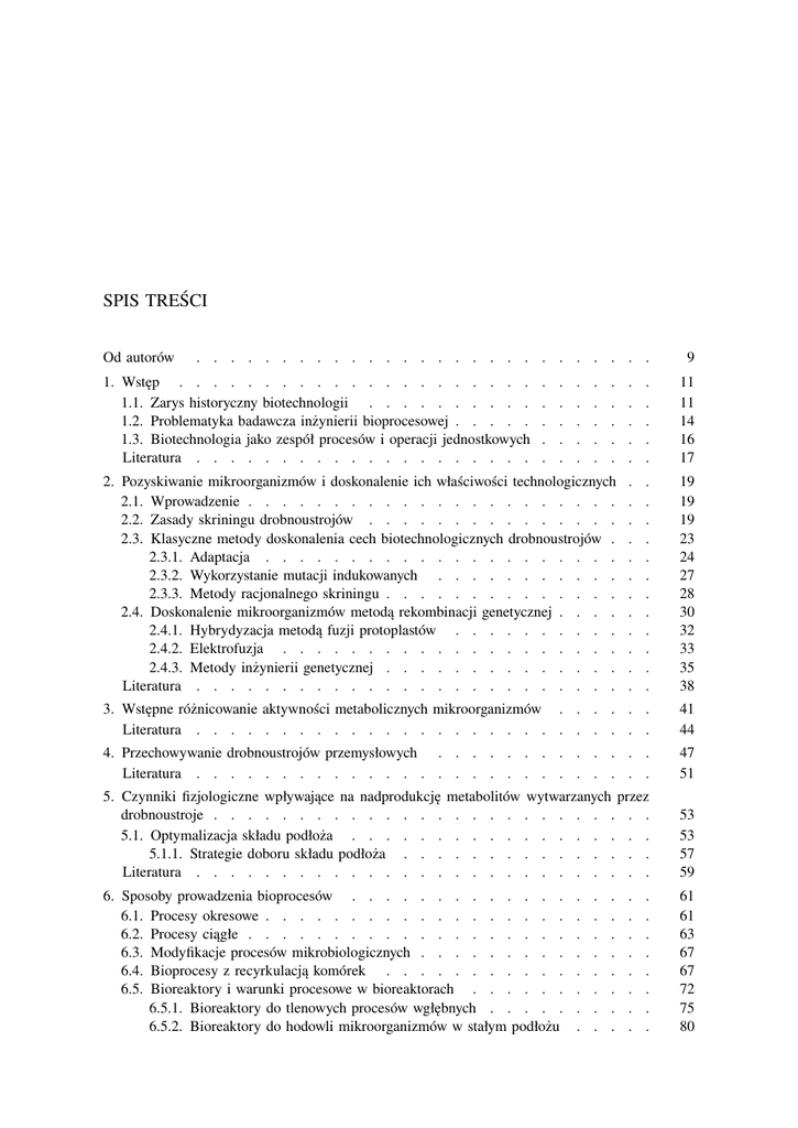 SPIS TREŚCI Od autorów . . . . . . . . . . . . . . . . . . . . . . . . . . . 1. Wstęp . . . . . . . . . . . . . . . . . . . . . 1.1. Zarys historyczny biotechnologii . . . . . . . . . . 1.2. Problematyka badawcza inżynierii bioprocesowej . . . . . 1.3. Biotechnologia jako zespół procesów i operacji jednostkowych Literatura . . . . . . . . . . . . . . . . . . . . . . . . . . . . . . . . . . . . . . . . 9 . . . . . . . . . . . . . . . 11 11 14 16 17 2. Pozyskiwanie mikroorganizmów i doskonalenie ich właściwości technologicznych 2.1. Wprowadzenie . . . . . . . . . . . . . . . . . . . . . . 2.2. Zasady skriningu drobnoustrojów . . . . . . . . . . . . . . . 2.3. Klasyczne metody doskonalenia cech biotechnologicznych drobnoustrojów . 2.3.1. Adaptacja . . . . . . . . . . . . . . . . . . . . . 2.3.2. Wykorzystanie mutacji indukowanych . . . . . . . . . . . 2.3.3. Metody racjonalnego skriningu . . . . . . . . . . . . . . 2.4. Doskonalenie mikroorganizmów metodą rekombinacji genetycznej . . . . 2.4.1. Hybrydyzacja metodą fuzji protoplastów . . . . . . . . . . 2.4.2. Elektrofuzja . . . . . . . . . . . . . . . . . . . . 2.4.3. Metody inżynierii genetycznej . . . . . . . . . . . . . . Literatura . . . . . . . . . . . . . . . . . . . . . . . . . . . . . . . . . . . . . . . . . . . . . . . . . 19 19 19 23 24 27 28 30 32 33 35 38 3. Wstępne różnicowanie aktywności metabolicznych mikroorganizmów . . . . . . Literatura . . . . . . . . . . . . . . . . . . . . . . . . . . . 41 44 4. Przechowywanie drobnoustrojów przemysłowych . . . . . . . . . . . . . Literatura . . . . . . . . . . . . . . . . . . . . . . . . . . . 47 51 5. Czynniki fizjologiczne wpływające na nadprodukcję drobnoustroje . . . . . . . . . . . . . . 5.1. Optymalizacja składu podłoża . . . . . . 5.1.1. Strategie doboru składu podłoża . . . Literatura . . . . . . . . . . . . . . . 53 53 57 59 metabolitów wytwarzanych przez . . . . . . . . . . . . . . . . . . . . . . . . . . . . . . . . . . . . . . . . . . . . . . . . 6. Sposoby prowadzenia bioprocesów . . . . . . . . . . . . . 6.1. Procesy okresowe . . . . . . . . . . . . . . . . . . 6.2. Procesy ciągłe . . . . . . . . . . . . . . . . . . . 6.3. Modyfikacje procesów mikrobiologicznych . . . . . . . . . 6.4. Bioprocesy z recyrkulacją komórek . . . . . . . . . . . 6.5. Bioreaktory i warunki procesowe w bioreaktorach . . . . . . 6.5.1. Bioreaktory do tlenowych procesów wgłębnych . . . . . 6.5.2. Bioreaktory do hodowli mikroorganizmów w stałym podłożu . . . . . . . . . . . . . . . . . . . . . . . . . . . . . . . . . . . . . . . . 61 61 63 67 67 72 75 80 6 Spis treści 6.5.3. Bioreaktory do procesów z biokatalizatorami unieruchomionymi . . . . 6.6. Procesy mieszania . . . . . . . . . . . . . . . . . . . . . . 6.6.1. Mieszanie i napowietrzanie w bioreaktorach . . . . . . . . . . . 6.6.2. Niekonwencjonalna metoda natleniania podłoża hodowlanego . . . . . 6.7. Sposoby likwidacji piany . . . . . . . . . . . . . . . . . . . . 6.8. Warunki aseptyczne w biotechnologii . . . . . . . . . . . . . . . . 6.9. Infekcje fagowe i sposoby ich zwalczania . . . . . . . . . . . . . . 6.10. Zasady optymalizacji bioprocesów . . . . . . . . . . . . . . . . 6.10.1. Regulacja pośrednia i bezpośrednia . . . . . . . . . . . . . 6.10.2. Osiągnięcia i perspektywy w zakresie kontroli bioprocesów . . . . . 6.10.3. Enzymatyczne i biosensorowe układy pomiarowe stosowane w kontroli przebiegu procesu technologicznego . . . . . . . . . . . . 6.10.4. Zmiana skali prowadzenia procesów biotechnologicznych . . . . . . 6.10.5. Automatyzacja i komputeryzacja procesów biotechnologicznych . . . 6.10.5.1. Zastosowanie algorytmów „sztucznej inteligencji” w bioprocesach . . . . . . . . . . . . . . . . . . . . . Literatura . . . . . . . . . . . . . . . . . . . . . . . . . . . 84 88 88 96 99 102 107 108 108 109 7. Wydzielanie i utrwalanie bioproduktów . . . . . . . . . . . . . . . . . 7.1. Metody i urządzenia stosowane do wydzielania produktów biotechnologicznych z biomas . . . . . . . . . . . . . . . . . . . . . . . . . . 7.2. Metody i urządzenia stosowane do zagęszczania płynów pohodowlanych . . . 7.3. Kierunki zastosowań technologii płynów nadkrytycznych w inżynierii bioprocesowej . . . . . . . . . . . . . . . . . . . . . . . . . . . 7.4. Zagęszczanie biomas . . . . . . . . . . . . . . . . . . . . . 7.5. Chłodzenie i zamrażanie biomas . . . . . . . . . . . . . . . . . 7.6. Liofilizacja . . . . . . . . . . . . . . . . . . . . . . . . . 7.7. Suszenie biomas . . . . . . . . . . . . . . . . . . . . . . . Literatura . . . . . . . . . . . . . . . . . . . . . . . . . . . 133 8. Procesy oczyszczania preparatów . . . . . . . . . . . . . 8.1. Techniki chromatograficzne . . . . . . . . . . . . . 8.1.1. Rodzaje technik chromatograficznych . . . . . . . 8.1.1.1. Chromatografia gazowa . . . . . . . . . 8.1.1.2. Chromatografia cieczowa . . . . . . . . . 8.1.1.3. Chromatografia kolumnowa . . . . . . . . 8.1.1.4. Chromatografia planarna . . . . . . . . . 8.1.1.5. Wysokosprawna chromatografia cieczowa . . . 8.1.1.6. Chromatografia fluidalna . . . . . . . . . 8.1.1.7. Spektrometria masowa . . . . . . . . . 8.2. Elektroforeza . . . . . . . . . . . . . . . . . . 8.2.1. Elektroforeza swobodna . . . . . . . . . . . . 8.2.2. Elektroforeza w nośnikach . . . . . . . . . . . 8.2.2.1. Elektroforeza bibułowa . . . . . . . . . 8.2.2.2. Elektroforeza na octanie celulozy . . . . . . 8.2.2.3. Elektroforeza żelowa . . . . . . . . . . 8.2.3. Izotachoforeza . . . . . . . . . . . . . . . 8.2.4. Elektroforeza kapilarna . . . . . . . . . . . . 8.2.5. Elektroforeza mikroskopowa . . . . . . . . . . . 8.2.6. Elektroforeza z równoczesnym działaniem siły odśrodkowej 169 169 171 171 173 173 178 180 182 183 184 185 185 186 186 187 192 192 193 193 . . . . . . . . . . . . . . . . . . . . . . . . . . . . . . . . . . . . . . . . . . . . . . . . . . . . . . . . . . . . . . . . . . . . . . . . . . . . . . . .
