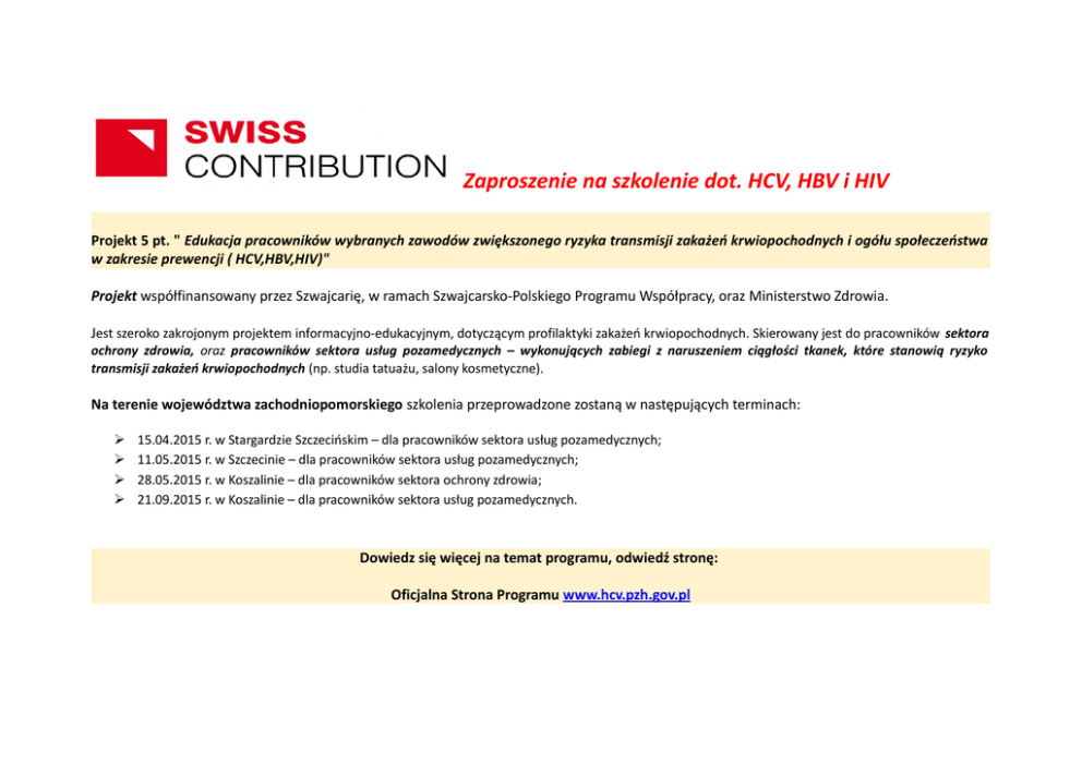 Zaproszenie na szkolenie dot. HCV, HBV i HIV Projekt 5 pt. " Edukacja pracowników wybranych zawodów zwiększonego ryzyka transmisji zakażeń krwiopochodnych i ogółu społeczeństwa w zakresie prewencji ( HCV,HBV,HIV)" Projekt współfinansowany przez Szwajcarię, w ramach Szwajcarsko-Polskiego Programu Współpracy, oraz Ministerstwo Zdrowia. Jest szeroko zakrojonym projektem informacyjno-edukacyjnym, dotyczącym profilaktyki zakażeń krwiopochodnych. Skierowany jest do pracowników sektora ochrony zdrowia, oraz pracowników sektora usług pozamedycznych – wykonujących zabiegi z naruszeniem ciągłości tkanek, które stanowią ryzyko transmisji zakażeń krwiopochodnych (np. studia tatuażu, salony kosmetyczne). Na terenie województwa zachodniopomorskiego szkolenia przeprowadzone zostaną w następujących terminach: 15.04.2015 r. w Stargardzie Szczecińskim – dla pracowników sektora usług pozamedycznych; 11.05.2015 r. w Szczecinie – dla pracowników sektora usług pozamedycznych; 28.05.2015 r. w Koszalinie – dla pracowników sektora ochrony zdrowia; 21.09.2015 r. w Koszalinie – dla pracowników sektora usług pozamedycznych. Dowiedz się więcej na temat programu, odwiedź stronę: Oficjalna Strona Programu www.hcv.pzh.gov.pl