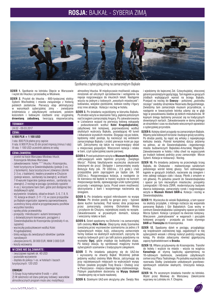 ROSJA: BAJKAŁ - SYBERIA ZIMĄ Spotkania z syberyjską zimą na zamarzniętym Bajkale DZIEŃ 1. Spotkanie na lotnisku Okęcie w Warszawie i wylot do Irkucka z przesiadką w Moskwie. atmosferę Irkucka. W międzyczasie możliwość zakupu mrożonek od ulicznych sprzedawców i wstąpienia na napoje rozgrzewające do irkuckich lokali. Następnie wizyta na jednym z lodowych „wesołych miasteczek”: lodowisko, wiejskie zjeżdżalnie, lodowe rzeźby i figury oraz inne atrakcje. Kolacja i nocleg w hotelu. i wjedziemy do bajecznej Zat. Cziwyrkujskiej, otoczonej górami porośniętymi gęstą tajgą. Tam kąpiele w gorących źródłach wybijających wprost na brzegu Bajkału. Przejazd na nocleg do Dawszy - położonej „pośrodku niczego” siedziby strażników Rezerwatu Barguzińskiego. Zwiedzimy tam zamarznięte muzeum przyrodnicze, a następnie w towarzystwie leśnika udamy się w głąb tajgi w poszukiwaniu śladów jej dzikich mieszkańców. W kopnym śniegu będziemy poruszać się na tradycyjnych drewnianych nartach. Zakwaterowanie w domu jednego ze strażników i czas na słuchanie wieczornych opowieści o syberyjskiej przyrodzie. DZIEŃ 2. Przylot do Irkucka - 600-tysięcznej stolicy Syberii Wschodniej i miasta związanego z historią polskich zesłańców. Pierwszy etap aklimatyzacji w warunkach syberyjskiej zimy - zwiedzanie śródmieścia z zabytkowymi cerkwiami, polskim DZIEŃ 3. Po śniadaniu wyjeżdżamy w kierunku Bajkału. kościołem i lodowymi rzeźbami oraz oryginalną Po drodze wizyta w skansenie Talcy, pięknie położonym drewnianą zabudową, tworzącą niepowtarzalną nad brzegiem zamarzniętej Angary. Po zakwaterowaniu w Listwiance wyjazd na pierwszą lodową eskapadę TERMINY: - poduszkowcem wzdłuż Kolei Krugobajkalskiej, 24.02 - 09.03.2017 zabytkowej linii kolejowej, poprowadzonej wzdłuż skalistych wybrzeży Bajkału, posiadającej 40 tuneli DZIEŃ 9. Kolejny dzień przygody na zamarzniętym Bajkale. CENA: i kilkanaście wysokich mostów. Ślizgając się po lodzie, Mijamy pola lodowych torosów i budzące grozę szczeliny. 6 900 PLN + 1 100 USD będziemy robić postoje, by nacieszyć się widokami Po drodze postój, by napić się whisky z największego I rata: 800 PLN płatne przy zapisie zamarzniętego Bajkału i zrobić pierwsze kroki po jego kieliszka świata. Pośród kompletnej dziczy jedziemy II rata: 6 900 PLN na 35 dni przed imprezą (minus I rata) tafli. Zatrzymamy się także na rozgrzewający obiad na północ, aż do Siewierobajkalska –legendarnego III rata: 1 100 USD uczestnik zabiera ze sobą u miejscowej gospodyni. Wieczorem kolacja i relaks miasta budowniczych Bajkalsko-Amurskiej Magistrali. w bani, czyli syberyjskiej saunie parowej. Zakwaterowanie w hotelu i kilka chwil na wypoczynek CENA ZAWIERA: po trudach lodowej podróży przez zamarznięte Morze DZIEŃ 4. Przed południem wizyta w Muzeum Bajkalskim, - przelot na trasie Warszawa-Moskwa-Irkuck; Syberii. Kolacja w restauracji . Nocleg. odkrywającym wiele tajemnic przyrody „Świętego Krasnojarsk-Moskwa-Warszawa Morza”. Później fakultatywnie wycieczka skuterami DZIEŃ 10. Po śniadaniu jedziemy na przeciwległy brzeg - zakwaterowanie: hotele *** Irkucku i Krasnojarsku, śnieżnymi do przyl. Skrippier i zamarzniętej osady Bajkału, do Chakusów - malowniczego sanatorium hotel turystyczny w Siewierobajkalsku (pokoje 2-os. Bolszyje Koty (ok. 70 USD/os.; 2,5 godz.) i/lub położonego wśród leśnej głuszy. Tam ozdrawiające z łazienkami), baza turystyczna w Listwiance (domki przejażdżka psim zaprzęgiem po tajdze (ok. 50 kąpiele w gorących źródłach, nacieranie się śniegiem i 2-3 os. z toaletami), kwatery prywatne w Chużyrze USD/os.). Rozgrzewająca kolacja, a następnie (o inne zabiegi radujące ciało i duszę. Piknik z omulem w (pokoje wieoos., sanitariaty na zewnątrz), w dniach ile kierowca nie będzie w trasie) wyjście na koncert roli głównej. Po południu powrót do Siewierobajkalska 7-8 warunki traperskie (pokoje wieloos., sanitariaty na miejscowego barda, opiewającego uroki syberyjskiej i spacer po tym niezwykłym miasteczku: prospekty zewnątrz), 2 noclegi w pociągu (przedziały sypialne przyrody i wiejskiego życia. Przed snem możliwość Leningradzki i 60-lecia ZSRR, modernistyczny budynek 4-os.); korzystanie bani (tam, gdzie jest dostępna) bez skorzystania z bani i wzajemnego nacierania się dworca kolejowego, zamarznięty rynek i rozgrzewająca dodatkowych opłat; śniegiem. wizyta w Muzeum Historii BAM-u. Kolacja i nocleg w - wyżywienie: śniadania, obiad w dniach: 3, 6, 7, 8, 9, Siewierobajkalsku. DZIEŃ 5. Po śniadaniu wyjazd mikrobusem na wyspę 10, kolacja w dniach: 2-11 i 13; w czasie przejazdów Olchon. Po drodze postój na gorące pozy typowe D ZIEŃ 11. Wycieczka do wioski Bajkalskoje, a tam spacer po Bajkale organizator zapewnia zaprowiantowanie, danie kuchni buriackiej. Pod koniec dnia przeprawa na skalisty przylądek, z którego roztacza się wspaniała uczestnicy biorą udział w przygotowywaniu posiłków przez zamarzniętą cieśninę Olchońskie Wrota panorama Bajkału i Gór Bajkalskich. Czas wolny w - wszystkie transfery i przybycie do Chużyru, największej osady na wyspie. centrum Siewierobajkalska i pożegnalny spacer po lodzie - opiekę pilota-przewodnika Zakwaterowanie w prywatnych domach, kolacja Morza Syberii. Kolacja i przejazd na dworzec kolejowy. - przejazdy: mikrobusami i autami terenowymi i wieczorny relaks w bani. Wieczorem „zaokrętowanie” w wagonach i początek z doświadczonymi kierowcami, pociągiem z kolejowej przygody - przejazdu po trasie słynnego Siewierobajkalska do Krasnojarska (przedziały 4-os. DZIEŃ 6. Dzień spędzamy na Olchonie i na zamarzniętej BAM-u i Transsybu do Krasnojarska. tafli cieśniny Małe Morze. Obejrzymy skałę Szamanka sypialne) - wycieczkę poduszkowcem wzdłuż Kolei Krugobajkalskiej - bilety wstępu do zwiedzanych obiektów i parków narodowych - ubezpieczenie KL 30 000 EUR, NN