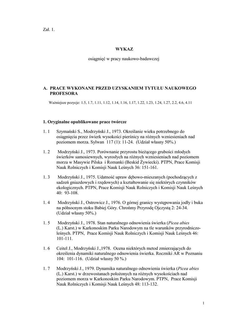 Zał. 1. WYKAZ osiągnięć w pracy naukowo-badawczej A. PRACE WYKONANE PRZED UZYSKANIEM TYTUŁU NAUKOWEGO PROFESORA WaŜniejsze pozycje: 1.5, 1.7, 1.11, 1.12, 1.14, 1.16, 1.17, 1.22, 1.23, 1.24, 1.27, 2.2, 4.6, 4.11 1. Oryginalne opublikowane prace twórcze 1. 1 Szymański S., Modrzyński J., 1973. Określanie wieku potrzebnego do osiągnięcia przez świerk wysokości pierśnicy na róŜnych wzniesieniach nad poziomem morza. Sylwan 117 (1): 11-24. (Udział własny 50%.) 1. 2 Modrzyński J., 1973. Porównanie przyrostu bieŜącego grubości młodych świerków samosiewnych, wyrosłych na róŜnych wzniesieniach nad poziomem morza w Masywie Pilska i Romanki (Beskid śywiecki). PTPN, Prace Komisji Nauk Rolniczych i Komisji Nauk Leśnych 36: 151-161. 1. 3 Modrzyński J., 1975. Udatność upraw dębowo-mieszanych (pochodzących z sadzeń gniazdowych i rzędowych) a kształtowanie się niektórych czynników ekologicznych. PTPN, Prace Komisji Nauk Rolniczych i Komisji Nauk Leśnych 40: 93-108. 1. 4 Modrzyński J., Ostrowicz J., 1976. O górnej granicy występowania jodły i buka na północnym stoku Babiej Góry. Chrońmy Przyrodę Ojczystą 2: 24-34. (Udział własny 50%.) 1. 5 Modrzyński J., 1978. Stan naturalnego odnowienia świerka (Picea abies (L.) Karst.) w Karkonoskim Parku Narodowym na tle warunków przyrodniczoleśnych. PTPN, Prace Komisji Nauk Rolniczych i Komisji Nauk Leśnych 46: 101-111. 1. 6 Ceitel J., Modrzyński J.,1978. Ocena niektórych metod zmierzających do określenia dynamiki naturalnego odnowienia świerka. Roczniki AR w Poznaniu 104: 101-116. (Udział własny 50 %.) 1. 7 Modrzyński J., 1979. Dynamika naturalnego odnowienia świerka (Picea abies (L.) Karst.) w drzewostanach połoŜonych na róŜnych wysokościach nad poziomem morza w Karkonoskim Parku Narodowym. PTPN, Prace Komisji Nauk Rolniczych i Komisji Nauk Leśnych 48: 113-132. 1 1. 8 Konys L., Modrzyński J., 1980. Zastosowanie metody współczynników ścieŜek do badania złoŜonych zaleŜności ekologicznych w leśnictwie. Roczniki AR w Poznaniu 123: 23-39. (Udział własny 50%.) 1. 9 Barzdajn W., Modrzyński J., 1981. Analiza wzrostu jednorocznych siewek świerkowych wyrosłych z nasion zebranych w karkonoskich drzewostanach nieznanego pochodzenia. Roczniki AR w Poznaniu 132: 3-16. (Udział własny 50%.) 1. 10 Modrzyński J., Niewiadowski T., 1983. Inwentaryzacja drzew zasługujących na miano pomników przyrody Świętokrzyskiego Parku Narodowego. Parki Narodowe i Rezerwaty Przyrody 4 (1): 59-70. Udział własny 50 %. 1. 11 Modrzyński J., Barzdajn W., 1985. Porównanie niektórych wskaźników wzrostowych, charakteryzujących wybrane populacje świerka (Picea abies (L.) Karst.) z Karkonoszy po pierwszym i piątym roku Ŝycia. Roczniki AR w Poznaniu160: 123-130. (Udział własny 50 %.) 1. 12 Modrzyński J., 1988. Nieprawidłowe zaleŜności między udziałem drewna późnego i przyrostem grubości drzewostanów świerkowych (Picea abies (L.) Karst.) w Karkonoskim Parku Narodowym a wzniesieniem nad poziom morza. Roczniki AR w Poznaniu 190: 103-123. 1. 13 Modrzyński J., 1988. Próba wyjaśnienia zakłóceń w rytmie zawiązywania pąków szczytowych u proweniencji świerka (Picea abies (L.) Karst.) z róŜnych wysokości nad poziomem morza. Roczniki AR w Poznaniu 190: 61-77. 1. 14 Modrzyński J., 1989. Środowiskowe przystosowanie i pochodzenie świerka pospolitego (Picea abies (L.) Karst.) w Karkonoskim Parku Narodowym. Roczniki AR w Poznaniu, rozprawy naukowe (praca habilitacyjna) 192: ss. 103. 1. 15 Modrzyński J., 1991. Pochodzenie i ekologiczna adaptacja świerka w Sudetach i Karpatach. W: Fibijanowski J., Jaworski A., Starzyk J., Wróblewska I., (red.) Zagospodarowanie lasów górskich. Synteza wyników badań naukowych przeprowadzonych w latach 1986-1990 w programie CPBR10.20. Akademia Rolnicza w Krakowie, Wydział Leśny: 56-65. 1. 16 Modrzyński J., 1995. Altitudinal Adaptation of Norway spruce (Picea abies (L.) Karst.) progeniens indicates small role of introduced Populations in the Karkonosze Mountains. Silvae Genetica 44: 70-75. (if: 0,491) 1. 17 Reich P.B., Oleksyn J., Modrzyński J., Tjoelker M.G., 1996. Evidence that longer needlle retention of spruce and pine populations at high elevations and high latitudes is largely a phenotypic response. Tree Physiology 16: 643-647. ((if: 1,740. Udział własny 20%.) 1. 18 Modrzyński J., Peter A., 1996. Stopień defoliacji wybranych drzewostanów świerkowych w Górach Bialskich i masywie ŚnieŜnika Kłodzkiego. Sylwan 140 (12): 31-40. (Udział własny 80%.) 1. 19 Robakowski P., Modrzyński J., 1997. Adaptation of seedling growth to altitude: a case of Norway spruce from the Polish Sudety Mountains. Instituto Pirenaico de Ecologia, Pirineos 149/150: 81-89. (Udział własny 30%.) 2 1. 20 Modrzyński J., Jakubiszak K., 1997. Stopień defoliacji wybranych drzewostanów świerkowych w Tatrach i Beskidzie Wysokim. Sylwan 141 (1): 67-76. (Udział własny 80%.) 1. 21 Oleksyn J., Modrzyński J., Prus-Głowacki W., Reich P. B., Tjoelker M. G., 1997. MoŜliwości zastosowania istniejących doświadczeń leśnych do poznania ekofizjologicznych i genetycznych mechanizmów interakcji drzew i środowiska. Sylwan 141 ( 4): 103-117. (Udział własny 20%.) 1. 22 Modrzyński J., Prus-Głowacki W., 1998. Isoenzymatic variability in Polish populations of Norway spruce (Picea abies /L./ Karst.) in the IUFRO-1972 provenance trial. Acta Societatis Botanicorum Poloniae. 67 (1): 75-82. (if: 0,233. Udział własny 70%.) 1. 23 Oleksyn J., Modrzyński J., Tjoelker M. G., śytkowiak R., Reich P. B., Karolewski P., 1998. Growth and physiology of Picea abies populations from elevational transects: common garden evidence for altitudinal ecotypes and cold adpatation. Functional Ecology 12: 573-590. (if: 1,861. Udział własny 30%.) 1. 24 Pukacki P. M., Modrzyński J., 1998. The influence of ultraviolet-B radiation on the growth, pigment production and chlorophyll fluorescense of Nor