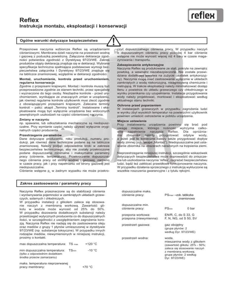1 Reflex Instrukcja montażu, eksploatacji i konserwacji Ogólne warunki dotyczące bezpieczeństwa Przeponowe naczynia wzbiorcze Reflex są urządzeniami ciśnieniowymi. Membrana dzieli naczynie na przestrzeń wodną i gazową z poduszką powietrzną. Załączona deklaracja zgodności potwierdza zgodność z Dyrektywą 97/23/WE. Zakres produktów objęty deklaracją znajduje się w deklaracji. Wybrana specyfikacja techniczna spełniająca podstawowe wymogi bezpieczeństwa załącznika I Dyrektywy 97/23/WE znajduje się na tabliczce znamionowej, względnie w deklaracji zgodności. Montaż, uruchomienie, kontrola przed uruchomieniem, regularna konserwacja Zgodnie z przepisami krajowymi. Montaż i kontrola muszą być przeprowadzone zgodnie ze stanem techniki, przez specjalistę i wyznaczone do tego osoby. Niezbędne kontrole - przed uruchomieniem, wynikające ze znaczących zmian w urządzeniu, jak również regularne kontrole użytkownik musi zlecić zgodnie z obowiązującymi przepisami krajowymi. Zalecane terminy kontroli – patrz: akapit „Terminy kontroli”. Instalowane i eksploatowane mogą być wyłącznie urządzenia bez widocznych zewnętrznych uszkodzeń na części ciśnieniowej naczynia. Zmiany w naczyniu np. spawanie, lub odkształcenia mechaniczne są niedopuszczalne. Przy wymianie części należy używać wyłącznie oryginalnych części producenta. Przestrzeganie parametrów Dane dotyczące producenta, roku produkcji, numeru produkcji, jak również dane techniczne podane są na tabliczce znamionowej. Należy podjąć odpowiednie kroki w zakresie bezpieczeństwa technicznego, aby nie zostały przekroczone podane dopuszczalne minimalne i maksymalne parametry pracy (ciśnienie, temperatura). Przekroczenie dopuszczalnego ciśnienia pracy od strony wodnej i gazowej, zarówno w czasie pracy, jak i przy napełnianiu od strony gazowej jest niedopuszczalne. Ciśnienie wstępne p0 w żadnym wypadku nie może przekro- czyć dopuszczalnego ciśnienia pracy. W przypadku naczyń o dopuszczalnym ciśnieniu pracy powyżej 4 bar ciśnienie wstępne nie może wynosić więcej niż 4 bary w czasie magazynowania i transportu. Zabezpieczenie antykorozyjne Naczynia Reflex są produkowane ze stali, pokryte na zewnątrz powłoką, a wewnątrz niezabezpieczone. Nie została przewidziana dodatkowa warstwa na zużycie (dodatek antykorozyjny). Naczynia mogą mieć zastosowanie wyłącznie w układach zamkniętych z wodą niekorozyjną, nieagresywną chemicznie i nietrującą. W trakcie eksploatacji należy minimalizować dostęp tlenu z powietrza do układu grzewczego czy chłodniczego w wyniku przenikania czy uzupełniania. Instalacje przygotowania wody należy projektować, montować i eksploatować według aktualnego stanu techniki. Ochrona przed poparzeniem W instalacjach grzewczych w przypadku zagrożenia ludzi w wyniku zbyt wysokich temperatur na powierzchni użytkownik powinien umieścić ostrzeżenie w pobliżu urządzenia. Miejsce ustawienia Przy instalowaniu urządzenia powinno się brać pod uwagę miejsce, którego nośność wytrzyma całkowite napełnienie naczynia Reflex. Dla opróżniania zbiornika należy przygotować odpływ wody, a jeżeli jest to konieczne należy także przygotować dopływ wody zimnej (zob. akapit „Montaż”). Niedopuszczalne jest ustawianie zbiornika na obszarach narażonych na trzęsienia ziemi. Nieprzestrzeganie niniejszej instrukcji, szczególnie wskazówek dotyczących bezpieczeństwa może doprowadzić do zniszczenia lub uszkodzenia naczynia ‘reflex’, zagrażać bezpieczeństwu ludzi, bądź też zakłócać prawidłowe funkcjonowanie naczynia. W przypadku działania sprzecznego z instrukcją wykluczone są wszelkie roszczenia gwarancyjne i z tytułu rękojmi. Zakres zastosowania / parametry pracy Naczynia Reflex przeznaczone są do stabilizacji ciśnienia i wyrównywania pojemności w zamkniętych układach grzewczych, solarnych i chłodniczych. W przypadku instalacji z glikolem zaleca się stosowanie naczyń z membraną workową. Zawartość glikolu w wodzie może wynosić od 25% do 50%. W przypadku dozowania dodatkowych substancji należy przestrzegać wytycznych producenta co do dopuszczalnych ilości, w szczególności z uwzględnieniem zagrożenia korozją. Naczynia Reflex nie nadają się do zastosowania oleju oraz mediów z grupy 1 płynów umieszczonej w dyrektywie 97/23/WE (np. substancje toksyczne). W przypadku innych rodzajów mediów, niewymienionych w niniejszej instrukcji, prosimy o kontakt. max dopuszczalna temperatura: TS min dopuszczalna temperatura: (tylko z odpowiednim dodatkiem środka przeciw zamarzaniu) max TSmin maks. temperatura nieprzerwanej pracy membrany: t +120°C -10°C +70 °C dopuszczalne maks. ciśnienie pracy: PSmax→zob. tabliczka znamionowa dopuszczalne min. ciśnienie pracy: PSmin przepona workowa: przepona (niewymienna): EN/R, C, do S 33, G F, N, NG, od S 50, SV przestrzeń gazowa: gaz obojętny 0 bar (grupa płynów: 2 według Dyr. 97/23/WE) przestrzeń wodna:woda, mieszanina wody z glikolem ( zawartość glikolu: 25% - 50%; zaleca się stosowanie naczyń z membraną workową; grupa płynów: 2 według Dyr. 97/23/WE) Reflex 2 Montaż Naczynie należy umieścić w pomieszczeniu nienarażonym na przemarzanie, w sposób umożliwiający kontrolę urządzenia z każdej strony, dostęp do zaworu odcinającego oraz opróżniającego po stronie wodnej, jak również odczytanie tabliczki znamionowej. Należy zamontować zawór odcinający z funkcją opróżniania do celów konserwacji (należy zamówić dodatkowo). W przypadku większych instalacji możliwe jest również rozdzielenie funkcji opróżniania i odcięcia. Przewody podłączeniowe nie mogą być naprężone. Niedopuszczalne jest podłączanie dodatkowych przewodów rurowych lub armatury. Rury wzbiorcze należy zwymiarować i zainstalować zgodnie z przepisami krajowymi, w Niemczech zgodnie z wymogami DIN EN 12828. Niezbędne jest zapewnienie warunkó