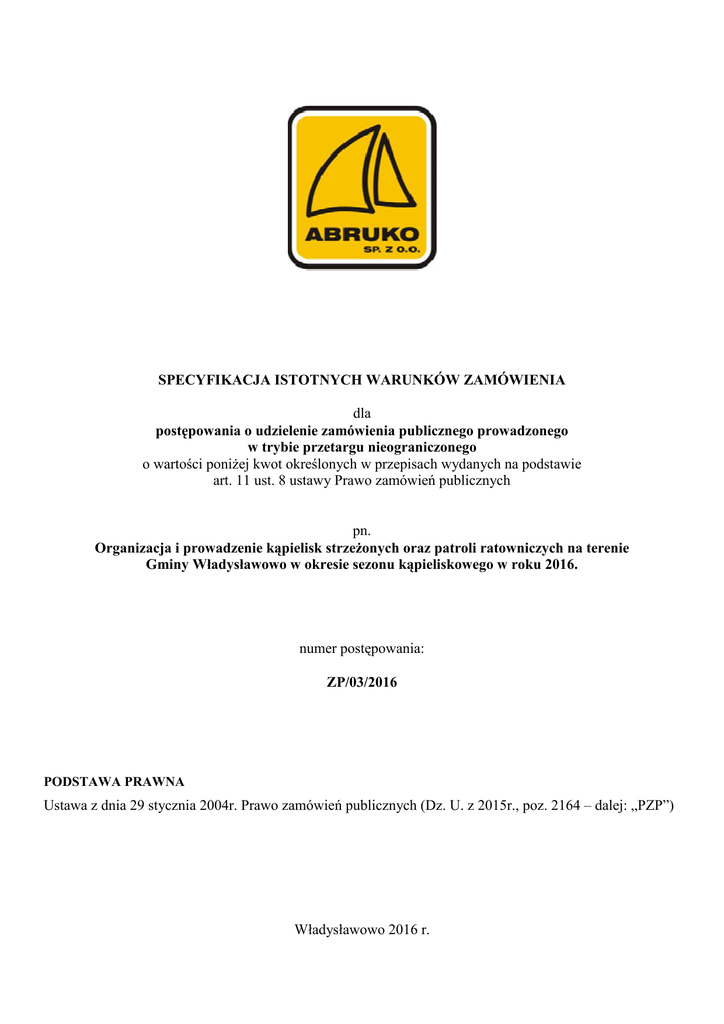 SPECYFIKACJA ISTOTNYCH WARUNKÓW ZAMÓWIENIA dla postępowania o udzielenie zamówienia publicznego prowadzonego w trybie przetargu nieograniczonego o wartości poniżej kwot określonych w przepisach wydanych na podstawie art. 11 ust. 8 ustawy Prawo zamówień publicznych pn. Organizacja i prowadzenie kąpielisk strzeżonych oraz patroli ratowniczych na terenie Gminy Władysławowo w okresie sezonu kąpieliskowego w roku 2016. numer postępowania: ZP/03/2016 PODSTAWA PRAWNA Ustawa z dnia 29 stycznia 2004r. Prawo zamówień publicznych (Dz. U. z 2015r., poz. 2164 – dalej: „PZP”) Władysławowo 2016 r. Postępowanie nr ZP/03/2016 SPIS TREŚCI: I. Instrukcja dla Wykonawców II. Opis przedmiotu zamówienia III. Istotne postanowienia umowy w sprawie zamówienia publicznego IV. Wzory formularzy i oświadczeń Strona 2 z 29 Postępowanie nr ZP/03/2016 CZĘŚĆ I INSTRUKCJA DLA WYKONAWCÓW Strona 3 z 29 Postępowanie nr ZP/03/2016 NAZWA I ADRES ZAMAWIAJĄCEGO: ABRUKO Sp. z o.o. ul. Gdańska 78 84-120 Władysławowo tel. 058 674-11-41 fax. 058 674-00-64 www.abruko.pl NIP REGON KRS kapitał zakładowy I. 587-020-16-47 190560349 0000092245 1.300.000,00 zł TRYB UDZIELENIA ZAMÓWIENIA PUBLICZNEGO Niniejsze postępowanie o udzielenie zamówienia publicznego prowadzone jest w trybie przetargu nieograniczonego, na podstawie ustawy z dnia 29 stycznia 2004 r. Prawo zamówień publicznych (Dz. U. z 2015r., poz. 2164 – dalej: „PZP”). II. OPIS PRZEDMIOTU ZAMÓWIENIA 1. Przedmiotem niniejszego zamówienia publicznego jest usługa polegająca na organizacji i prowadzeniu 15 kąpielisk strzeżonych oraz pełnienie 9 patroli ratowniczych na terenie Gminy Władysławowo w okresie sezonu kąpieliskowego w roku 2016. 2. Szczegółowy zakres przedmiotu zamówienia wskazuje Część II niniejszej SIWZ. 3. Kod Wspólnego Słownika Zamówień (CPV) – 75252000-7 – Służby ratownicze III. TERMIN REALIZACJI ZAMÓWIENIA 1). Termin realizacji zamówienia: - organizacja i prowadzenie 15 kąpielisk od 01 lipca 2016 r. do 31 sierpnia 2016 r. w godz. od 09:00 do 17:00; - organizacja i prowadzenie patroli ratowniczych od 25 czerwca 2016 r. do 15 września 2016 r. w godz. od 09:00 do 17:00. Dokładne terminy organizacji i prowadzenia poszczególnych patroli ratowniczych wskazano w części II SIWZ – Opis przedmiotu zamówienia. IV. INFORMACJE DOTYCZĄCE OFERT CZĘŚCIOWYCH Zamawiający nie dopuszcza składanie ofert częściowych. V. INFORMACJE DOTYCZĄCE OFERT WARIANTOWYCH Zamawiający nie dopuszcza składania ofert wariantowych. Strona 4 z 29 Postępowanie nr ZP/03/2016 VI. ZAMÓWIENIA UZUPEŁNIAJĄCE Zamawiający nie przewiduje udzielenia zamówień uzupełniających. VII. INFORMACJE O WYKONAWCACH, Z KTÓRYMI ZOSTANIE ZAWARTA UMOWA RAMOWA Nie dotyczy. VIII. INFORMACJE O AUKCJI ELEKTRONICZNEJ Zamawiający nie przewiduje akcji elektronicznej. IX. WARUNKI UDZIAŁU W POSTĘPOWANIU ORAZ OPIS SPOSOBU DOKONYWANIA OCENY ICH SPEŁNIANIA 1. W postępowaniu mogą brać udział wykonawcy, którzy spełniają warunki udziału w postępowaniu, o których mowa w art. 22 ust. 1 PZP: 1.1. Posiadają uprawnienia do wykonywania określonej działalności lub czynności, jeżeli przepisy prawa nakładają obowiązek ich posiadania: Posiadają zgodę ministra właściwego ds. wewnętrznych, o której mowa w art. 12 ust. 1 ustawy z dnia 18 sierpnia 2011 r. o bezpieczeństwie osób przebywających na obszarach wodnych (Dz.U. z 2011 r. Nr 208, poz. 1240 z późn. zm.) uprawniającą do wykonywania ratownictwa wodnego. Ocena spełniania ww. warunku będzie dokonywana na zasadzie spełnia/nie spełnia. 1.2. Posiadają wiedzę i doświadczenie potrzebne do wykonania zamówienia: W okresie ostatnich trzech lat przed upływem terminu składania ofert, a jeżeli okres prowadzenia działalności jest krótszy – w tym okresie, wykonali usługi polegające na zorganizowaniu i nieprzerwanym prowadzeniu jednocześnie co najmniej 7 kąpielisk na wodach przybrzeżnych w okresie jednego sezonu letniego zgodnie z wymogami obowiązującego prawa oraz usługę polegającą na zorganizowaniu i prowadzeniu 1 patrolu ratowniczego w okresie sezonu letniego. 1.3. Dysponują odpowiednim potencjałem technicznym oraz osobami zdolnymi do wykonania zamówienia. Zamawiający nie ustanawia warunku w ww. zakresie. 1.4. Znajdują się w sytuacji ekonomicznej i finansowej zapewniającej wykonanie zamówienia: Zamawiający nie ustanawia warunku w ww. zakresie. 2. W postępowaniu mogą brać udział wykonawcy nie niepodlegający wykluczeniu z postępowania na podstawie art. 24 ust. 1 PZP. Ocena spełniania ww. warunku będzie dokonywana na zasadzie spełnia/nie spełnia. X. WYKAZ OŚWIADCZEŃ LUB DOKUMENTÓW, JAKIE MAJĄ DOSTARCZYĆ WYKONAWCY W CELU POTWIERDZENIA SPEŁANIANIA WARUNKÓW UDZIAŁU W POSTĘPOWANIU ORAZ BRAKU PODSTAW DO WYKLUCZENIA Strona 5 z 29 Postępowanie nr ZP/03/2016 1. W celu potwierdzenia spełniania warunków udziału w postępowaniu, o których mowa pkt IX.1, wykonawcy obowiązani są załączyć do oferty następujące dokumenty lub oświadczenia: 1.1. Decyzję ministra właściwego ds. wewnętrznych, o której mowa w art. 12 ust. 1 ustawy z dnia 18 sierpnia 2011 r. o bezpieczeństwie osób przebywających na obszarach wodnych (Dz.U. z 2011 r. Nr 208, poz. 1240 z późn. zm.) uprawniającą do wykonywania ratownictwa wodnego - w zakresie warunku, o którym mowa w pkt 1.1. 1.2. Wykaz wykonanych, a w przypadku świadczeń okresowych lub ciągłych również wykonywanych głównych usług, w okresie ostatnich trzech lat przed upływem terminu składania ofert, a jeżeli okres prowadzenia działalności jest krótszy – w tym okresie, wraz z podaniem ich wartości, przedmiotu, dat wykonywania i podmiotów, na rzecz których usługi zostały wykonane, a także dowody wskazujące, iż usługi te zostały wykonane lub są wykonywane należycie – w zakresie warunku, o którym mowa w pkt 1.2. 1.3. Oświadczenie o spełnianiu warunków udziału