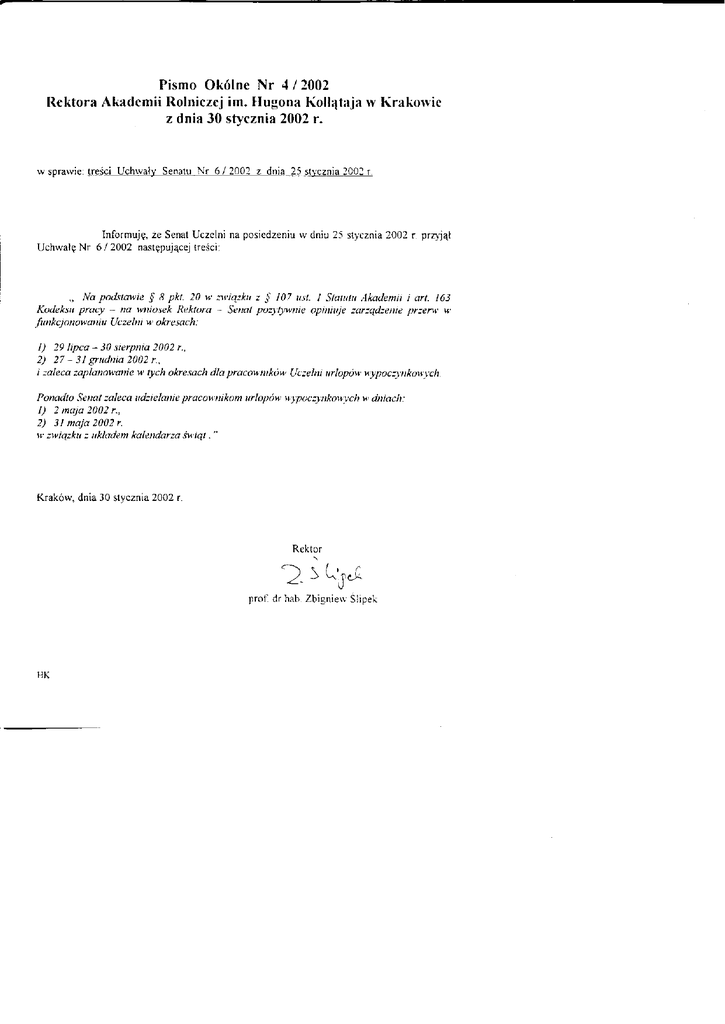 Pismo Okólne Nr 4/2002 Rektora Akademii Rolniczej im. Hugona Kołłątaja w Krakowie z dnia 30 stycznia 2002 r. w sprawie: treści Uchwały Senatu Nr 6 / 2002 z dnia 25 stycznia 2002 r. Informuję, że Senat Uczelni na posiedzeniu w dniu 25 stycznia 2002 r. przyjął Uchwałę Nr 6 / 2002 następującej treści: „ Na podstawie § 8 pkt. 20 w związku z § 107 ust. I Statutu Akademii i art. 163 Kodeksu pracy - na wniosek Rektora - Senat pozytywnie opiniuje zarządzenie przerw' w funkcjonowaniu Uczelni w okresach: 1) 29 lipca - 30 sierpnia 2002 r., 2) 27- 31 grudnia 2002 r.. i zaleca zaplanowanie w tych okresach dla pracowników Uczelni urlopów wypoczynkowych. Ponadto Senat zaleca udzielanie pracownikom urlopów wypoczynkowych w dniach: 1) 2 maja 2002 r., 2) 31 maja 2002 r. w związku z układem kalendarza świąt. " Kraków, dnia 30 stycznia 2002 r. Rektor prof dr hab. Zbigniew Ślipek HK
