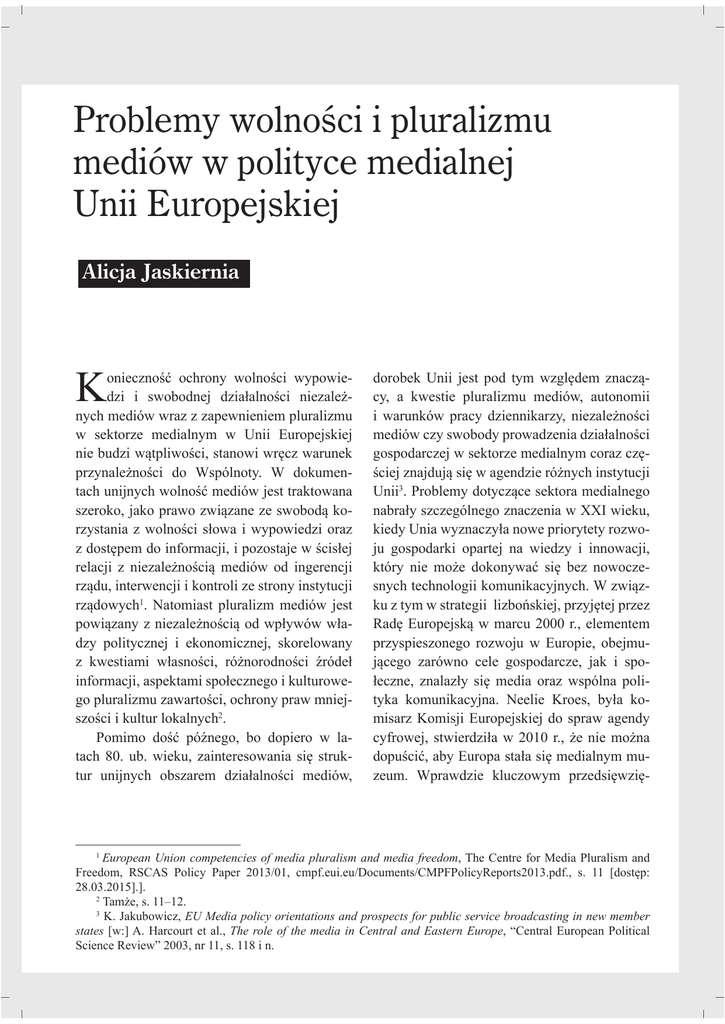 Problemy wolnoĂci i pluralizmu mediów w polityce medialnej Unii Europejskiej Alicja Jaskiernia K oniecznoĞü ochrony wolnoĞci wypowiedzi i swobodnej dziaáalnoĞci niezaleĪnych mediów wraz z zapewnieniem pluralizmu w sektorze medialnym w Unii Europejskiej nie budzi wątpliwoĞci, stanowi wrĊcz warunek przynaleĪnoĞci do Wspólnoty. W dokumentach unijnych wolnoĞü mediów jest traktowana szeroko, jako prawo związane ze swobodą korzystania z wolnoĞci sáowa i wypowiedzi oraz z dostĊpem do informacji, i pozostaje w Ğcisáej relacji z niezaleĪnoĞcią mediów od ingerencji rządu, interwencji i kontroli ze strony instytucji rządowych1. Natomiast pluralizm mediów jest powiązany z niezaleĪnoĞcią od wpáywów wáadzy politycznej i ekonomicznej, skorelowany z kwestiami wáasnoĞci, róĪnorodnoĞci Ĩródeá informacji, aspektami spoáecznego i kulturowego pluralizmu zawartoĞci, ochrony praw mniejszoĞci i kultur lokalnych2. Pomimo doĞü póĨnego, bo dopiero w latach 80. ub. wieku, zainteresowania siĊ struktur unijnych obszarem dziaáalnoĞci mediów, 1 dorobek Unii jest pod tym wzglĊdem znaczący, a kwestie pluralizmu mediów, autonomii i warunków pracy dziennikarzy, niezaleĪnoĞci mediów czy swobody prowadzenia dziaáalnoĞci gospodarczej w sektorze medialnym coraz czĊĞciej znajdują siĊ w agendzie róĪnych instytucji Unii3. Problemy dotyczące sektora medialnego nabraáy szczególnego znaczenia w XXI wieku, kiedy Unia wyznaczyáa nowe priorytety rozwoju gospodarki opartej na wiedzy i innowacji, który nie moĪe dokonywaü siĊ bez nowoczesnych technologii komunikacyjnych. W związku z tym w strategii lizboĔskiej, przyjĊtej przez RadĊ Europejską w marcu 2000 r., elementem przyspieszonego rozwoju w Europie, obejmującego zarówno cele gospodarcze, jak i spoáeczne, znalazáy siĊ media oraz wspólna polityka komunikacyjna. Neelie Kroes, byáa komisarz Komisji Europejskiej do spraw agendy cyfrowej, stwierdziáa w 2010 r., Īe nie moĪna dopuĞciü, aby Europa staáa siĊ medialnym muzeum. Wprawdzie kluczowym przedsiĊwziĊ- European Union competencies of media pluralism and media freedom, The Centre for Media Pluralism and Freedom, RSCAS Policy Paper 2013/01, cmpf.eui.eu/Documents/CMPFPolicyReports2013.pdf., s. 11 [dostĊp: 28.03.2015].]. 2 TamĪe, s. 11–12. 3 K. Jakubowicz, EU Media policy orientations and prospects for public service broadcasting in new member states [w:] A. Harcourt et al., The role of the media in Central and Eastern Europe, “Central European Political Science Review” 2003, nr 11, s. 118 i n. 140 ciem nowego wiceprzewodniczącego Andrusa Ansipa i komisarza Günthera Oettingera4 jest misja stworzenia jednolitego unijnego rynku cyfrowego, uczynienie z Europy dynamicznego cyfrowego lidera najlepszego i bezpiecznego Ğwiata online, a takĪe stworzenie tysiĊcy nowych miejsc pracy5, to jednak kwestie wolnoĞci i pluralizmu mediów bĊdą obecne w unijnej agendzie spraw najbardziej istotnych dla prawidáowego funkcjonowania Wspólnoty oraz rozwoju gospodarczego i spoáecznego paĔstw czáonkowskich. W artykule dokonano przeglądu najwaĪniejszych dokumentów Unii z dziedziny mediów oraz poddano analizie aktualnie obowiązujące regulacje mające znaczenie dla poziomu wolnoĞci i pluralizmu mediów w paĔstwach czáonkowskich. Przeprowadzona zostaáa takĪe analiza porównawcza róĪnic wykazywanych przez Parlament Europejski i KomisjĊ Europejską w obszarze problemów wolnoĞci i pluralizmu mediów. WolnoĞü i pluralizm mediów jako cel polityki medialnej Unii Europejskiej Pierwszym waĪnym dokumentem Wspólnoty, w którym explicite znalazáy siĊ sformuáowania odnoszące siĊ do roli informacji i mediów, jest uchwaáa PE z początku lat 80. XX wieku, w której przyjąá on tzw. raport Hahna „O radiofonii i telewizji we Wspólnocie Europejskiej”. W uchwale znalazá siĊ znamienny fragment odnoszący siĊ do decydującej roli informacji w kreowaniu toĪsamoĞci europejskiej: „Informacja jest decydującym, byü moĪe najwaĪniejszym czynnikiem 4 Alicja Jaskiernia zjednoczenia Europy (…) ToĪsamoĞü europejska powstanie tylko wtedy, gdy Europejczycy bĊdą odpowiednio poinformowani”6. Raport Hahna wskazywaá po raz pierwszy na rolĊ kultury jako nowego wymiaru integracji, która powinna zrównowaĪyü zbyt biurokratyczny wizerunek Wspólnoty. Przypomniaá w tym kontekĞcie znamienną wypowiedĨ Przewodniczącego Komisji Gastona Thorna z 1981 r., w której kwestionuje on jedynie ekonomiczne cele integracji: „Europejska przyszáoĞü nie jest wyáącznie kwestią ekonomii (…) polityczna wspólnota nie moĪe byü stworzona bez wspólnej politycznej woli, którą moĪe wesprzeü PE. (…) bez dziaáaĔ paĔstw czáonkowskich, zaangaĪowania obywateli Europy, bez projektów kulturalnych oraz polityki informacyjnej, te ambitne zamierzenia prawdopodobnie bĊdą miaáy krótki Īywot”7. W preambule Karty Praw Podstawowych, przyjĊtej w 2010 r., deklaruje siĊ, Īe „Unia jest zbudowana na niepodzielnych, powszechnych wartoĞciach godnoĞci ludzkiej, wolnoĞci, równoĞci i solidarnoĞci”, tworząc przestrzeĔ „wolnoĞci, bezpieczeĔstwa i sprawiedliwoĞci”8. Budowa tej przestrzeni, prowadzona w sektorze mediów juĪ czwartą dekadĊ, wymagaáa wielu kompromisów wobec czĊsto sprzecznych aspiracji narodowych czy róĪnych sektorów mediów. Europeizacja9 mediów pozostaje ciągle niezrealizowanym celem, trudno teĪ mówiü o peánej harmonizacji istotnych reguá w dziedzinie mediów, nawet w tak fundamentalnych kwestiach, jak pluralizm, wolnoĞü i niezaleĪnoĞü. Choü postĊpuje internalizacja wartoĞci podstawowych, kreowanych zwáaszcza przez http://ec.europa.eu/commission/2014-2019/, [dostĊp: 28.03.2015]. http://ec.europa.eu/commission/2014-2019/ansip/announcements/digital-single-market-investing-future-speech-vice-president-ansip-likta-16th-annual-conference-riga_en [dostĊp: 3.01.2015]. 6 Raport W. Hahna z 2012 