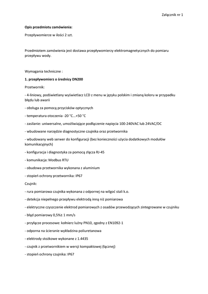 Załącznik nr 1 Opis przedmiotu zamówienia: Przepływomierze w ilości 2 szt. Przedmiotem zamówienia jest dostawa przepływomierzy elektromagnetycznych do pomiaru przepływu wody. Wymagania techniczne : 1. przepływomierz o średnicy DN200 Przetwornik: - 4-liniowy, podświetlany wyświetlacz LCD z menu w języku polskim i zmianą koloru w przypadku błędu lub awarii - obsługa za pomocą przycisków optycznych - temperatura otoczenia -20 °C...+50 °C - zasilanie: uniwersalne, umożliwiające podłączenie napięcia 100-240VAC lub 24VAC/DC - wbudowane narzędzie diagnostyczne czujnika oraz przetwornika - wbudowany web serwer do konfiguracji (bez konieczności użycia dodatkowych modułów komunikacyjnych) - konfiguracja i diagnostyka za pomocą złącza RJ-45 - komunikacja: Modbus RTU - obudowa przetwornika wykonana z aluminium - stopień ochrony przetwornika: IP67 Czujnik: - rura pomiarowa czujnika wykonana z odpornej na wilgoć stali k.o. - detekcja niepełnego przepływu elektrodą inną niż pomiarowa - elektryczne czyszczenie elektrod pomiarowych z osadów przewodzących zintegrowane w czujniku - błąd pomiarowy 0,5%± 1 mm/s - przyłącze procesowe: kołnierz luźny PN10, zgodny z EN1092-1 - odporna na ścieranie wykładzina poliuretanowa - elektrody stożkowe wykonane z 1.4435 - czujnik z przetwornikiem w wersji kompaktowej (łącznej) - stopień ochrony czujnika: IP67 Załącznik nr 1 2.przepływomierz o średnicy DN150 Przetwornik: - 4-liniowy, podświetlany wyświetlacz LCD z menu w języku polskim i zmianą koloru w przypadku błędu lub awarii - obsługa za pomocą przycisków optycznych - temperatura otoczenia -20 °C...+50 °C - zasilanie: uniwersalne, umożliwiające podłączenie napięcia 100-240VAC lub 24VAC/DC - wbudowane narzędzie diagnostyczne czujnika oraz przetwornika - wbudowany web serwer do konfiguracji (bez konieczności użycia dodatkowych modułów komunikacyjnych) - konfiguracja i diagnostyka za pomocą złącza RJ-45 - komunikacja: Modbus RTU - obudowa przetwornika wykonana z aluminium - stopień ochrony przetwornika: IP67 Czujnik: - rura pomiarowa czujnika wykonana z odpornej na wilgoć stali k.o. - detekcja niepełnego przepływu elektrodą inną niż pomiarowa - elektryczne czyszczenie elektrod pomiarowych z osadów przewodzących zintegrowane w czujniku - błąd pomiarowy 0,5%± 1 mm/s - przyłącze procesowe: kołnierz luźny PN10, zgodny z EN1092-1 - odporna na ścieranie wykładzina poliuretanowa - elektrody stożkowe wykonane z 1.4435 - czujnik z przetwornikiem w wersji kompaktowej (łącznej) - stopień ochrony czujnika: IP67 Wymagania: 1. Certyfikat jakości. 2. Atest higieniczny. 3. Oferent uwzględni koszty dostawy do siedziby zamawiającego. 4. Wodomierze fabrycznie nowe posiadające aktualną legalizację 2016r. 5. Gwarancja 24 miesiące. 6. Wszystkie urządzenia powinny być produkowane na terenie unii Europejskiej. 7. W technicznych sprawach Pan Andrzejem Wójcikiem tel. 63 27 20 160 lub 881 564 646
