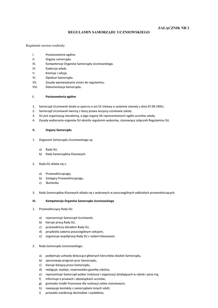 ZAŁĄCZNIK NR 2 REGULAMIN SAMORZĄDU UCZNIOWSKIEGO