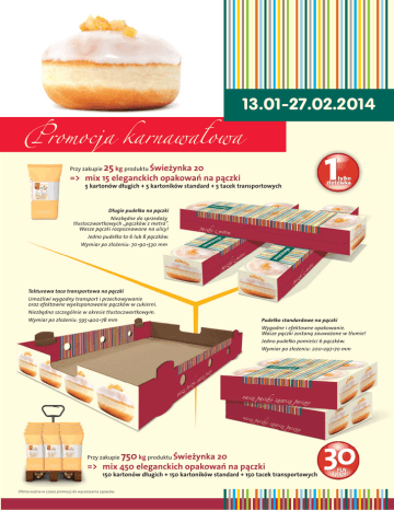 13.01-27.02.2014 Promocja karnawałowa Przy zakupie 25 kg produktu Świeżynka 20 => mix 15 eleganckich opakowań na pączki 5 kartonów długich + 5 kartoników standard + 5 tacek transportowych Długie pudełko na pączki Niezbędne do sprzedaży tłustoczwartkowych „pączków z metra”. Wasze pączki rozpoznawane na ulicy! Jedno pudełko to 6 lub 8 pączków. Wymiar po złożeniu: 70×90×530 mm Tekturowa taca transportowa na pączki Umożliwi wygodny transport i przechowywanie oraz efektowne wyeksponowanie pączków w cukierni. Niezbędna szczególnie w okresie tłustoczwartkowym. Wymiar po złożeniu: 595×400×78 mm Pudełko standardowe na pączki Wygodne i efektowne opakowanie. Wasze pączki zostaną zauważone w tłumie! Jedno pudełko pomieści 6 pączków. Wymiar po złożeniu: 200×297×70 mm Przy zakupie 750 kg produktu Świeżynka 20 => mix 450 eleganckich opakowań na pączki 150 kartonów długich + 150 kartoników standard + 150 tacek transportowych Oferta ważna w czasie promocji do wyczerpania zapasów. 30 PLN Tylko! www.komplet.pl W dniach od 13.01. do 27.02.2014 roku produkty niezbędne do przygotowania pysznych pączków będzie można nabyć w szczególnie korzystnych cenach lub z atrakcyjnym dodatkiem. 13.01-27.02.2014 Czas na karnawał! Zapraszamy na zakupy! Promocja karnawałowa Neuschnee Kiddy Choco Nierozpuszczający się puder dekoracyjny Pasta kakaowa, do dekorowania i nadziewania Magic Fondant Kiddy Weiss Glazura do dekoracji upieczonych ciast Pasta biała, do nadziewania i smarowania Krem Ajerconiac Kiddy Noisette Do nadziewania pączków Pasta orzechowa, do nadziewania i smarowania -5 cena w dół % Przy zakupie 750 kg produktu Pączek Maślany Mieszanki do produkcji pysznych serowych minipączków Boleros, Bellkule, Bonini’s Plus w karnawałowych cenach Termometr laserowy na podczerwień Szeroki zakres zastosowania Pomiar temperatury: od -30 °C do +500 °C Oferta ważna w czasie promocji do wyczerpania zapasów. 1 tylko złotówka -6 %