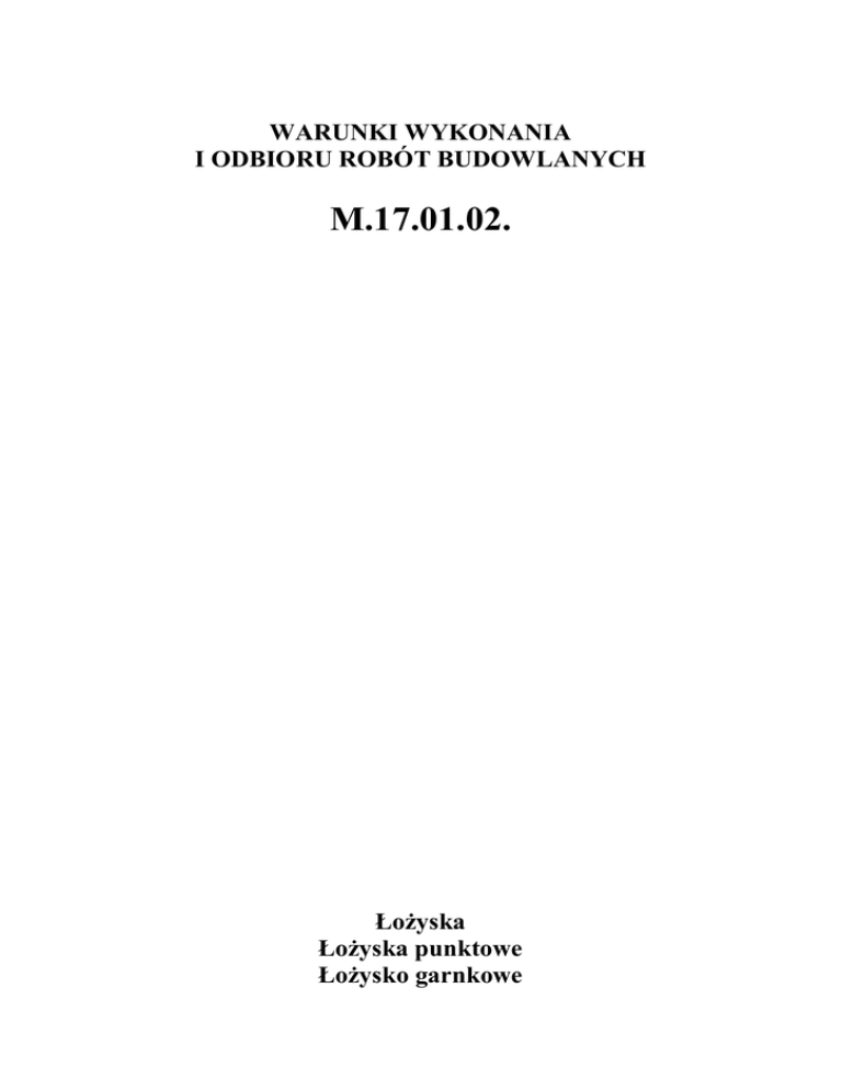 WARUNKI WYKONANIA I ODBIORU ROBÓT BUDOWLANYCH M.17.01.02. Łożyska Łożyska punktowe Łożysko garnkowe WARUNKI WYKONANIA I ODBIORU ROBÓT BUDOWLANYCH M.17.01.02. 1. WSTĘP 1.1. Przedmiot Warunków wykonania i odbioru robót budowlanych Przedmiotem niniejszych Warunków wykonania i odbioru robót budowlanych (WWiORB) są wymagania dotyczące wykonania i odbioru robót związanych z montażem łożysk garnkowych dla obiektów inżynierskich w związku z budową obwodnicy Kościerzyny w ciągu drogi krajowej nr 20 Stargard Szczeciński - Gdynia. 1.2. Określenia podstawowe. Łożysko – konstrukcja, której zadaniem jest przeniesienie sił z przęsła lub belki na podporę, umożliwiająca jednocześnie obroty przekrojów podporowych przęsła lub belki i ewentualnie, przemieszczenie przęsła lub belki w płaszczyźnie podparcia Łożysko stałe - łożysko uniemożliwiające przemieszczenia przęsła w płaszczyźnie podparcia Łożysko garnkowe – łożysko (odkształcalno – ślizgowe) w kształcie płaskiego cylindra (garnka), z umieszczoną w nim warstwą elastomeru, dociskanego z zewnątrz tłokiem, wchodzącym częściowo w cylinder. Łożysko ruchome (przesuwne) - łożysko umożliwiające przemieszczenia przęsła w płaszczyźnie podparcia, w jednym lub wielu kierunkach. Łożysko elastomerowe ślizgowe – łożysko odkształcalne przesuwne wykonane z elastomeru pokrytego PTFE, po którym ślizga się polerowana płyta stalowa Podlewka– mieszanka epoksydowo - betonowa stosowana jako podlewki pod łożyska Pozostałe określenia podane w niniejszych WWiORB są zgodne z przedmiotowymi normami i WWiORB DM 00.00.00 "Wymagania Ogólne". 1.3. Ogólne wymagania dotyczące Robót Ogólne wymagania podano w WWiORB DM 00.00.00. "Wymagania Ogólne" Wykonawca opracuje projekt montażu łożysk z uwzględnieniem robót związanych z przygotowaniem łożysk i ciosów podłożyskowych oraz przedstawi go do akceptacji Inspektora Nadzoru i Projektanta. Wykonawca jest odpowiedzialny za jakość stosowanych materiałów i wykonywanych robót oraz za ich zgodność z Dokumentacją Projektową, WWiORB projektem montażu, aprobatą techniczną oraz zaleceniami Inspektora Nadzoru. Roboty powinny być wykonane zgodnie z projektem montażu Aprobatą Techniczną oraz [1] i WWiORB 2. WYROBY BUDOWLANE I MATERIAŁY Ogólne wymagania dotyczące materiałów, ich w WWiORB DM-00.00.00 „Wymagania ogólne”. pozyskiwania i składowania podano Łożyska powinny: spełniać wymagania określone w [1] posiadać Aprobatę Techniczną IBDiM być zatwierdzone przez Inspektora Nadzoru zapewniać minimalny okres użytkowania przez 20 lat. przekazywać obciążenia pionowe całą powierzchnią, z jednoczesnym zagwarantowaniem wielokierunkowych obrotów konstrukcji w punktach podparcia, przekazywać siły poziome z pominięciem powierzchni przenoszących naciski pionowe, być wyposażone w oddzielne powierzchnie do przenoszenia przemieszczeń liniowych i kątowych 325 WARUNKI WYKONANIA I ODBIORU ROBÓT BUDOWLANYCH M.17.01.02. zapewnić małe opory tarcia przy przemieszczeniach liniowych i kątowych poprzez zastosowanie w szczególności odpowiednio: o wkładek PTFE o współczynniku tarcia nie większym niż 0.03 – przy naprężeniach dociskających nie mniejszych niż 30MPa o blach ślizgowych z wysokostopowych stali austenitycznych o chropowatości powierzchni spełniającej wymagania polskich Norm, o chromowanych zakrzywionych powierzchni ślizgowych o chropowatości powierzchni spełniającej wymagania polskich Norm Wkładki z PTFE powinny być osadzone częścią swej grubości w zagłębieniach stalowych elementów i powinny być wyposażone w kieszenie smarownicze, wypełnione smarem spełniającym wymagania polskich Norm. Zastosowane łożyska ponadto powinny: posiadać część garnkową łożyska z poduszką elastomerową a) w łożyskach przesuwnych – w dolnej lub górnej ich części b) w łożyskach stałych – w górnej ich części być wyposażone w: a) element dociskający poduszkę elastomerową na jej styku z przykrywą garnka i zabezpieczający ją przed wyciśnięciem b) dodatkowe płyty ślizgowe na pokrywie garnka, z odpowiednimi prowadnicami w przypadku ukierunkowania przesuw, c) uszczelnienia zapobiegającego przenikania wilgoci do garnka. Prowadnice płyt ślizgowych, powinny przenieść na pokrywę garnka siły poziome działające na łożysko, Siły te powinny być przekazane na ścianki garnka poprzez bezpośredni docisk, bez oddziaływania na poduszkę elastomerową. Osadzenie pokrywy w garnku nie powinno ograniczać obrotów i nie powinno powodować jego zaklinowania. Podlewka z zaprawy powinna: być wykonana z mas na bazie PCC o wytrzymałości 50 MPa spełniać wymagania [1] posiadać Aprobatę Techniczną IBDiM 3. SPRZĘT Ogólne wymagania dotyczące sprzętu podano w WWiORB DM-00.00.00 „Wymagania ogólne”. Używany sprzęt podlega akceptacji przez Inżyniera i powinien zapewnić ciągłość prowadzenia prac i uzyskanie właściwej jakości robót. 4. TRANSPORT Ogólne wymagania dotyczące transportu podano w WWiORB DM-00.00.00 „Wymagania ogólne”. Materiały mogą być przewożone dowolnymi środkami transportu, odpowiednimi do asortymentu. Łożyska należy transportować w stanie skompletowanym. Sposób transportu materiałów lub wyrobów przewidzianych do zastosowania podczas montażu nowych łożysk nie może powodować obniżenia ich jakości lub powstania uszkodzeń. Załadunek, transport, rozładunek i składowanie materiałów związanych z wymianą łożysk powinny odbywać się tak, aby zachować ich dobry stan techniczny. Łożyska powinny być pakowane w sposób zabezpieczający je przed uszkodzeniem i zanieczyszczeniem oraz zaopatrzone w odpowiednie uchwyty do ich przenoszenia. 326 WARUNKI WYKONANIA I ODBIORU ROBÓT BUDOWLANYCH M.17.01.02. Podczas przenoszenia, transportu i przechowywania łożyska powinny być czyste oraz zabezpieczone od uszkodz