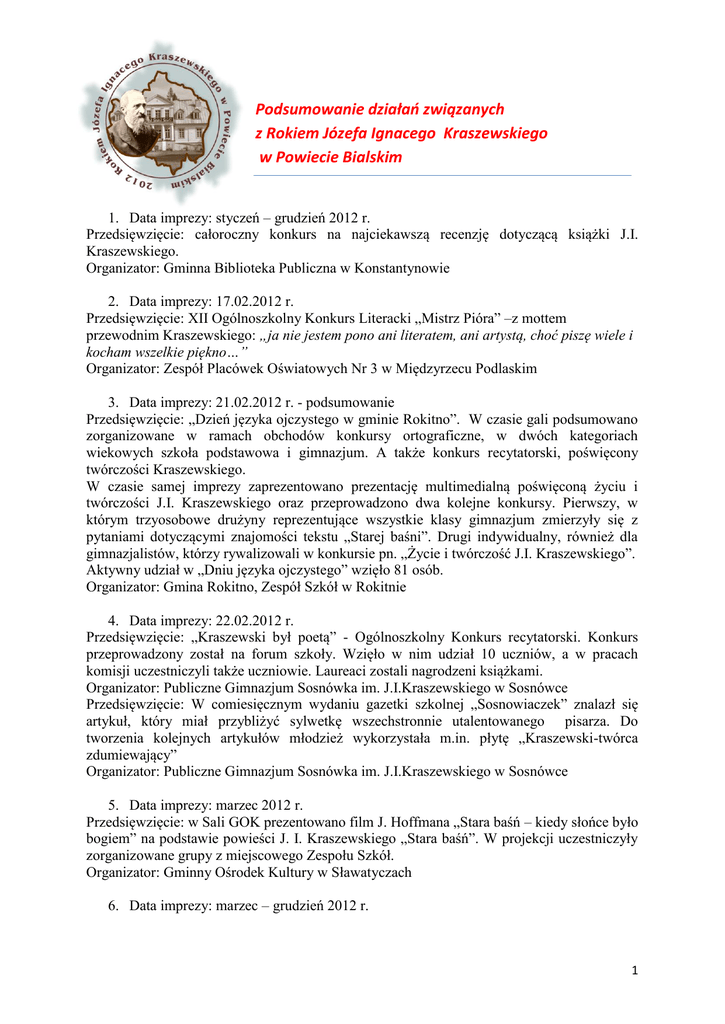 Podsumowanie działań związanych z Rokiem Józefa Ignacego Kraszewskiego w Powiecie Bialskim 1. Data imprezy: styczeń – grudzień 2012 r. Przedsięwzięcie: całoroczny konkurs na najciekawszą recenzję dotyczącą książki J.I. Kraszewskiego. Organizator: Gminna Biblioteka Publiczna w Konstantynowie 2. Data imprezy: 17.02.2012 r. Przedsięwzięcie: XII Ogólnoszkolny Konkurs Literacki „Mistrz Pióra” –z mottem przewodnim Kraszewskiego: „ja nie jestem pono ani literatem, ani artystą, choć piszę wiele i kocham wszelkie piękno…” Organizator: Zespół Placówek Oświatowych Nr 3 w Międzyrzecu Podlaskim 3. Data imprezy: 21.02.2012 r. - podsumowanie Przedsięwzięcie: „Dzień języka ojczystego w gminie Rokitno”. W czasie gali podsumowano zorganizowane w ramach obchodów konkursy ortograficzne, w dwóch kategoriach wiekowych szkoła podstawowa i gimnazjum. A także konkurs recytatorski, poświęcony twórczości Kraszewskiego. W czasie samej imprezy zaprezentowano prezentację multimedialną poświęconą życiu i twórczości J.I. Kraszewskiego oraz przeprowadzono dwa kolejne konkursy. Pierwszy, w którym trzyosobowe drużyny reprezentujące wszystkie klasy gimnazjum zmierzyły się z pytaniami dotyczącymi znajomości tekstu „Starej baśni”. Drugi indywidualny, również dla gimnazjalistów, którzy rywalizowali w konkursie pn. „Życie i twórczość J.I. Kraszewskiego”. Aktywny udział w „Dniu języka ojczystego” wzięło 81 osób. Organizator: Gmina Rokitno, Zespół Szkół w Rokitnie 4. Data imprezy: 22.02.2012 r. Przedsięwzięcie: „Kraszewski był poetą” - Ogólnoszkolny Konkurs recytatorski. Konkurs przeprowadzony został na forum szkoły. Wzięło w nim udział 10 uczniów, a w pracach komisji uczestniczyli także uczniowie. Laureaci zostali nagrodzeni książkami. Organizator: Publiczne Gimnazjum Sosnówka im. J.I.Kraszewskiego w Sosnówce Przedsięwzięcie: W comiesięcznym wydaniu gazetki szkolnej „Sosnowiaczek” znalazł się artykuł, który miał przybliżyć sylwetkę wszechstronnie utalentowanego pisarza. Do tworzenia kolejnych artykułów młodzież wykorzystała m.in. płytę „Kraszewski-twórca zdumiewający” Organizator: Publiczne Gimnazjum Sosnówka im. J.I.Kraszewskiego w Sosnówce 5. Data imprezy: marzec 2012 r. Przedsięwzięcie: w Sali GOK prezentowano film J. Hoffmana „Stara baśń – kiedy słońce było bogiem” na podstawie powieści J. I. Kraszewskiego „Stara baśń”. W projekcji uczestniczyły zorganizowane grupy z miejscowego Zespołu Szkół. Organizator: Gminny Ośrodek Kultury w Sławatyczach 6. Data imprezy: marzec – grudzień 2012 r. 1 Przedsięwzięcie: Filmowa adaptacja powieści Józefa Ignacego Kraszewskiego „Hrabia Cosel”. Premiera filmu będzie miała miejsce na przełomie listopada i grudnia. Aktorami w filmowej adaptacji są uczestnicy grupy teatralnej „Perły Życia” utworzonej z uczestników Warsztatu Terapii Zajęciowej i Środowiskowego Domu Samopomocy w Kodniu. Organizator: Stowarzyszenie Inicjatyw Społecznych „Jedność” w Kodniu 7. Data imprezy: 12.03.2012 r. Przedsięwzięcie: Międzyszkolny konkurs recytatorski prozy Józefa Ignacego Kraszewskiego i Janusza Korczaka. W konkursie wzięli udział uczniowie z Rokitna, Konstantynowa i Janowa Podlaskiego. Konkurs odbywał się w dwóch kategoriach wiekowych: uczniowie klas V i uczniowie klas VI. Laureaci konkursu otrzymali dyplomy i nagrody książkowe, natomiast pozostali uczestnicy - wyróżnienia lub dyplomy za udział w konkursie. Nauczyciele otrzymali stosowne podziękowania. Organizator: Szkoła Podstawowa im. Cz. Tańskiego w Janowie Podlaskim 8. Data imprezy: 19.03.2012 r. Przedsięwzięcie: Inauguracja Roku Kraszewskiego w Szkole Podstawowej w Sosnówce Organizator: Szkoła Podstawowa w Sosnówce 9. Data imprezy: 21.03.2012 r. Przedsięwzięcie: Obchody Dnia Patrona. Przygotowanie montażu słowno-muzycznego składającego się z fragmentów dzieł pisarza, zapoznanie przybyłej młodzieży z „Kącikiem Patrona szkoły” Organizator: Publiczne Gimnazjum Sosnówka im. J.I.Kraszewskiego w Sosnówce 10. Data imprezy: kwiecień 2012 r. Przedsięwzięcie: w XII numerze rocznika Nadbużańskie Sławatycze 2011 ukazał się artykuł poświęcony rodzinie Kraszewskich pt. „Sąsiedzkie relacje Sławatycz z Romanowem” autorstwa Krzysztofa Gruszkowskiego z Lublina. Organizator: Gminny Ośrodek Kultury w Sławatyczach 11. Data imprezy: 4.04.2012 r. Przedsięwzięcie: „Patron bez tajemnic” - Ogólnoszkolny konkurs wiedzy o życiu i twórczości Kraszewskiego. W konkursie wzięło udział 16 uczniów. Konkurs miał charakter dwuetapowy: a) w pierwszym wszyscy uczestnicy pisali test b) do drugiego – ustnego etapu zakwalifikowało się 5 uczniów, którzy odpowiadali na zestaw wylosowanych pytań. Laureaci otrzymali nagrody książkowe a pozostali uczestnicy upominki oraz dyplomy. Organizator: Publiczne Gimnazjum Sosnówka im. J.I.Kraszewskiego w Sosnówce 12. Data imprezy: 11.05.2012 r. Przedsięwzięcie: Biegi Przełajowe im. J. I. Kraszewskiego o puchar Starosty Bialskiego pod hasłem "Żyjmy zdrowo". Zawody odbyły się na terenie lasów Leśnictwa Romanów. W biegach uczestniczyła młodzież z gminy Sosnówka, a także ze szkół sąsiednich gmin tj.: Wisznice, Sławatycze, Hanna. Organizator: Gmina Sosnówka, Szkoła Podstawowa w Sosnówce, UKS „Hetman” 13. Data imprezy: 15.05.2012 r. 2 Przedsięwzięcie: lekcja muzealna na temat „Józef Ignacy Kraszewski – jego życie i twórczość”. Młodzież szkolna z klas IV – VI Szkoły Podstawowej oraz kl I – III miejscowego Gimnazjum z wysłuchała lekcji, którą poprowadził starszy kustosz Muzeum Południowego Podlasia Antoni Jodłowski. Organizator: Gminny Ośrodek Kultury w Sławatyczach 14. Data imprezy: 15.05 – 30.07.2012 r. Przedsięwzięcie: wystawa wypożyczona z Muzeum Południowego Podlasia „Ach! w tej to Białej…”. Organizator: G