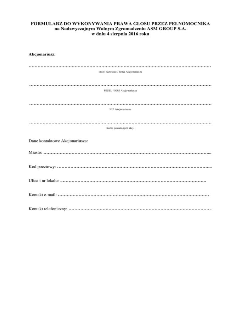 FORMULARZ DO WYKONYWANIA PRAWA GŁOSU PRZEZ PEŁNOMOCNIKA na Nadzwyczajnym Walnym Zgromadzeniu ASM GROUP S.A. w dniu 4 sierpnia 2016 roku Akcjonariusz: …………………………………………………………………………………………………………… imię i nazwisko / firma Akcjonariusza …………………………………………………………………………………………………………… PESEL / KRS Akcjonariusza …………………………………………………………………………………………………………… NIP Akcjonariusza …………………………………………………………………………………………………………… liczba posiadanych akcji Dane kontaktowe Akcjonariusza: Miasto: …………………………………………………………………………………………………... Kod pocztowy: …………………………………………………………………………………………... Ulica i nr lokalu: .…………………………………………………………………………………….. Kontakt e-mail: ………………………………………………………………………………………… Kontakt telefoniczny: ……………………………………………………………………………………. Niniejszym ustanawia, jako swojego pełnomocnika: …………………………………………………………………………………………………………… imię i nazwisko / firma pełnomocnika …………………………………………………………………………………………………………… numer dokumentu tożsamości pełnomocnika będącego osobą fizyczną i organ wydający dokument …………………………………………………………………………………………………………… PESEL / KRS pełnomocnika i oznaczenie sądu rejestrowego Dane kontaktowe Pełnomocnika: Miasto: …………………………………………………………………………………………………... Kod pocztowy: …………………………………………………………………………………………... Ulica i nr lokalu: .…………………………………………………………………………………….. Kontakt e-mail: ………………………………………………………………………………………… Numer telefonu: ………………………………………………………………………………………… do reprezentowania Akcjonariusza na Nadzwyczajnym Walnym Zgromadzeniu ASM GROUP S.A. z siedzibą w Warszawie, w dniu 4 sierpnia 2016 roku, a w związku z tym do udziału w Nadzwyczajnym Walnym Zgromadzeniu i zabierania głosu w jego trakcie, podpisywania listy obecności i wykonywania prawa głosu nad uchwałami Nadzwyczajnego Walnego Zgromadzenia z każdej akcji Akcjonariusza. TRE Ć PROPONOWANYCH UCHWAŁ UCHWAŁA Nr ( 5/2016) Nadzwyczajnego Walnego Zgromadzenia ASM GROUP Spółki Akcyjnej z dnia 4 sierpnia 2016 roku w sprawie wyboru Przewodniczącego Walnego Zgromadzenia 1. Walne Zgromadzenie ASM GROUP Spółki Akcyjnej z siedzibą w Warszawie, działając na podstawie art. § Kodeksu spółek handlowych postanawia wybrać na Przewodniczącego Walnego Zgromadzenia ……………………………………………. 2. Uchwała wchodzi w życie z dniem podjęcia. _____________________________________________________________________________________________________ UCHWAŁA Nr (26/2016) Nadzwyczajnego Walnego Zgromadzenia ASM GROUP Spółki Akcyjnej z dnia 4 sierpnia 2016 roku w sprawie przyjęcia porządku obrad 1. Nadzwyczajne Walne Zgromadzenie ASM GROUP Spółki Akcyjnej z siedzibą w Warszawie, postanawia przyjąć następujący porządek obrad: 1) Otwarcie Walnego Zgromadzenia. 2) Wybór Przewodniczącego Walnego Zgromadzenia. 3) Stwierdzenie prawidłowości zwołania Walnego Zgromadzenia oraz jego zdolności do podejmowania uchwał. 4) Przyjęcie porządku obrad. 5) Podjęcie uchwały w sprawie powołania członka Rady Nadzorczej ASM GROUP S.A. 6) Zamknięcie Walnego Zgromadzenia. 2. Uchwała wchodzi w życie z dniem podjęcia. _____________________________________________________________________________________________________ UCHWAŁA Nr (27/2016) Nadzwyczajnego Walnego Zgromadzenia ASM GROUP Spółki Akcyjnej z dnia 4 sierpnia 2016 roku w sprawie powołania członka Rady Nadzorczej ASM GROUP S.A. 1. Nadzwyczajne Walne Zgromadzenie ASM GROUP Spółki Akcyjnej działając na podstawie art. § Kodeksu spółek handlowych oraz § ust. Statutu Spółki, powołuje do Rady Nadzorczej ASM GROUP Spółki Akcyjnej Pana Jarosława Grzywińskiego, na okres wspólnej kadencji z dotychczasowymi członkami Rady Nadzorczej Spółki. 2. Uchwała wchodzi w życie z dniem podjęcia. Data: .................................................................................................................................................... Podpis: ........................................................................................................................................... INSTRUKCJA GŁOSOWANIA PEŁNOMOCNIKA na Nadzwyczajnym Walnym Zgromadzeniu Spółki ASM GROUP S.A. w dniu 4 sierpnia 2016 r. Punkt porządku obrad 2 4 5 Przedmiot Uchwały Głosuję Za* Głosuję Przeciw* Wstrzymuję się od głosu* Żądanie zaprotokołowania sprzeciwu do uchwały UCHWAŁA Nr 1 (25/2016) w sprawie wyboru Przewodniczącego Walnego Zgromadzenia UCHWAŁA Nr 2 (26/2016) w sprawie przyjęcia porządku obrad UCHWAŁA Nr 3 (27/2016) w sprawie powołania członka Rady Nadzorczej Prosimy o zaznaczenie odpowiedniej rubryki znakiem „X” Załącznik: oryginał imiennego zaświadczenia o prawie uczestnictwa w Nadzwyczajnym Walnym Zgromadzeniu ASM GROUP S.A. Imię i nazwisko / Firma Akcjonariusza:..................................