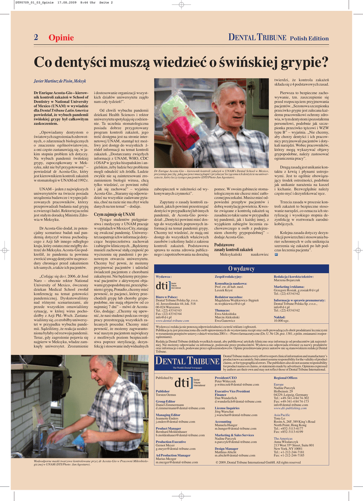 DTP0709_01_03_Opinie 2 17.08.2009 8:44 Uhr Seite 2 DENTAL TRIBUNE Opinie Polish Edition Co dentyści muszą wiedzieć o świńskiej grypie? twierdzi, że kontrola zakażeń składa się z 4 podstawowych zasad. Javier Martínez de Pisón, Meksyk Dr Enrique Acosta-Gio – kierownik kontroli zakażeń w School of Dentistry w National University of Mexico (UNAM) w wywiadzie dla Dental Tribune Latin America powiedział, że wybuch pandemii świńskiej grypy był całkowitym zaskoczeniem. „Opowiadamy dentystom o światowych zagrożeniach zdrowotnych, o zdarzeniach biologicznych o znaczeniu ogólnoświatowym, a oni często zastanawiają się, w jakim stopniu problem ich dotyczy. Na wybuch pandemii świńskiej grypy, zapoczątkowany w Meksyku, nikt nie był przygotowany” – powiedział dr Acosta-Gio, który jest kierownikiem kontroli zakażeń w stomatologii w UNAM od 1992 r. UNAM – jeden z największych uniwersytetów na świecie posiada urządzenia badawcze i wyspecjalizowanych pracowników, którzy przeprowadzali badania nad grypą u zwierząt i ludzi. Rektor tej uczelni jest stałym doradcą Ministra Zdrowia w Meksyku. Dr Acosta-Gio dodał, że potencjalny scenariusz badań nad pandemią dotyczył wirusa pochodzącego z Azji lub innego odległego kraju, który ostatecznie mógłby dotrzeć do Meksyku. Acosta-Gio podkreślił, że pandemia ta powinna zwrócić uwagę dentystów na procedury chroniące przed zakażeniem ich samych, a także ich pacjentów. „Cofając się do r. 2006, dr José Naro – obecnie rektor National University of Mexico, ówczesny dziekan Medical School zwołał konferencję na temat gotowości pandemicznej. Dyskutowaliśmy nad różnymi scenariuszami, ale przede wszystkim omawialiśmy sytuację, w której wirus pochodziłby z Azji Płd.-Wsch. Zastanawialiśmy się, co zrobiłby uniwersytet w przypadku wybuchu pandemii. Sądziliśmy, że reakcja uzależniona byłaby od rozwoju pandemii. Teraz, gdy zagrożenie pojawia się najpierw w Meksyku, władze zamknęły uniwersytet. Zrozumienie Pierwsza to bezpieczne zachowywanie, tzn. zaszczepienie się przed rozpoczęciem przyjmowania pacjentów. „Sezonowa szczepionka przeciwko grypie jest zalecana każdemu pracownikowi ochrony zdrowia, w tym dentystom i pozostałemu personelowi, podobnie jak szczepionka przeciwko tężcowi i WZW typu B” – wyjaśnia. „Nie chcemy, aby chorzy dentyści i ich pracownicy przyjmowali pacjentów i dotykali narzędzi. Wobec pracowników, którzy mogą wykazywać objawy grypopodobne, należy zastosować ograniczenia pracy”. i dostosowanie organizacji wszystkich działów uniwersytetu zajęło nam cały tydzień!”. Od chwili wybuchu pandemii dziekani Health Sciences i rektor uniwersytetu spotykają się codziennie. Ta uczelnia stomatologiczna posiada dobrze przygotowany program kontroli zakażeń, jego treść dostępna jest na stronie internetowej UNAM, stamtąd też możliwy jest dostęp do wszystkich źródeł informacji na temat kontroli zakażeń. „Dostarczamy zwięzłych informacji z UNAM, WHO, CDC i OSAP w języku hiszpańskim i angielskim, żeby ludzie bez problemu mogli odnaleźć ich źródła. Ludzie zwykle nie są zainteresowani zrozumieniem biologii wirusa, chcą tylko wiedzieć, co powinni robić i jak się zachować” – wyjaśnia Acosta-Gio. „Staramy się odpowiedzieć na wszystkie zadawane pytania, choć na razie nie ma zbyt wielu danych na ten temat” – dodaje. Czym zajmuje się UNAM Tysiące studentów pielęgniarstwa i medycyny z UNAM pracuje w szpitalach w Mexico City, starając się zwalczać pandemię. Uniwersytet zaopatruje ich w informacje dotyczące bezpieczeństwa zachowań i zabiegów klinicznych. „Będziemy musieli zachować stałą czujność po wyciszeniu się pandemii i po ponownym otwarciu uniwersytetu. Chcemy być pewni, że możemy przyjmować pacjentów i udzielać świadczeń pacjentom z chorobami zakaźnymi. Nie będziemy przyjmować pacjentów z aktywnymi objawami grypopodobnymi, przeziębieniem i grypą. Ponadto, chcemy mieć pewność, że pacjenci, którzy przechodzili grypę lub choroby grypopodobne, nie mają objawów od co najmniej 7 dni” – mówi dr AcostaGio, dodając: „Chcemy się upewnić, że nasi studenci podczas swojej pracy przestrzegają wszystkich zalecanych procedur. Chcemy mieć pewność, że możemy zagwarantować naszym pacjentom największy z możliwych poziom bezpieczeństwa poprzez sterylizację, dezynfekcję i stosowanie indywidualnych Dr Enrique Acosta-Gio – kierownik kontroli zakażeń w UNAM’s Dental School w Mexico, prezentuje paczkę, jaką pacjenci muszą kupić i przekazać leczącemu ich dentyście na uniwersytecie, który leczy tysiące pacjentów (DTI/Photo Jan Agostaro). zabezpieczeń w zależności od wykonywanych czynności”. Zapytany o zasady kontroli zakażeń, jakich powinni przestrzegać dentyści w przypadku tej lub innych pandemii, dr Acosta-Gio powiedział: „Dentyści powinni mieć dostęp do wszystkich poprawnych informacji na temat pandemii grypy. Chcemy też wiedzieć, że mają oni dostęp do wszystkich właściwych zasobów i szkolimy ludzi z zakresu kontroli zakażeń. Podstawowa sprawa to ocena zdrowia publicznego i zapotrzebowania na doraźną pomoc. W swoim gabinecie stomatologicznym nie chcesz mieć zatłoczonej poczekalni. Musisz mieć odpowiedni przepływ pacjentów i dobrą wentylację powietrza. Kwestie związane z kontrolą zakażeń są zasadniczo takie same w przypadku tej pandemii, jak i każdej innej, z wyjątkiem zabiegów leczenia zachowawczego u osób z podejrzeniem choroby grypopodobnej” – dodaje Acosta-Gio. Podstawowe zasady kontroli zakażeń Meksykański naukowiec Drugą zasadą jest unikanie kontaktu z krwią i płynami ustrojowymi. Jest to ogólnie obowiązujący środek ostrożności, podobnie jak unikanie narażenia na kaszel i kichanie. Bezwzględnie należy często myć i dezynfekować ręce. Trzecia zasada w procesie kontroli zakażeń to 