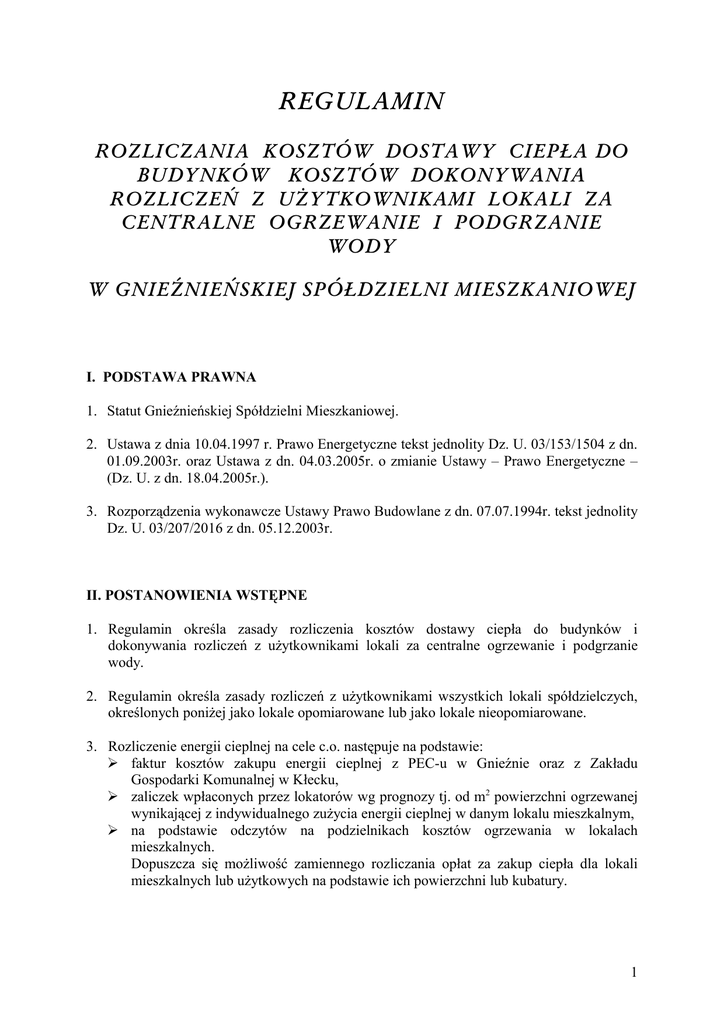 REGULAMIN ROZLICZANIA KOSZTÓW DOSTAWY CIEPŁA DO BUDYNKÓW KOSZTÓW DOKONYWANIA ROZLICZEŃ Z UŻYTKOWNIKAMI LOKALI ZA CENTRALNE OGRZEWANIE I PODGRZANIE WODY W GNIEŹNIEŃSKIEJ SPÓŁDZIELNI MIESZKANIOWEJ I. PODSTAWA PRAWNA 1. Statut Gnieźnieńskiej Spółdzielni Mieszkaniowej. 2. Ustawa z dnia 10.04.1997 r. Prawo Energetyczne tekst jednolity Dz. U. 03/153/1504 z dn. 01.09.2003r. oraz Ustawa z dn. 04.03.2005r. o zmianie Ustawy – Prawo Energetyczne – (Dz. U. z dn. 18.04.2005r.). 3. Rozporządzenia wykonawcze Ustawy Prawo Budowlane z dn. 07.07.1994r. tekst jednolity Dz. U. 03/207/2016 z dn. 05.12.2003r. II. POSTANOWIENIA WSTĘPNE 1. Regulamin określa zasady rozliczenia kosztów dostawy ciepła do budynków i dokonywania rozliczeń z użytkownikami lokali za centralne ogrzewanie i podgrzanie wody. 2. Regulamin określa zasady rozliczeń z użytkownikami wszystkich lokali spółdzielczych, określonych poniżej jako lokale opomiarowane lub jako lokale nieopomiarowane. 3. Rozliczenie energii cieplnej na cele c.o. następuje na podstawie: faktur kosztów zakupu energii cieplnej z PEC-u w Gnieźnie oraz z Zakładu Gospodarki Komunalnej w Kłecku, zaliczek wpłaconych przez lokatorów wg prognozy tj. od m2 powierzchni ogrzewanej wynikającej z indywidualnego zużycia energii cieplnej w danym lokalu mieszkalnym, na podstawie odczytów na podzielnikach kosztów ogrzewania w lokalach mieszkalnych. Dopuszcza się możliwość zamiennego rozliczania opłat za zakup ciepła dla lokali mieszkalnych lub użytkowych na podstawie ich powierzchni lub kubatury. 1 ● Metoda rozliczenia wg powierzchni lub kubatury może być stosowana w przypadku jeśli zażąda tego w formie pisemnej więcej niż 2/3 mieszkańców danego budynku. Jeśli dla rozliczenia niektórych składników kosztów dostawy ciepła jednostką fizyczną jest m2 powierzchni użytkowej lokali to powierzchnię tę oblicza się według zasad określonych w „Regulaminie rozliczania kosztów gospodarki zasobami mieszkaniowymi” zatwierdzonym przez Radę Nadzorczą Spółdzielni w dn. 26.10.2005r. Od stycznia 2001r. zgodnie z decyzją Zarządu rozliczenie następuje na podstawie odczytów wskazań ilości zużytych GJ na węzłach jedno lub wielobudynkowych. 4. Dla potrzeb niniejszego regulaminu wprowadza się następujące pojęcia: 1) CO - centralne ogrzewanie, 2) CW - podgrzanie wody wodociągowej (ciepła woda), 3) Użytkownik lokalu - członek spółdzielni posiadający spółdzielcze prawo do lokalu, właściciel lokalu, najemca lokalu mieszkalnego lub użytkowego, 4) Lokale opomiarowane w zakresie CO - lokale, w których zainstalowano na grzejnikach podzielniki kosztów ogrzewania (wyparkowe bądź elektroniczne) oraz zawory termostatyczne, 5) Lokale opomiarowane w zakresie CW - lokale, do których ilość dostarczanej ciepłej wody określana jest wskazaniami zainstalowanego w tym celu wodomierza lokalowego, 6) Lokale nieopomiarowane w zakresie CO - lokale, w których nie zainstalowano na grzejnikach podzielników kosztów ogrzewania (wyparkowe bądź elektroniczne) oraz zaworów termostatycznych, a także lokale, w których stwierdzono chociażby jedno niesprawne z tych urządzeń oraz lokale, których użytkownik uniemożliwił dostępu osobom upoważnionym do dokonania odczytu wskazań podzielników kosztów ogrzewania 7) Lokale nieopomiarowane w zakresie CW - lokale, w których nie zainstalowano wodomierzy służących do określenia ilości dostarczonej ciepłej wody, a także lokale, w których stwierdzono chociażby jedno niesprawne z tych urządzeń oraz lokale, których użytkownik uniemożliwił dostępu osobom upoważnionym do dokonania odczytu wskazań wodomierzy, 8) Powierzchnia ogrzewana – całkowita powierzchnia użytkowa lokali, wyjątkowo całkowita powierzchnia użytkowa lokali bez zamontowanych liczników jest umniejszana i stanowi powierzchnię grzewczą, 9) Nieruchomość - jednostka rozliczeniowa stanowiąca ogół rozliczanych lokali usytuowanych w budynku, których zaopatrywanie w ciepło odbywa się przez wspólną instalację, a pomiar ciepła rejestrowany jest w węźle cieplnym (lub w węzłach cieplnych jeżeli jest ich więcej w budynku) obsługującym tą nieruchomość, 10) Okres rozliczeniowy - przedział czasu przyjęty do rozliczenia energii cieplnej na potrzeby: CO - 12 miesięcy, CW- 12 miesięcy. 11) Wskaźnik odczytu - stosunek sumy odczytanych jednostek w lokalu do powierzchni lokalu, w którym ten odczyt przeprowadzono, 12) Spółdzielnię - należy rozumieć Gnieźnieńską Spółdzielnię Mieszkaniową w Gnieźnie. 2 III. POSTANOWIENIA OGÓLNE 1. Wprowadza się obowiązek opomiarowania we wszystkich lokalach Gnieźnieńskiej Spółdzielni Mieszkaniowej dostawy do lokali ciepła przeznaczonego na ogrzewanie (CO) i podgrzanie wody wodociągowej (CW) poprzez: 1) zainstalowanie zaworów termostatycznych i podzielników kosztów ogrzewania spełniających wymogi określane przepisami powszechnie obowiązującymi, a w szczególności określane Polskimi Normami lub aprobatami technicznymi oraz zastosowanie związanego z danego typu podzielnikami systemu rozliczeń, 2) zainstalowanie w instalacji zasilającej lokal w wodę, wodomierzy spełniających wymogi określane przepisami powszechnie obowiązującymi, a w szczególności posiadających legalizację wymaganą przepisami ustawy Prawo o miarach. 3) w budynkach spełniających warunki pkt. 1 i 2 rozliczenia mają charakter zindywidualizowany natomiast w budynkach nie spełniających warunków pkt. 1 i 2 rozliczenia mają charakter zryczałtowany. 2. Obsługa, w tym montaż i odczyt wskazań podzielników kosztów ogrzewania oraz wskazań wodomierzy lokalowych ciepłej wody dokonywana jest przez podmiot upoważniony przez Spółdzielnię. Spółdzielnia może obciążyć użytkownika kosztami odczytu podzielników i rozliczenia energii cieplnej. 3. Użytkownik lokalu zobowiązany jest do udostępnienia zajmowanego lokalu w celu: a) zamonto