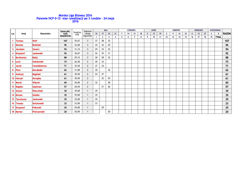 Morska Liga Biznesu 2016 Panowie HCP 0-12- stan rywalizacji po 3 rundzie - 24 maja 2016 Lp Imię Nazwisko Suma pkt. tura zasadnicza Średnia STB MAJ CZERWIEC LIPIEC SIERPIEŃ WRZESIEŃ PAŹDZIERNIK Zagrane rundy (łącznie) 10 17 24 31 7 14 21 28 5 12 19 2 9 16 23 6 13 27 4 8 1 2 3 4 5 6 7 8 9 10 11 12 13 14 15 16 17 18 19 FINAŁ RAZEM 1 Tomasz Wolf 107 35,67 3 37 38 32 107 2 Dariusz Bobiński 96 32,00 3 35 32 29 96 3 Jarosław Szwarc 94 31,33 3 29 33 32 94 4 Krzysztof Jankowski 92 30,67 3 26 35 31 92 5 Bartłomiej Babij 88 29,33 3 28 28 32 88 6 Lech Sokołowski 73 36,50 2 40 33 7 Jacek Ciesiołkiewicz 71 35,50 2 37 34 8 Piotr Mondalski 62 31,00 2 30 9 Andrzej 24 73 71 32 62 61 Bagiński 61 30,50 2 10 Henryk Konopka 61 30,50 2 37 11 Marek Więcek 60 30,00 2 12 Bogdan Szpilman 57 28,50 2 13 Antoni Wierciński 39 39,00 1 39 39 14 Roman Glebko 35 35,00 1 35 35 15 Tymoteusz Jankowski 35 35,00 1 35 35 16 Tomasz Onichowski 33 33,00 1 33 33 17 Krzysztof Piskorski 29 29,00 1 18 Marian Pieńczewski 20 20,00 1 32 32 31 29 61 28 60 26 57 29 29 20 20
