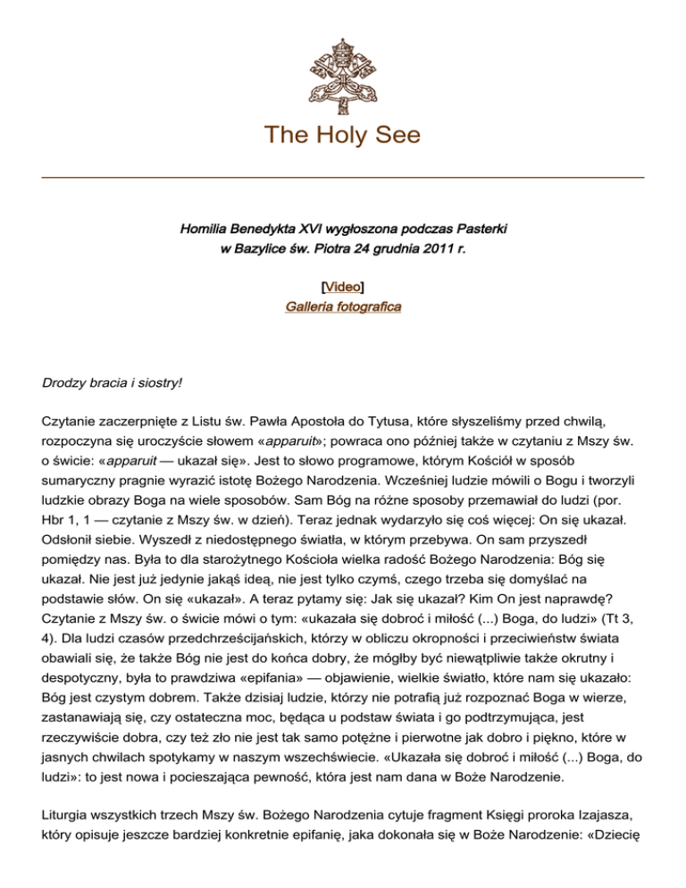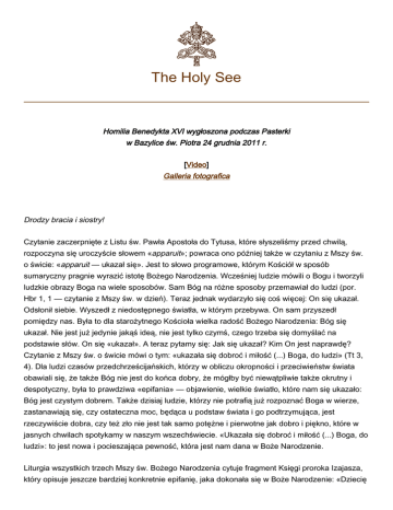The Holy See Homilia Benedykta XVI wygłoszona podczas Pasterki w Bazylice św. Piotra 24 grudnia 2011 r. [Video] Galleria fotografica Drodzy bracia i siostry! Czytanie zaczerpnięte z Listu św. Pawła Apostoła do Tytusa, które słyszeliśmy przed chwilą, rozpoczyna się uroczyście słowem «apparuit»; powraca ono później także w czytaniu z Mszy św. o świcie: «apparuit — ukazał się». Jest to słowo programowe, którym Kościół w sposób sumaryczny pragnie wyrazić istotę Bożego Narodzenia. Wcześniej ludzie mówili o Bogu i tworzyli ludzkie obrazy Boga na wiele sposobów. Sam Bóg na różne sposoby przemawiał do ludzi (por. Hbr 1, 1 — czytanie z Mszy św. w dzień). Teraz jednak wydarzyło się coś więcej: On się ukazał. Odsłonił siebie. Wyszedł z niedostępnego światła, w którym przebywa. On sam przyszedł pomiędzy nas. Była to dla starożytnego Kościoła wielka radość Bożego Narodzenia: Bóg się ukazał. Nie jest już jedynie jakąś ideą, nie jest tylko czymś, czego trzeba się domyślać na podstawie słów. On się «ukazał». A teraz pytamy się: Jak się ukazał? Kim On jest naprawdę? Czytanie z Mszy św. o świcie mówi o tym: «ukazała się dobroć i miłość (...) Boga, do ludzi» (Tt 3, 4). Dla ludzi czasów przedchrześcijańskich, którzy w obliczu okropności i przeciwieństw świata obawiali się, że także Bóg nie jest do końca dobry, że mógłby być niewątpliwie także okrutny i despotyczny, była to prawdziwa «epifania» — objawienie, wielkie światło, które nam się ukazało: Bóg jest czystym dobrem. Także dzisiaj ludzie, którzy nie potrafią już rozpoznać Boga w wierze, zastanawiają się, czy ostateczna moc, będąca u podstaw świata i go podtrzymująca, jest rzeczywiście dobra, czy też zło nie jest tak samo potężne i pierwotne jak dobro i piękno, które w jasnych chwilach spotykamy w naszym wszechświecie. «Ukazała się dobroć i miłość (...) Boga, do ludzi»: to jest nowa i pocieszająca pewność, która jest nam dana w Boże Narodzenie. Liturgia wszystkich trzech Mszy św. Bożego Narodzenia cytuje fragment Księgi proroka Izajasza, który opisuje jeszcze bardziej konkretnie epifanię, jaka dokonała się w Boże Narodzenie: «Dziecię 2 nam się narodziło, Syn został nam dany, na Jego barkach spoczęła władza. Nazwano Go imieniem: Przedziwny Doradca, Bóg Mocny, Odwieczny Ojciec, Książę Pokoju. Wielkie będzie Jego panowanie w pokoju bez granic (Iz 9, 5 n.). Nie wiemy, czy prorok, wypowiadając te słowa, miał na myśli jakieś dziecko, które narodziło się w jego epoce. Wydaje się to jednak niemożliwe. Jest to jedyny tekst w Starym Testamencie, w którym mówi się o jakimś dziecku, o istocie ludzkiej: Jego imieniem będzie Bóg Mocny, Odwieczny Ojciec. Mamy do czynienia z wizją, która znacznie wykracza poza moment historyczny, wskazując na to, co jest tajemnicze, umiejscowione w przyszłości. Dziecko w całej swojej słabości jest Bogiem Mocnym. Dziecko, w całym swoim ubóstwie i zależności, jest Odwiecznym Ojcem. «A pokój nie będzie miał granic». Prorok mówił o Nim wcześniej jako o «wielkiej światłości», a odnośnie do pochodzącego od Niego pokoju twierdził, że zostaną spalone pręt ciemięzcy, wszelki stukający but maszerującego żołnierza, wszelki płaszcz zbroczony krwią (por. Iz 9, 1. 3-4). Bóg się ukazał — jako dziecko. Właśnie w ten sposób przeciwstawia się On wszelkiej przemocy i przynosi orędzie, które jest pokojem. W tym momencie, kiedy światu nieustannie zagraża przemoc w wielu miejscach i na różne sposoby; w którym pojawiają się wciąż na nowo pręty ciemięzcy i płaszcze zbroczone krwią, wołamy do Pana: Ty, Boże Mocny, pojawiłeś się jako dziecko i ukazałeś nam siebie jako Ten, który nas miłuje i przez którego miłość zwycięży. Uzmysłowiłeś nam, że wraz z Tobą powinniśmy być twórcami pokoju. Kochamy Twoje dziecięctwo, Twoje odrzucenie przemocy, ale cierpimy z powodu tego, że przemoc utrzymuje się w świecie, i dlatego prosimy Ciebie także: Boże, okaż swoją moc. W tym czasie i w tym świecie spraw, aby zostały spalone pręty ciemięzców, płaszcze zbroczone krwią i stukające buty żołnierzy, tak aby Twój pokój zwyciężył w tym naszym świecie. Boże Narodzenie to epifania — objawienie się Boga i Jego wielkiego światła w dziecku, które dla nas się narodziło. Narodziło się w stajence w Betlejem, a nie w pałacach królewskich. Kiedy w 1223 r. Franciszek z Asyżu obchodził Boże Narodzenie w Greccio z wołem i osłem, przy żłobie pełnym siana, widoczny stał się nowy wymiar tajemnicy Bożego Narodzenia. Franciszek z Asyżu nazwał Boże Narodzenie «świętem nad świętami» — większym od wszystkich innych uroczystości — i obchodził je z «niewysłowionym zapałem» (2 Celano, 199: Fonti Francescane, 787). Z wielką pobożnością całował obrazy Dzieciątka i, jak opowiada Tomasz z Celano (tamże), słodko gaworzył, jak to czynią dzieci. Dla starożytnego Kościoła świętem nad świętami była Pascha: przez zmartwychwstanie Chrystus pokonał bramy śmierci i w ten sposób radykalnie zmienił świat: stworzył dla człowieka miejsce w samym Bogu. Otóż Franciszek nie zmienił, nie chciał zmienić tej obiektywnej hierarchii świąt, wewnętrznej struktury wiary, której centrum była tajemnica paschalna. Niemniej jednak za jego sprawą i przez jego sposób wiary wydarzyło się coś nowego: Franciszek odkrył w głęboki i całkowicie nowy sposób człowieczeństwo Jezusa. To człowieczeństwo Boga stało się dla niego najbardziej oczywiste w chwili, kiedy Syn Boży, zrodzony z Dziewicy Maryi, został owinięty w pieluszki i złożony w żłobie. Zmartwychwstanie zakłada wcielenie. Syn Boży jako dziecko, jako prawdziwy syn człowieczy — to poruszyło głęboko serce świętego z Asyżu, przemieniając wiarę w miłość. «Ukazała się dobroć