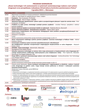 PROGRAM SEMINARIUM „Nowe technologie i ich zastosowanie w systemach automatycznego nadzoru nad ruchem drogowym oraz perspektywy rozbudowy infrastruktury kontrolno-pomiarowej w Polsce” 3 grudnia 2015 r., Warszawa 3 grudnia 2015 r. (czwartek) 09:30 10:00 10:10 10:30 10:50 11:10 11:30 11:50 12:10 12:30 13:20 13:40 14:00 14:20 14:40 15:00 15:20 15:40 16:00 Rejestracja uczestników w recepcji seminarium. Całodzienna przerwa kawowa Adres: ul. Jana Pawła 25, budynek Atrium Tower, 3 piętro Powitanie - Piotr Krukowski, ITS POLSKA Słowo wstępne - Marcin Flieger, CANARD Wyzwania dotyczące egzekwowania poboru opłat za przejazd drogami płatnymi i wjazd do centrów miast - Piotr Krukowski, ITS POLSKA Problemy na styku prawa, technologii i praktyki pomiaru prędkości - Jarosław Teterycz, specjalista z zakresu pomiaru prędkości System rejestracji wjazdu na czerwonym świetle na wybranych - Radosław Borcon, Neurosoft Pomiar odcinkowy prędkości - doświadczenia i przyszłość - Tadeusz Okoń, Sprint Rozproszone, kooperatywne sieci fotoradarów obsługujących wiele punktów początkowych/końcowych tras Marcin Kalisiak, Indra Dyskusja nt. wystąpień Lunch Stoiska wystawowe producentów sprzętu kontrolno-pomiarowego w sali nr 5 Nowe zastosowanie mobilnego systemu pomiaru prędkości. Laserowa technologia w PoliScan Trailer - Michal Zuchora, Vitronic Innowacyjny modułowy system sensorów optoelektronicznych i mikrofalowych dla inteligentnych systemów transportowych zwiększających bezpieczeństwo w ruchu drogowym - Wojciech Górski, Zurad INTEGRA - Nowe technologie - Marek Kulik, Videoradar Wystąpienie firmy Safety Camera Aktualne najnowsze technologie na świecie, które mają zastosowanie w bezpieczeństwie ruchu drogowego jak i samego bezpieczeństwa publicznego wykorzystywane przez dedykowane służby - Piotr Kędzierski, Alexander Wisniewski oraz Bogdan Bogawski, Lifor Stacje WIM w systemach automatycznego nadzoru nad ruchem drogowym - Andrzej Brzeziński, Tein Technology oraz Philippe Delmas, Sterela Dyskusja nt. wystąpień Całodzienna przerwa kawowa Stoiska wystawowe producentów sprzętu kontrolno-pomiarowego w sali nr 5 Otwarty panel dyskusyjny: Ocena rozwiązań technologicznych i organizacyjnych w dziedzinie nadzoru i kontroli ruchu drogowego na polskim rynku. Czego brakuje stronie publicznej w ofertach i realizacjach systemów kontrolno-pomiarowych? Moderator: Łukasz Zboralski, portal BRD24.pl Problematyka: Nowoczesne technologie w urządzeniach kontrolno-pomiarowych i ich wykorzystanie na gruncie polskich przepisów prawna Wizja automatycznego nadzoru nad ruchem drogowym, w świetle zaprezentowanych przez producentów technologii Systemy nie wykorzystywane do tej pory w Polsce takie jak automatyczna kontrola używania pasów bezpieczeństwa, kontrola niestosowania się kierującego do sygnalizacji na przejazdach kolejowych, kontrola, czy automatyczna kontrola przejazdu przez części jezdni wyłączone z ruchu Wykorzystanie w sprawach o wykroczenia zapisów z innych urządzeń mierzących prędkość pojazdu takich jak tachografy lub nadajniki GPS zamontowane w samochodach, a przedstawianych przez osoby obwinionej o popełnienie wykroczenia 16:30 Podsumowanie i zamknięcie seminarium Organizatorzy zastrzegają sobie prawo do zmian w programie Organizator: Partner merytoryczny: Patroni medialni: Partnerzy: www.itspolska.pl