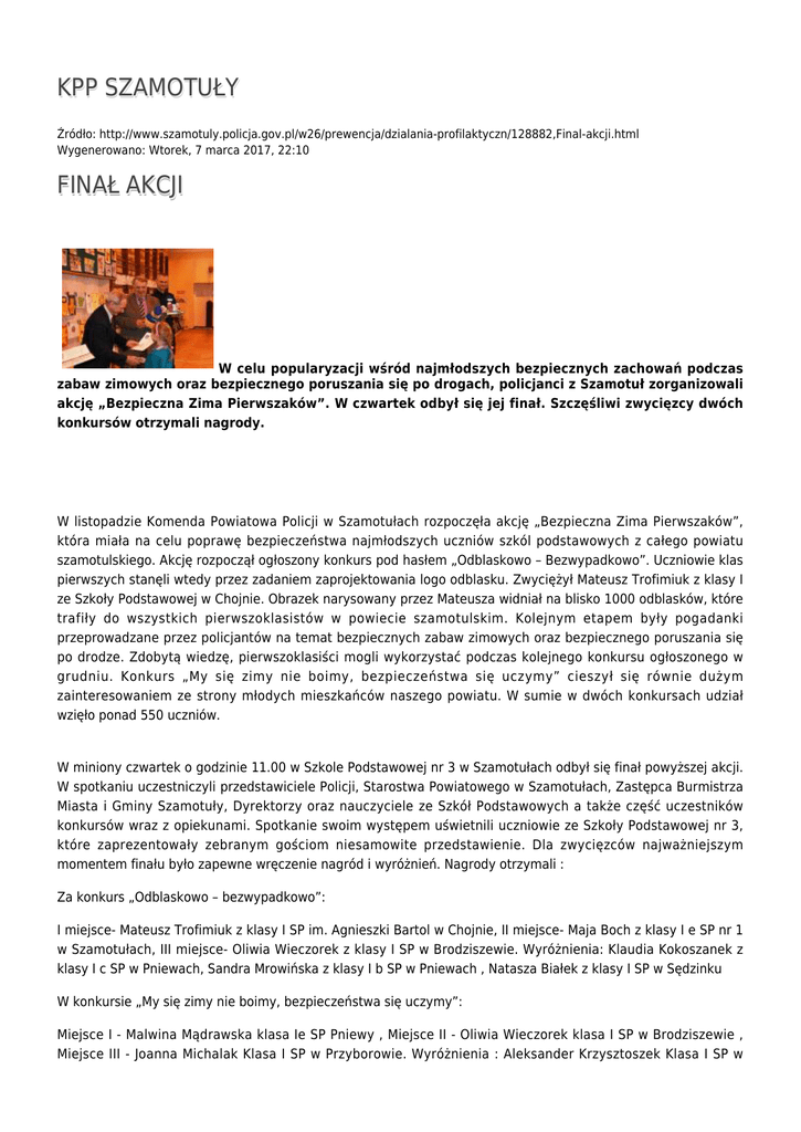 KPP SZAMOTUŁY Źródło: http://www.szamotuly.policja.gov.pl/w26/prewencja/dzialania-profilaktyczn/128882,Final-akcji.html Wygenerowano: Wtorek, 7 marca 2017, 22:10 FINAŁ AKCJI W celu popularyzacji wśród najmłodszych bezpiecznych zachowań podczas zabaw zimowych oraz bezpiecznego poruszania się po drogach, policjanci z Szamotuł zorganizowali akcję „Bezpieczna Zima Pierwszaków”. W czwartek odbył się jej finał. Szczęśliwi zwycięzcy dwóch konkursów otrzymali nagrody. W listopadzie Komenda Powiatowa Policji w Szamotułach rozpoczęła akcję „Bezpieczna Zima Pierwszaków”, która miała na celu poprawę bezpieczeństwa najmłodszych uczniów szkól podstawowych z całego powiatu szamotulskiego. Akcję rozpoczął ogłoszony konkurs pod hasłem „Odblaskowo – Bezwypadkowo”. Uczniowie klas pierwszych stanęli wtedy przez zadaniem zaprojektowania logo odblasku. Zwyciężył Mateusz Trofimiuk z klasy I ze Szkoły Podstawowej w Chojnie. Obrazek narysowany przez Mateusza widniał na blisko 1000 odblasków, które trafiły do wszystkich pierwszoklasistów w powiecie szamotulskim. Kolejnym etapem były pogadanki przeprowadzane przez policjantów na temat bezpiecznych zabaw zimowych oraz bezpiecznego poruszania się po drodze. Zdobytą wiedzę, pierwszoklasiści mogli wykorzystać podczas kolejnego konkursu ogłoszonego w grudniu. Konkurs „My się zimy nie boimy, bezpieczeństwa się uczymy” cieszył się równie dużym zainteresowaniem ze strony młodych mieszkańców naszego powiatu. W sumie w dwóch konkursach udział wzięło ponad 550 uczniów. W miniony czwartek o godzinie 11.00 w Szkole Podstawowej nr 3 w Szamotułach odbył się finał powyższej akcji. W spotkaniu uczestniczyli przedstawiciele Policji, Starostwa Powiatowego w Szamotułach, Zastępca Burmistrza Miasta i Gminy Szamotuły, Dyrektorzy oraz nauczyciele ze Szkół Podstawowych a także część uczestników konkursów wraz z opiekunami. Spotkanie swoim występem uświetnili uczniowie ze Szkoły Podstawowej nr 3, które zaprezentowały zebranym gościom niesamowite przedstawienie. Dla zwycięzców najważniejszym momentem finału było zapewne wręczenie nagród i wyróżnień. Nagrody otrzymali : Za konkurs „Odblaskowo – bezwypadkowo”: I miejsce- Mateusz Trofimiuk z klasy I SP im. Agnieszki Bartol w Chojnie, II miejsce- Maja Boch z klasy I e SP nr 1 w Szamotułach, III miejsce- Oliwia Wieczorek z klasy I SP w Brodziszewie. Wyróżnienia: Klaudia Kokoszanek z klasy I c SP w Pniewach, Sandra Mrowińska z klasy I b SP w Pniewach , Natasza Białek z klasy I SP w Sędzinku W konkursie „My się zimy nie boimy, bezpieczeństwa się uczymy”: Miejsce I - Malwina Mądrawska klasa Ie SP Pniewy , Miejsce II - Oliwia Wieczorek klasa I SP w Brodziszewie , Miejsce III - Joanna Michalak Klasa I SP w Przyborowie. Wyróżnienia : Aleksander Krzysztoszek Klasa I SP w Sędzinku, Sara Zielnik klasa IB SP Pniewy , Kornelia Smoleńska klasa Ie SP Pniewy , Kinga Winiecka Klasa I SP w Kaźmierzu. ZAŁĄCZNIKI DO STRONY 4 KB Ocena: 0/5 (0) Tweetnij