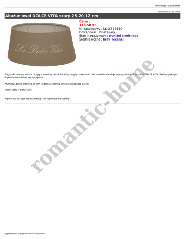 Informacje o produkcie Utworzono 07-03-2017 Abażur owal DOLCE VITA szary 25-20-12 cm Cena : 118,50 zł e Nr katalogowy : LL-3724630 Dostępność : Dostępny Stan magazynowy : poniżej średniego Średnia ocena : brak recenzji m Elegancki owalny abażur uszyty z wysokiej jakości tkaniny, szyty na łączeniu. Na przodzie widnieje wyszyty białą nitką napis DOLCE VITA. Będzie pięknym dopełnieniem dziewczęcej sypialni. ho Wymiary: dolna średnica 25 cm x górna średnica 20 cm x wysokość 12 cm. Kolor: szary / biały napis. ro m an ti c- Piękny abażur jest ozdobą lampy, jak kapelusz dla kobiety. Wygenerowano w programie www.oscGold.com