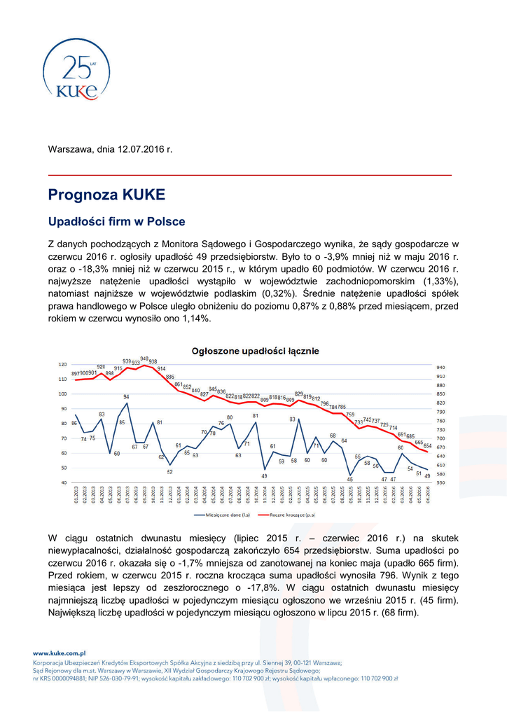 Warszawa, dnia 12.07.2016 r. Prognoza KUKE Upadłości firm w Polsce Z danych pochodzących z Monitora Sądowego i Gospodarczego wynika, że sądy gospodarcze w czerwcu 2016 r. ogłosiły upadłość 49 przedsiębiorstw. Było to o -3,9% mniej niż w maju 2016 r. oraz o -18,3% mniej niż w czerwcu 2015 r., w którym upadło 60 podmiotów. W czerwcu 2016 r. najwyższe natężenie upadłości wystąpiło w województwie zachodniopomorskim (1,33%), natomiast najniższe w województwie podlaskim (0,32%). Średnie natężenie upadłości spółek prawa handlowego w Polsce uległo obniżeniu do poziomu 0,87% z 0,88% przed miesiącem, przed rokiem w czerwcu wynosiło ono 1,14%. W ciągu ostatnich dwunastu miesięcy (lipiec 2015 r. – czerwiec 2016 r.) na skutek niewypłacalności, działalność gospodarczą zakończyło 654 przedsiębiorstw. Suma upadłości po czerwcu 2016 r. okazała się o -1,7% mniejsza od zanotowanej na koniec maja (upadło 665 firm). Przed rokiem, w czerwcu 2015 r. roczna krocząca suma upadłości wynosiła 796. Wynik z tego miesiąca jest lepszy od zeszłorocznego o -17,8%. W ciągu ostatnich dwunastu miesięcy najmniejszą liczbę upadłości w pojedynczym miesiącu ogłoszono we wrześniu 2015 r. (45 firm). Największą liczbę upadłości w pojedynczym miesiącu ogłoszono w lipcu 2015 r. (68 firm). Prognoza na rok 2016 Rok 2016 przyniósł wprowadzenie w życie prawa restrukturyzacyjnego oraz znowelizowanych przepisów prawa upadłościowego, w wyniku których wprowadzenie sanacji przedsiębiorstwa ma pierwszeństwo. Spowodowało to zachwianie dotychczasowych statystyk, co przekłada się na zmniejszenie ilości upadłości. Jeśli dodać do tego podmioty podlegające restrukturyzacji ilościowo - może okazać się, iż suma podmiotów zbankrutowanych i restrukturyzowanych może okazać się większa niż samych tylko podmiotów, które ogłosiły upadłość w zeszłym roku pod przepisami poprzedniego prawa upadłościowego. Aktualnie więc pozostaje wciąż sprawą otwartą na jakim poziomie ustabilizuje się liczba podmiotów zbankrutowanych oraz tych, które zostaną poddane sanacji. W przypadku zachowania trendów z początku obecnego roku liczba samych upadłości może ulec wyraźnemu obniżeniu do poziomu poniżej 600 podmiotów. Na początku czerwca Główny Urząd Statystyczny ogłosił dane o rachunkach narodowych za pierwszy kwartał 2016 roku. W ujęciu niewyrównanych sezonowo dynamik rocznych produkt krajowy brutto okazał się o 3,0% wyższy niż w analogicznym okresie roku poprzedniego, podczas gdy wzrost w kwartale czwartym ubiegłego roku wynosił 4,3% (dane po korekcie). Dane okazały się zgodne z wcześniejszymi danymi przyspieszonymi. Jednocześnie okazując się gorsze od wcześniejszych prognoz wskazały na chwilowe osłabienie koniunktury w naszej gospodarce. W przypadku spożycia ogółem zanotowane zostało spowolnienie tempa wzrostu z 4,5% w ostatnim kwartale zeszłego roku do 3,4%. Warto zauważyć, że w spożyciu indywidualnym tempo wzrostu przyspieszyło z 3,0% w IV kw. 2015r. do 3,2% obecnie (i wobec 3,1% w pierwszym kwartale 2015r.). Przyzwoity wzrost w ujęciu realnym jest efektem złożenia umiarkowanych wzrostów płac w ujęciu nominalnym i wciąż mającej miejsce deflacji, ale również rosnącego zatrudnienia istotnie zwiększającego fundusz płac. Dynamika spożycia publicznego w pierwszym kwartale 2016r. wyniosła 4,4%, w porównaniu do 8,7% w IV kwartale 2016r. i 1,8% w analogicznym okresie roku poprzedniego. Szczególnie ciekawie prezentowały się dane dotyczące akumulacji – czyli złożenia inwestycji i zmiany stanu zapasów. Wynik łączny akumulacji w I kwartale wyniósł 8,1% - zdecydowanie wyżej niż 4,5% w kwartale czwartym i 3,4% w analogicznym okresie roku ubiegłego. W przypadku inwestycji w I kwartale roku 2016r. zanotowano spadek sięgający 1,8%, podczas gdy w poprzednim kwartale odnotowano wzrost na poziomie 4,4%, a w I kwartale 2015r. wzrost o 11,8%. W świetle danych o szybko rozwijających się inwestycjach dużych firm, a także kolejnych inwestycji w mieszkalnictwie wydaje się, że głównym „winowajcą” obniżenia tempa wzrostu całości inwestycji jest ograniczenie w inwestycjach infrastrukturalnych. W pierwszym kwartale wzrost gospodarczy okazał się gorszy zarówno od zanotowanego w kwartale poprzednim, jak i od analogicznego kwartału roku ubiegłego. Nie powinno nikogo zaskakiwać, że był on równocześnie gorszy od wcześniej prognozowanego (przed opublikowaniem szybkiego szacunku). W następnych kwartałach powinniśmy mieć już do czynienia ze sporym ożywieniem, związanym m.in. z uruchomieniem środków z nowej unijnej perspektywy (co pobudzi inwestycje infrastrukturalne) oraz rządowym programem 500+, który znacznie wpłynie na możliwości nabywcze konsumentów. Kwestia Brexitu najprawdopodobniej nie dotknie naszej gospodarki w sposób znaczący. Po pierwszej panicznej reakcji rynki finansowe uspokoiły się. Aczkolwiek wciąż może grozić Wielkiej Brytanii odpływ kapitału oraz dalsze wstrząsy na rynkach np.: nieruchomości, które uległy przecenie. Na wynegocjowanie warunków wyjścia z Unii Wielka Brytania będzie miała dwa lata. Tak naprawdę kwestia wyjścia z Unii Wielkiej Brytanii jest wciąż otwarta. Możliwe jest, że ostatnie referendum spowoduje zimny prysznic dla wszystkich zainteresowanych stron, co spowoduje, iż w wyniku negocjacji sama Unia ulegnie transformacji, a co za tym idzie Wielka Brytania pozostanie we wspólnocie (np. zostanie powtórzone referendum po zmianie warunków członkostwa). Możliwym jest również scenariusz, iż status Wielkiej Brytanii będzie zbliżony do tego jaki ma obecnie w Unii Norwegia. W Unii Europejskiej istnieje wciąż niestety potencjał do kolejnych turbulencji gospodarczych. Na horyzoncie widnieje ewentualny kryzys związany ze złą kondycją włoskiego sektora bankowego, który może uruchomić lawinę w strefi
