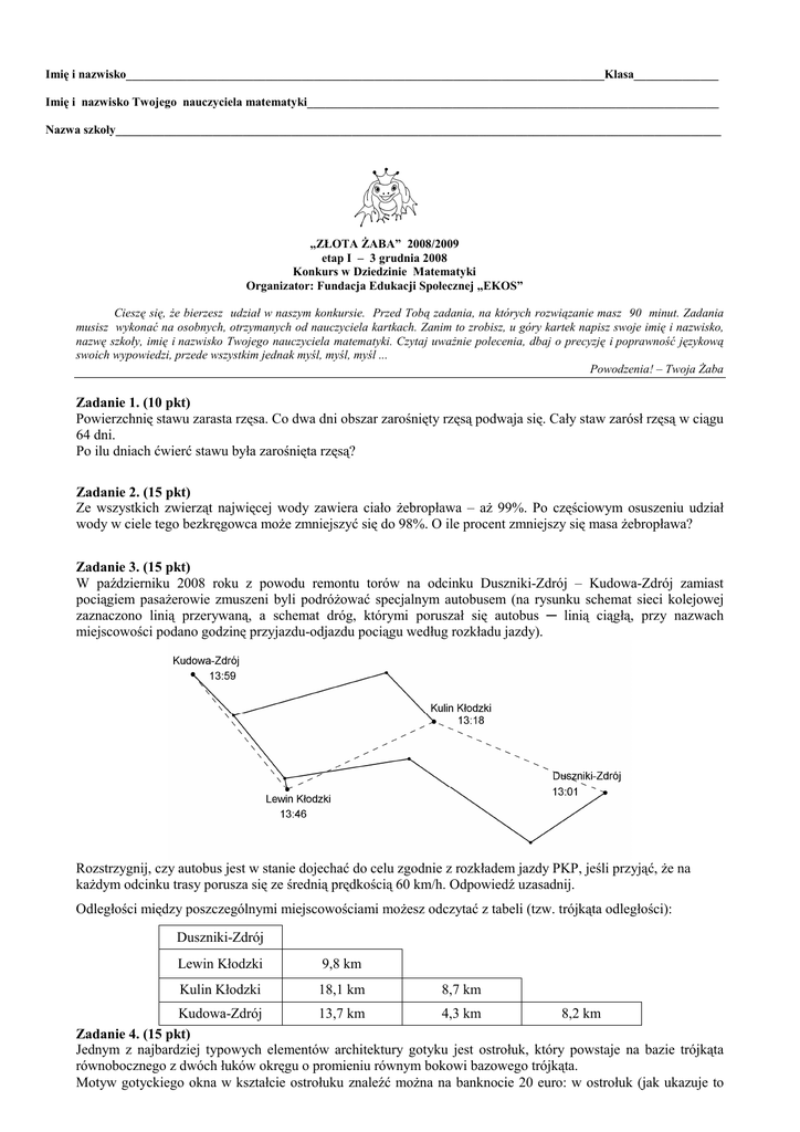 Imię i nazwisko_______________________________________________________________________________Klasa______________ Imię i nazwisko Twojego nauczyciela matematyki____________________________________________________________________ Nazwa szkoły____________________________________________________________________________________________________ „ZŁOTA śABA” 2008/2009 etap I – 3 grudnia 2008 Konkurs w Dziedzinie Matematyki Organizator: Fundacja Edukacji Społecznej „EKOS” Cieszę się, Ŝe bierzesz udział w naszym konkursie. Przed Tobą zadania, na których rozwiązanie masz 90 minut. Zadania musisz wykonać na osobnych, otrzymanych od nauczyciela kartkach. Zanim to zrobisz, u góry kartek napisz swoje imię i nazwisko, nazwę szkoły, imię i nazwisko Twojego nauczyciela matematyki. Czytaj uwaŜnie polecenia, dbaj o precyzję i poprawność językową swoich wypowiedzi, przede wszystkim jednak myśl, myśl, myśl ... Powodzenia! – Twoja śaba Zadanie 1. (10 pkt) Powierzchnię stawu zarasta rzęsa. Co dwa dni obszar zarośnięty rzęsą podwaja się. Cały staw zarósł rzęsą w ciągu 64 dni. Po ilu dniach ćwierć stawu była zarośnięta rzęsą? Zadanie 2. (15 pkt) Ze wszystkich zwierząt najwięcej wody zawiera ciało Ŝebropława – aŜ 99%. Po częściowym osuszeniu udział wody w ciele tego bezkręgowca moŜe zmniejszyć się do 98%. O ile procent zmniejszy się masa Ŝebropława? Zadanie 3. (15 pkt) W październiku 2008 roku z powodu remontu torów na odcinku Duszniki-Zdrój – Kudowa-Zdrój zamiast pociągiem pasaŜerowie zmuszeni byli podróŜować specjalnym autobusem (na rysunku schemat sieci kolejowej zaznaczono linią przerywaną, a schemat dróg, którymi poruszał się autobus ─ linią ciągłą, przy nazwach miejscowości podano godzinę przyjazdu-odjazdu pociągu według rozkładu jazdy). Rozstrzygnij, czy autobus jest w stanie dojechać do celu zgodnie z rozkładem jazdy PKP, jeśli przyjąć, Ŝe na kaŜdym odcinku trasy porusza się ze średnią prędkością 60 km/h. Odpowiedź uzasadnij. Odległości między poszczególnymi miejscowościami moŜesz odczytać z tabeli (tzw. trójkąta odległości): Duszniki-Zdrój Lewin Kłodzki 9,8 km Kulin Kłodzki 18,1 km 8,7 km Kudowa-Zdrój 13,7 km 4,3 km 8,2 km Zadanie 4. (15 pkt) Jednym z najbardziej typowych elementów architektury gotyku jest ostrołuk, który powstaje na bazie trójkąta równobocznego z dwóch łuków okręgu o promieniu równym bokowi bazowego trójkąta. Motyw gotyckiego okna w kształcie ostrołuku znaleźć moŜna na banknocie 20 euro: w ostrołuk (jak ukazuje to rysunek) wpisane są dwa mniejsze ostrołuki i okrąg styczny do czterech łuków (dwóch duŜych łuków oraz dwóch łuków o dwa razy mniejszych promieniach). Wyznacz stosunek długości promienia tego okręgu do długości promienia duŜego łuku. Zadanie 5. (15 pkt) Przyjmijmy, Ŝe drzewo wypuszcza co roku nowe pędy, a kaŜda nowa gałąź wypuszcza nowy pęd dopiero po dwóch latach (jak na rysunku). Ile gałęzi będzie miało drzewo po 10 latach? Zadanie 6. (15 pkt) Dwóch harcerzy obrało w sumie 400 ziemniaków. Jeden z nich obierał średnio 3 ziemniaki na minutę, a drugi – 2, za to robił to o 25 minut dłuŜej. Ile czasu kaŜdy z nich obierał ziemniaki? Ile ziemniaków obrał kaŜdy z harcerzy? Zadanie 7. (15 pkt) Dany jest sześcian ABCDEFGH o krawędzi 1. J jest środkiem krawędzi BC tego sześcianu. Oblicz pole trójkąta AJH.