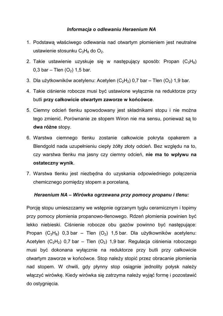 Informacja o odlewaniu Heraenium NA 1. Podstawą właściwego odlewania nad otwartym płomieniem jest neutralne ustawienie stosunku C3H8 do O2. 2. Takie ustawienie uzyskuje się w następujący sposób: Propan (C3H8) 0,3 bar – Tlen (O2) 1,5 bar. 3. Dla uŜytkowników acetylenu: Acetylen (C2H2) 0,7 bar – Tlen (O2) 1,9 bar. 4. Takie ciśnienie robocze musi być ustawione wyłącznie na reduktorze przy butli przy całkowicie otwartym zaworze w końcówce. 5. Ciemny odcień tlenku spowodowany jest składnikami stopu i nie moŜna tego zmienić. Porównanie ze stopem Wiron nie ma sensu, poniewaŜ są to dwa róŜne stopy. 6. Warstwa ciemnego tlenku zostanie całkowicie pokryta opakerem a Blendgold nada uzupełnieniu ciepły Ŝółty złoty odcień. Bez względu na to, czy warstwa tlenku ma jasny czy ciemny odcień, nie ma to wpływu na ostateczny wynik. 7. Warstwa tlenku jest niezbędna do uzyskania odpowiedniego połączenia chemicznego pomiędzy stopem a porcelaną. Heraenium NA – Wirówka ogrzewana przy pomocy propanu i tlenu: Porcję stopu umieszczamy we wstępnie ogrzanym tyglu ceramicznym i topimy przy pomocy płomienia propanowo-tlenowego. Rdzeń płomienia powinien być lekko niebieski. Ciśnienie robocze obu gazów powinno być następujące: Propan (C3H8) 0,3 bar – Tlen (O2) 1,5 bar. Dla uŜytkowników acetylenu: Acetylen (C2H2) 0,7 bar – Tlen (O2) 1,9 bar. Regulacja ciśnienia roboczego musi być dokonana wyłącznie na reduktorze przy butli przy całkowicie otwartym zaworze w końcówce. Stop naleŜy stopić przez obracanie płomienia nad stopem. W chwili, gdy płynny stop osiągnie jednolity połysk naleŜy włączyć wirówkę. Kiedy wirówka się zatrzyma naleŜy wyjąć formę i pozostawić do ostygnięcia. Instrukcja robocza do pierścienia stalowego i stoŜkowego formierza Heraeus Właściwe ustawienie odlewanego obiektu moŜe być sprawdzone przy uŜyciu narzędzia do wlewania Heraeus.Okładzina ceramicznego pierścienia odlewniczego Heraeus StoŜkowy formierz Heraeus, prawidłowo Prawidłowe ustawienie obiektów, wystarczająca ilość masy ogniotrwałej Masa ogniotrwała musi dochodzić do okładziny, okładzina równo z pierścieniem odlewniczym Masa ogniotrwała Tu masa ogniotrwała styka się z pierścieniem stalowym, prawidłowo