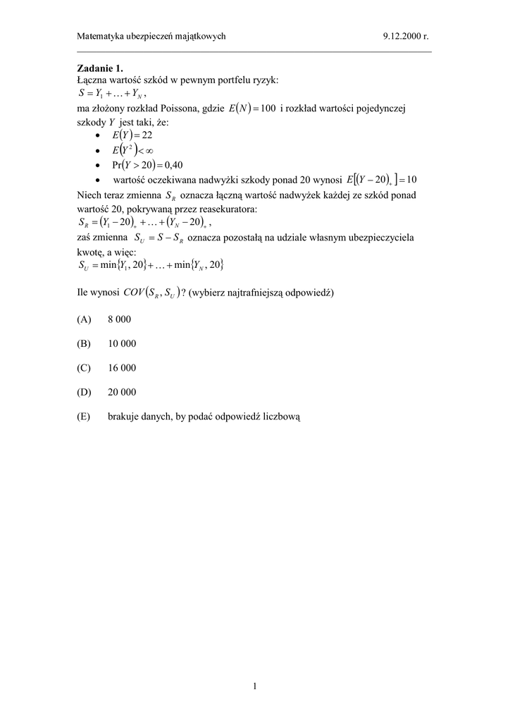 9.12.2000 r. ___________________________________________________________________________ Zadanie 1. S Y1 YN , Poissona, gdzie E N 100 szkody Y E Y 22 E Y 2 Pr Y 20 0,40 E Y 20 10 Niech teraz zmienna S R S R Y1 20 YN 20 , z SU S S R ! "" SU minY1 , 20 minYN , 20 Ile wynosi COV S R , SU #$! %& (A) 8 000 (B) 10 000 (C) 16 000 (D) 20 000 (E) brak'!%! 1 9.12.2000 r. ___________________________________________________________________________ Zadanie 2. X Y1 YN $ N 0 ). ( zmienna X( z E N 40 E Y e . 3 ) !' Gamma o parametrach 2, 10 *+" f 10 2 e 10 . , $!&X wynosi: (A) 2,00 (B) 2,06 (C) 2,13 (D) 2,20 (E) 2,27 2 9.12.2000 r. ___________________________________________________________________________ Zadanie 3. -N pewnego ryzyka ma r( ' Y1 , Y2 , , YN N. . 0, 1 0, 1 . /! "!0 1 2" !" $ &" Y1 Y1 $ &" Y2 1 Y1 Y2 $ &" Y3 1 Y1 1 Y1 Y2 Y3 , co równe jest 1 Y1 1 Y2 Y3 $ &" Y4 1 Y1 1 Y1 Y2 1 Y1 1 Y2 Y3 Y4 , c" 1 Y1 1 Y2 1 Y3 Y4 , itd. 3 ! (A) 1 e (B) 1 e (C) 1 e (D) 1 e 1 1 (E) e 1 e 1 1 3 9.12.2000 r. ___________________________________________________________________________ Zadanie 4. Pewne ryzyko gener' ' ' X 1 , X 2 , X 3 X 4 . Zmienne losowe X i */! ceduje +!+ ! $!+'&*4 !$!+' &? (A) 19/48 (B) 21/48 (C) 23/48 (D) 25/48 (E) 27/48 4 9.12.2000 r. ___________________________________________________________________________ Zadanie 5. X Y1 YN $ N 0 ). X( N E N ln 1 13 Y+ 1 ck Pr Y k k 1, 2, , ln 1 c k z parametrem c 0.25 )% !"k 1 Pr X k Pr X k 1000 (A) k 3 (B) k 4 (C) k 5 (D) k 6 (E) k 7 5 9.12.2000 r. ___________________________________________________________________________ Zadanie 6. -+( *, Yi o tym samym + !*, ! " +"+ + + '! x0 !" x0 + "$ &+!+"'* (n- + tej decyzji nie n 1 -$+ &* Oznaczmy dla uproszczenia przez F !5 przekroczy liczby x0 . (!5 !+"$+& wynosi: (A) e 1 F (B) e 1 F 1 F (C) e 1 F (D) e 1 F 1 F 1 12 F (E) e 1 F 1 F 1 e F F 1 F 1 e F F e F F2 6 9.12.2000 r. ___________________________________________________________________________ Zadanie 7. .! U t u c t S t , gdzie: N t S t Yi , i 1 Y1 , Y2 , '- ' '' ! F ( " . Oznaczmy przez !5 Pr T , gdzie T T inf t : t 0, U t 0. Rozwa " Wariant 1 Wariant 2 c 2 12 4 8 u 2 6 Relacja dystrybuanty F2 do dystrybuanty F1 jest postaci: 1 x R F2 x F1 x 3 60 , E T T , E U T T 0.2, 6, 2. Wobec tego, w wariancie 2 procesu trójka , wyniesie: (A) 0.2, 3, 6 (B) 0.2, 6, 6 (C) 0.5, 3, 2 (D) 0.5, 2, 4 (E) 0.5, 2, 6 7 E T T , F F1 F2 E U T T 9.12.2000 r. ___________________________________________________________________________ Zadanie 8. 7 t " k 1 1 1 2 t + k!5 . 4 4 3 , 0*,'t, t+1 i t8 99: :;*, t8 t <:* !5 (A) 79 (B) 81 (C) 83 (D) 85 $=&!' t- + 8 9.12.2000 r. ___________________________________________________________________________ Zadanie 9. .! U t u c t S t , gdzie: N t S t Yi , i 1 Y1 , Y2 , '- ( " . c 1 oraz 1 $0 " 0&* Niech 0 a u . Niech mint 0 : U t a, gdy Ta gdy t 0 : U t a ; t 0 : U t a , mint 0 : U t 0, gdy T0 gdy t 0 : U t 0 ; t 0 : U t 0 . 6! Pr Ta T0 T0 . (A) exp a (B) exp a / 1 (C) exp a (D) exp a / u a (E) exp u 9 9.12.2000 r. ___________________________________________________________________________ Zadanie 10. Liczby szkód N1 ,...N t , N t 1 ' ' ( . Niech N N1 ... N t . Parametr ++" 1 e , 0 . ! 6! VARN t 1 N1 ,..., N t . (A) N t 2 (B) N t (C) 2 (D) N N t t 2 (E) N t 2 10 9.12.2000 r. ___________________________________________________________________________ Egzamin dla Aktuariuszy z 9 grudnia 2000 r. Arkusz odpowiedzi* -".................... K L U C Z O D P O W I E D Z I .................................. Pesel ........................................... Zadanie nr 1 2 3 4 5 6 7 8 9 10 * 6% D A A D B C A C A D Punktacja Arkuszu odpowiedzi. 11