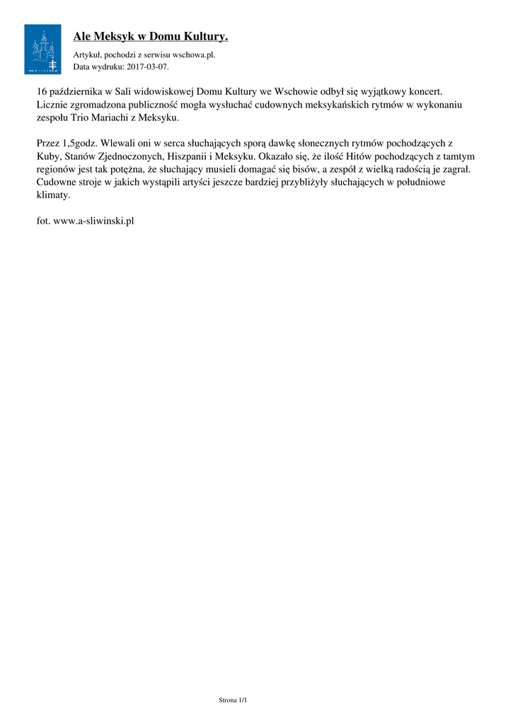 Ale Meksyk w Domu Kultury. Artykuł‚ pochodzi z serwisu wschowa.pl. Data wydruku: 2017-03-07. 16 października w Sali widowiskowej Domu Kultury we Wschowie odbył się wyjątkowy koncert. Licznie zgromadzona publiczność mogła wysłuchać cudownych meksykańskich rytmów w wykonaniu zespołu Trio Mariachi z Meksyku. Przez 1,5godz. Wlewali oni w serca słuchających sporą dawkę słonecznych rytmów pochodzących z Kuby, Stanów Zjednoczonych, Hiszpanii i Meksyku. Okazało się, że ilość Hitów pochodzących z tamtym regionów jest tak potężna, że słuchający musieli domagać się bisów, a zespół z wielką radością je zagrał. Cudowne stroje w jakich wystąpili artyści jeszcze bardziej przybliżyły słuchających w południowe klimaty. fot. www.a-sliwinski.pl Strona 1/1 Powered by TCPDF (www.tcpdf.org)