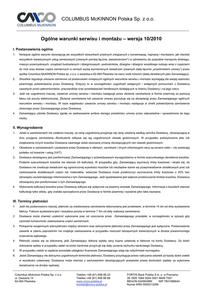 COLUMBUS McKINNON Polska Sp. z o.o. Ogólne warunki serwisu i